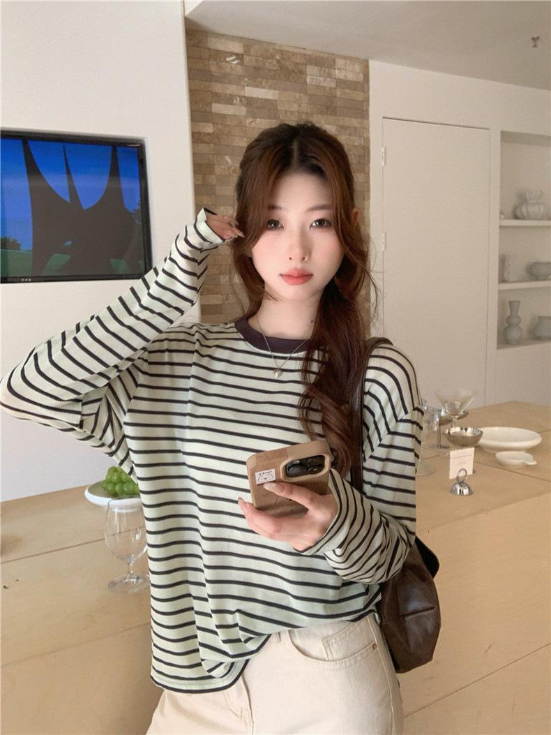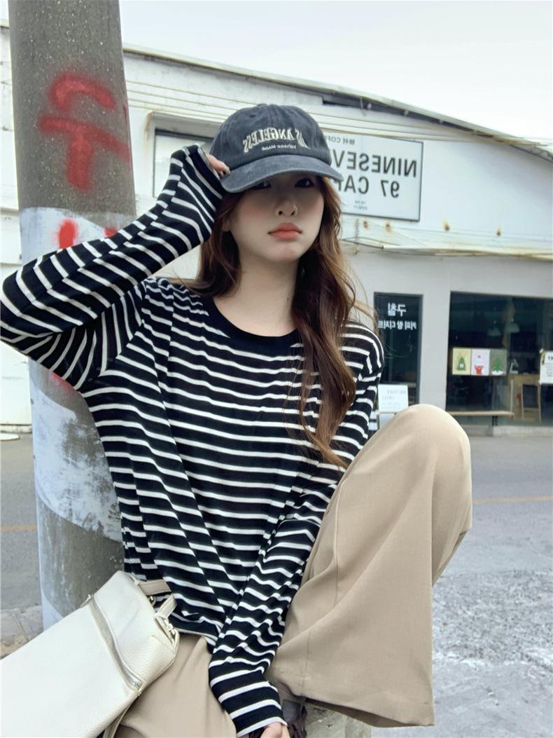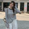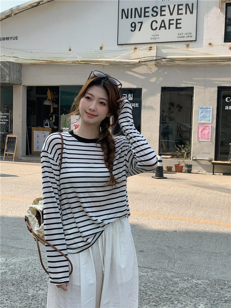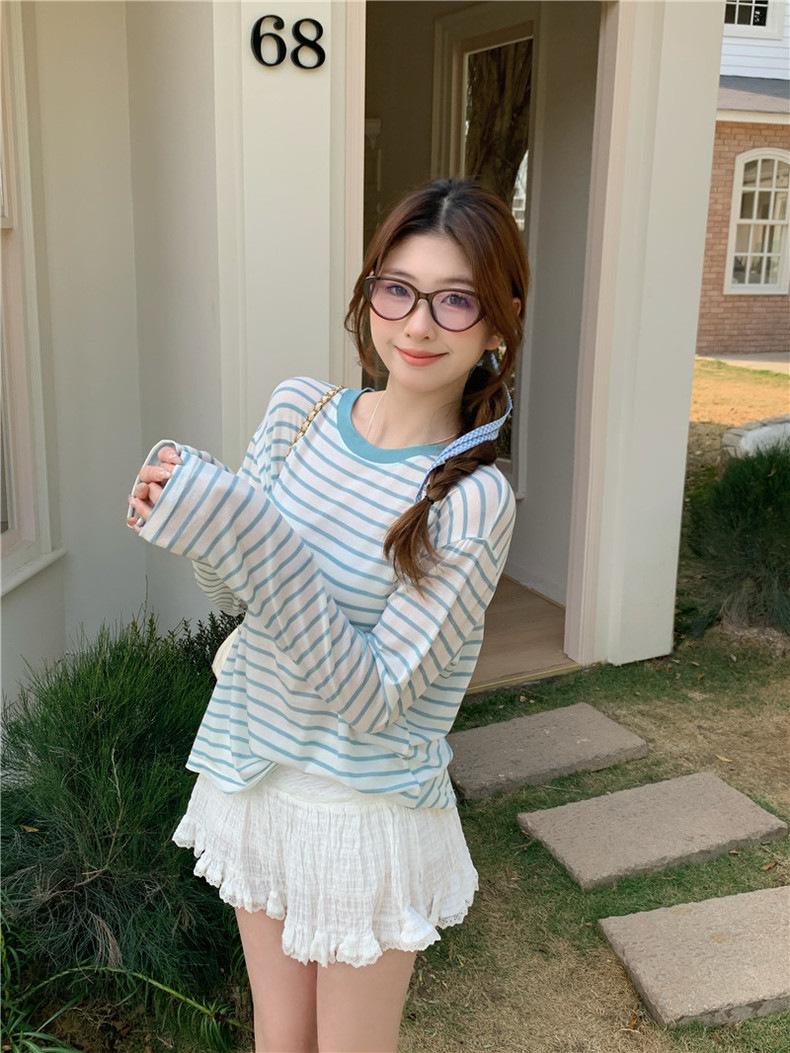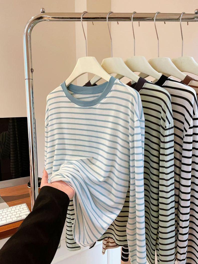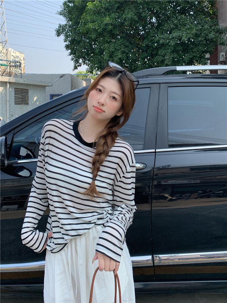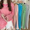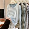 Camiseta de seda de hielo a rayas con protección solar, primavera y verano 2025, nueva blusa fina, holgada, adelgazante, de manga larga y cuello redondo para mujer