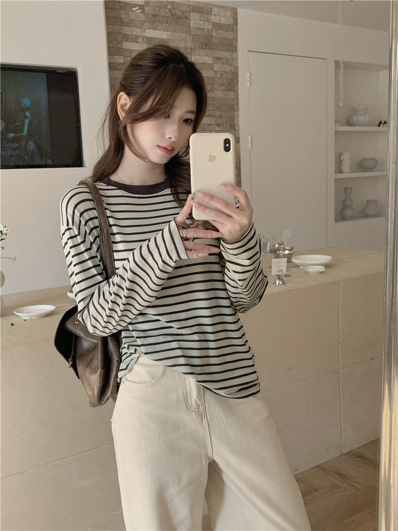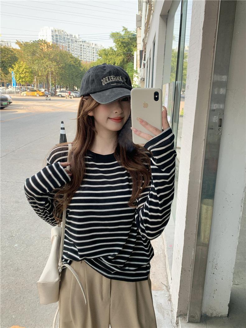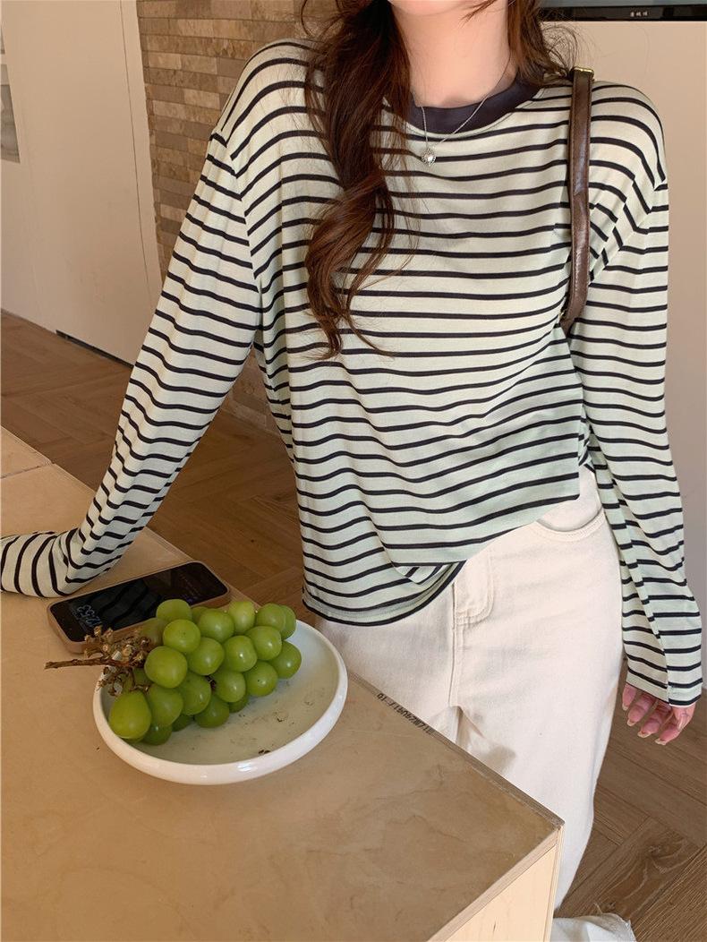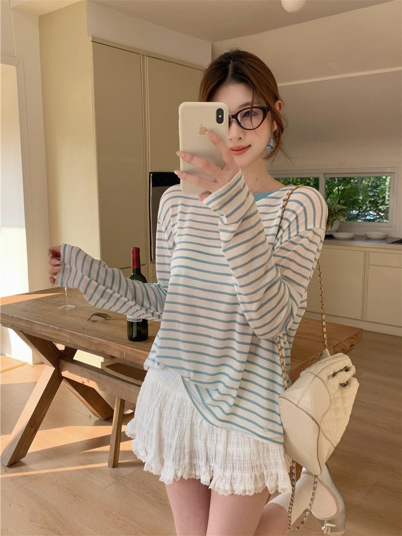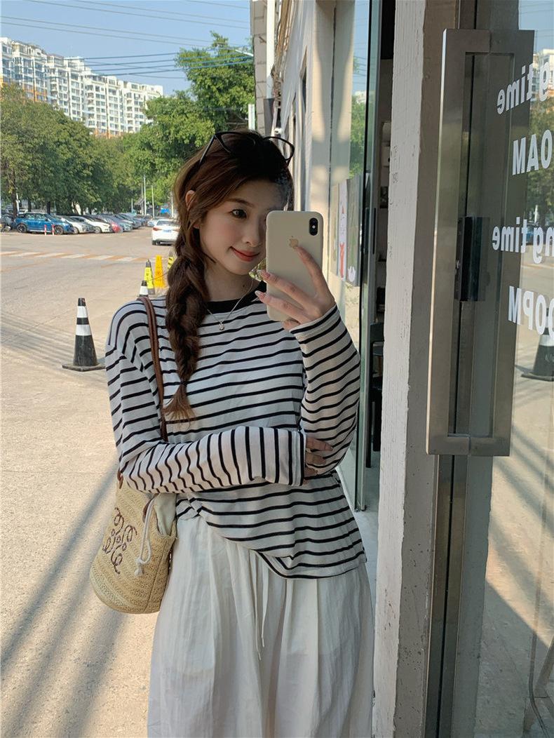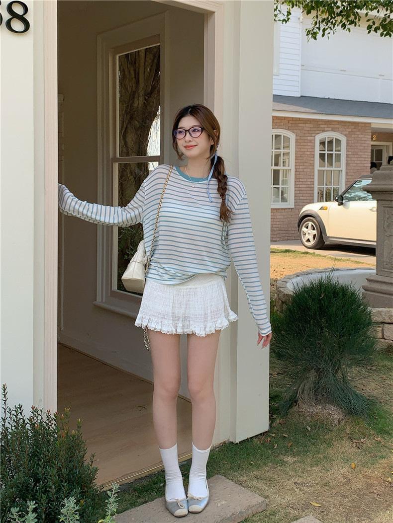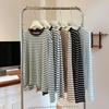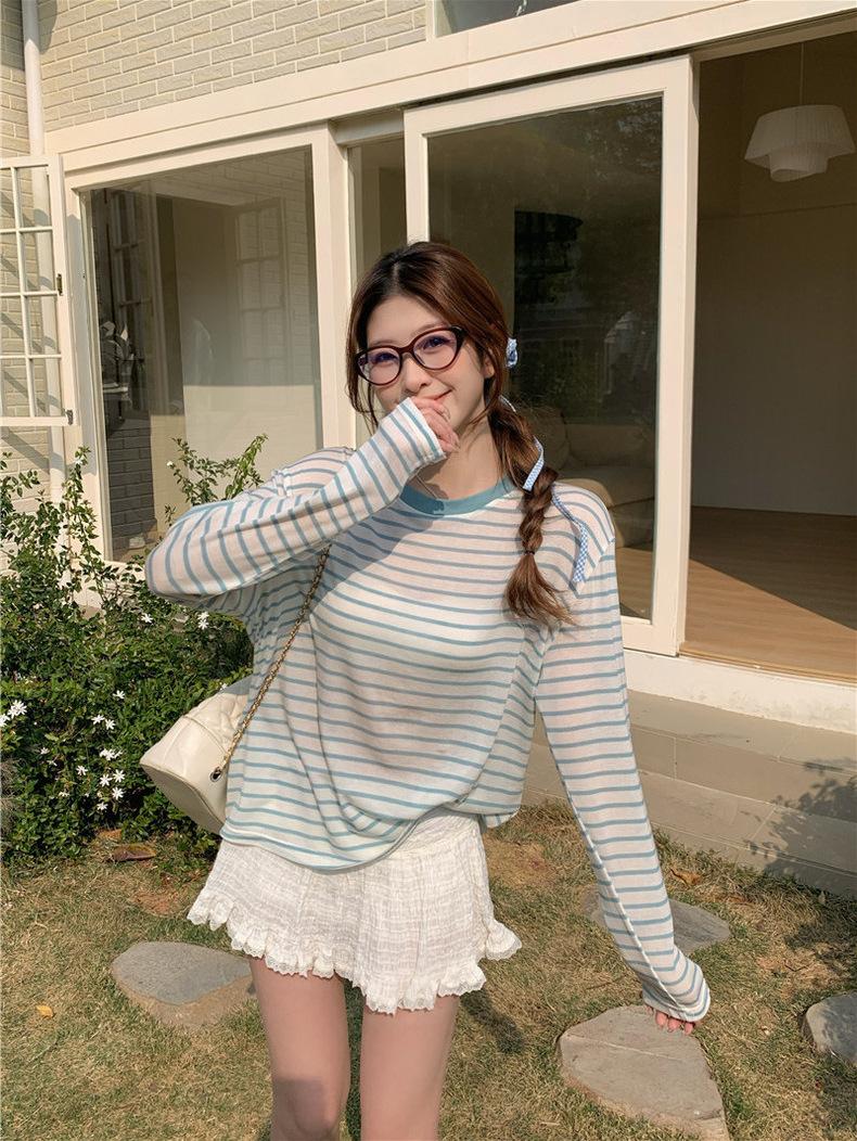 Camiseta de seda de hielo a rayas con protección solar, primavera y verano 2025, nueva blusa fina, holgada, adelgazante, de manga larga y cuello redondo para mujer