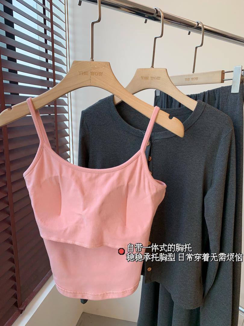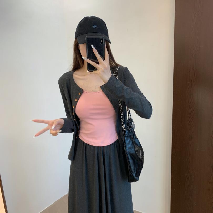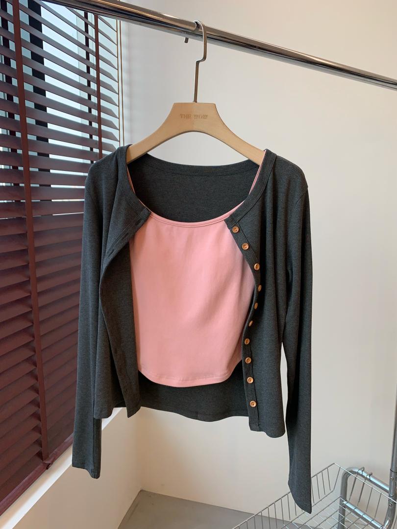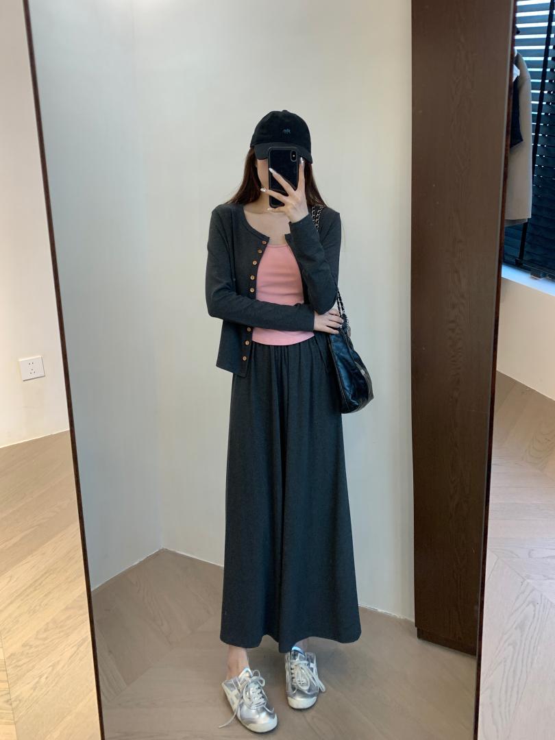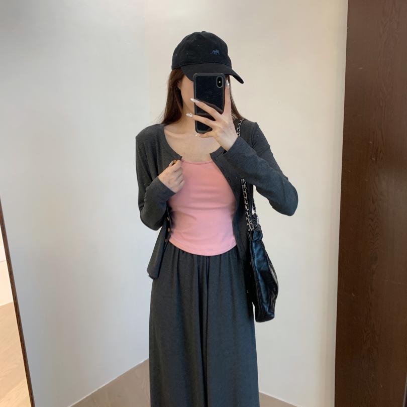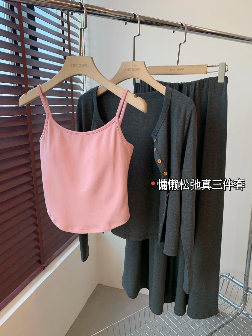 Un traje de tres piezas con un sentido único de relajación. Se siente suave y cómodo. La hermosa combinación de tirantes y cárdigan,