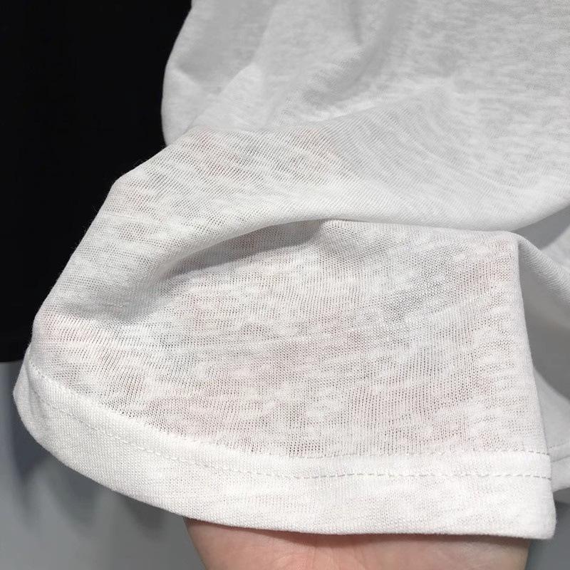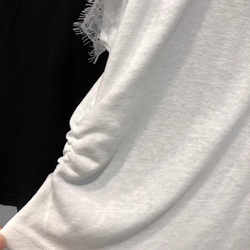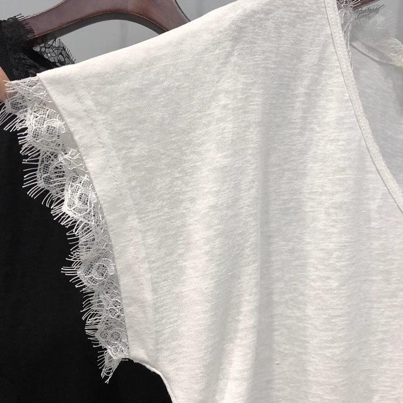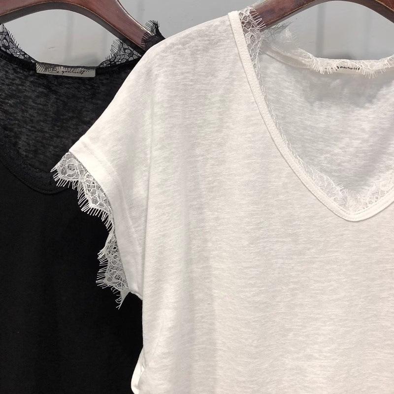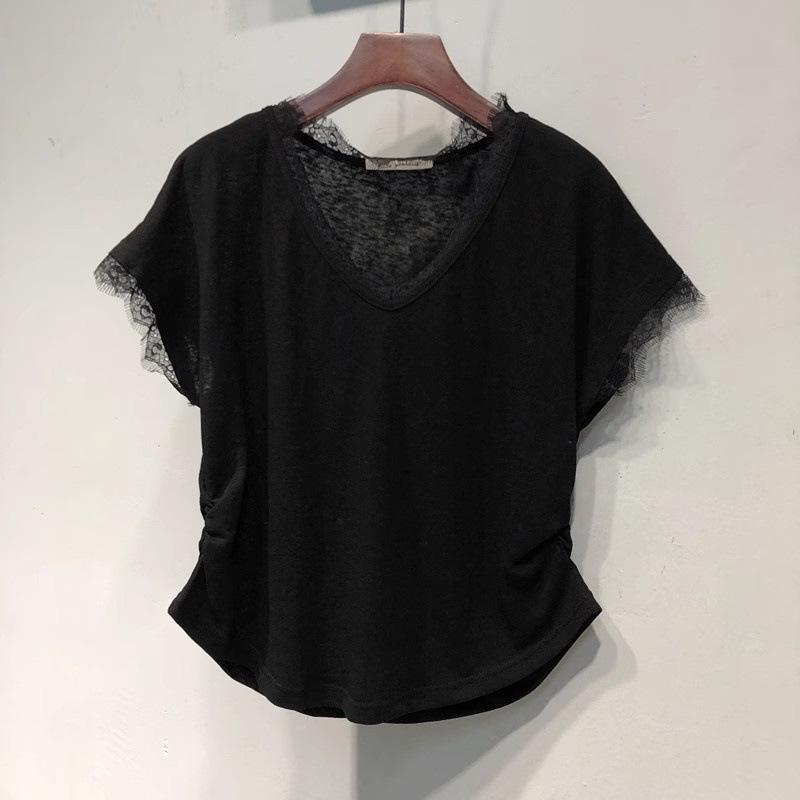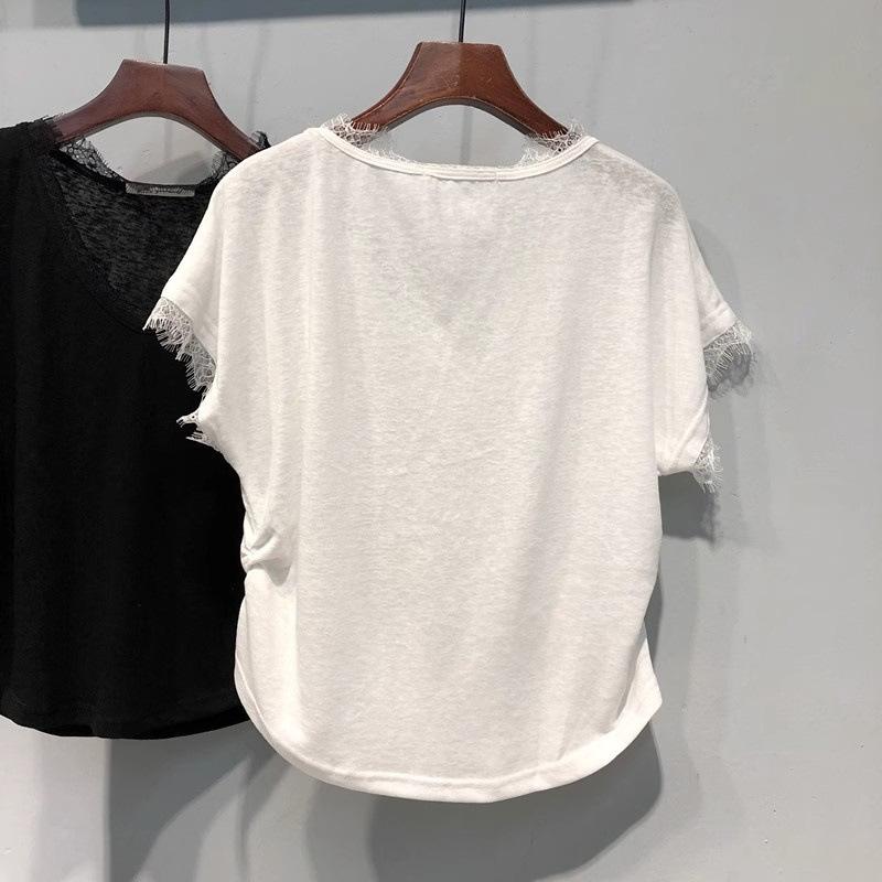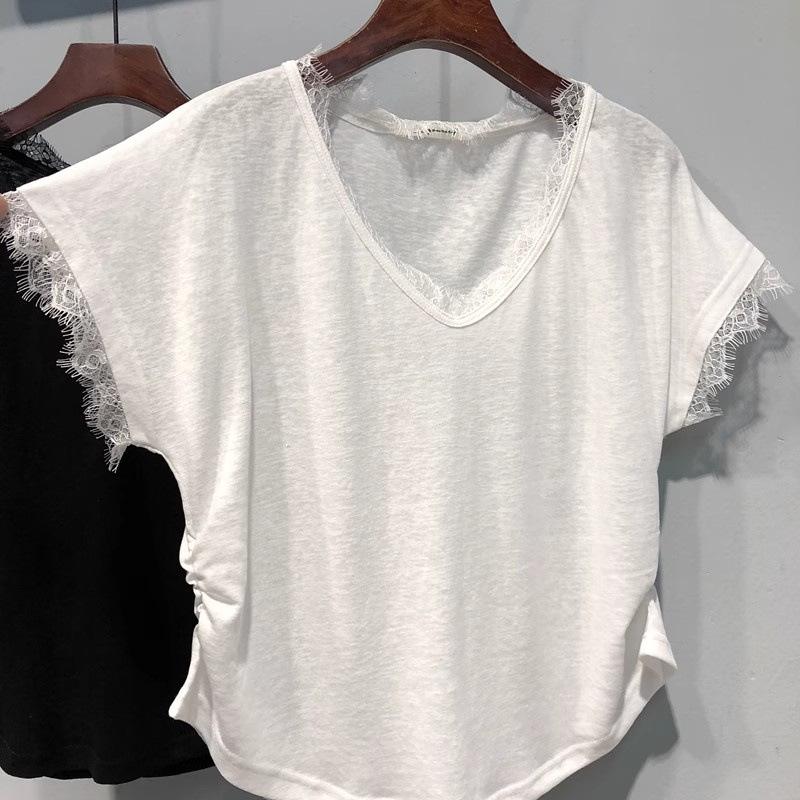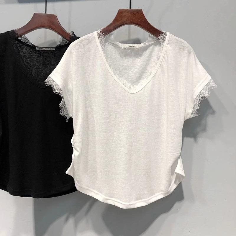 Camiseta de manga corta con cuello en V y encaje estilo americano para mujer, verano 2025, nueva camiseta holgada de media manga en color liso estilo coreano.