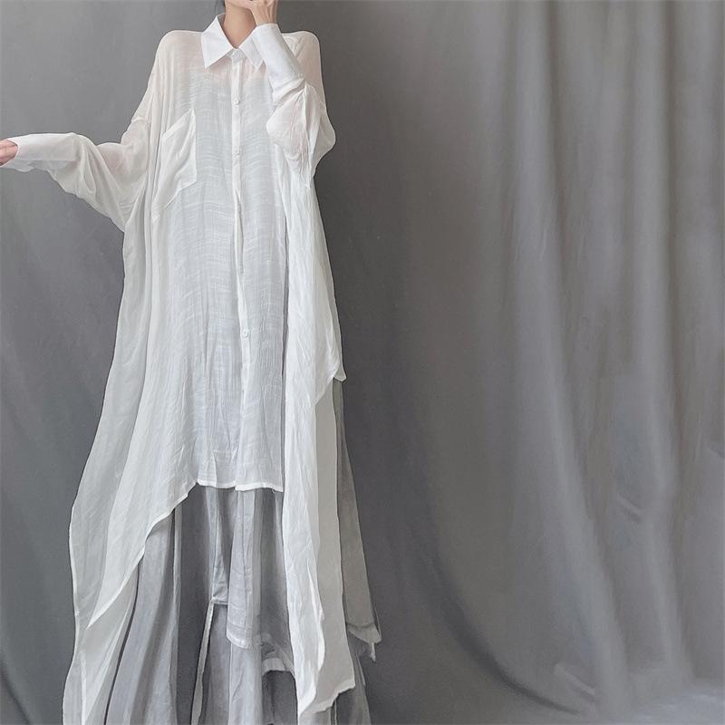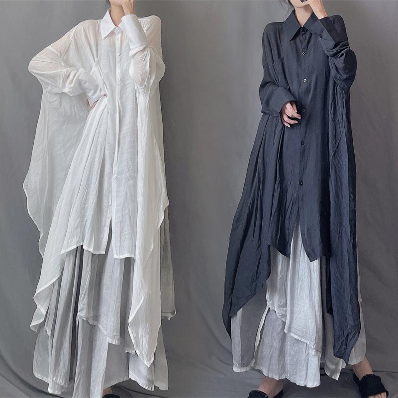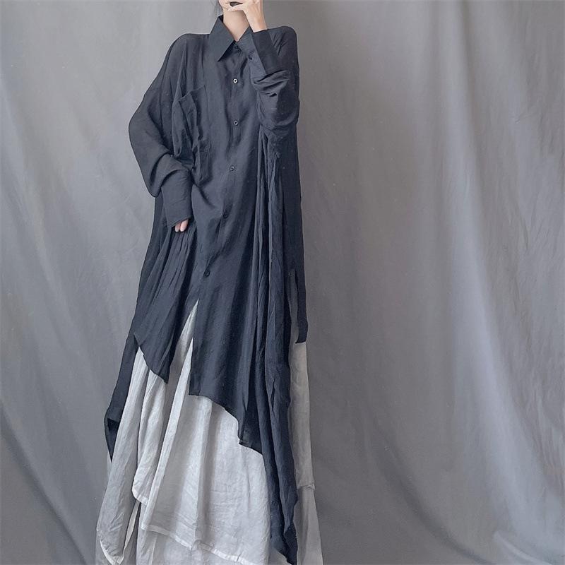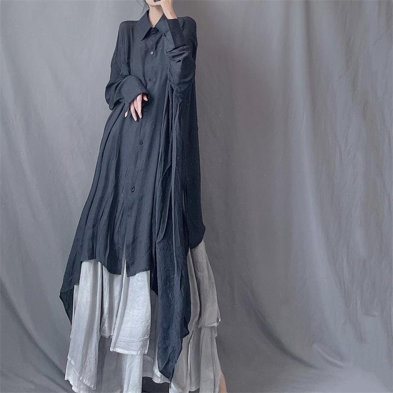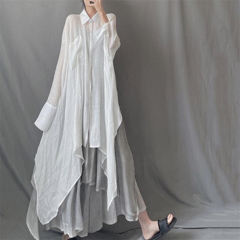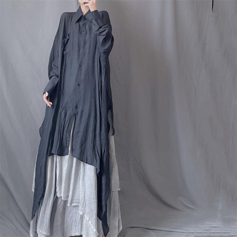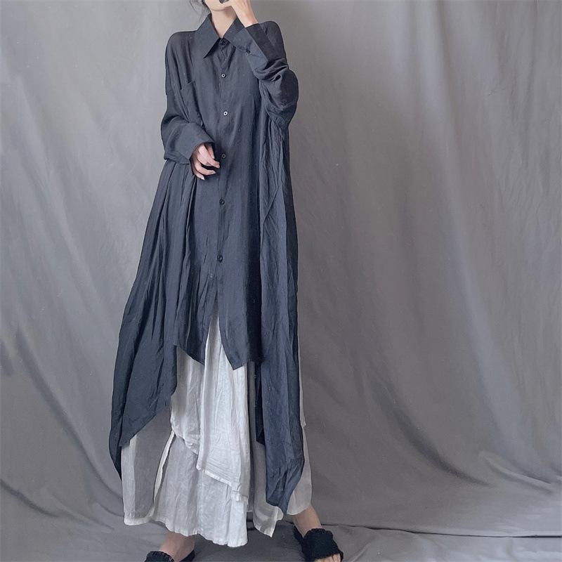 Camisa minimalista de calidad original con dobladillo irregular elegante de hilo Tencel, solapa de largo medio, protección solar, suelta y artística.