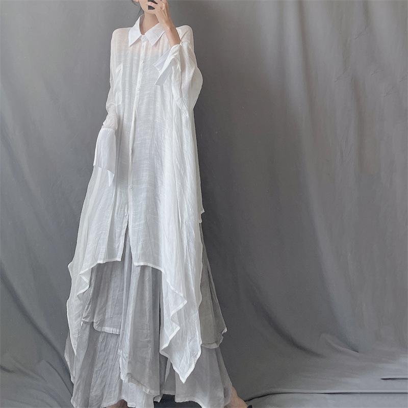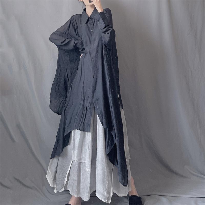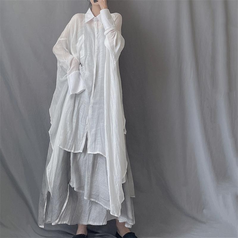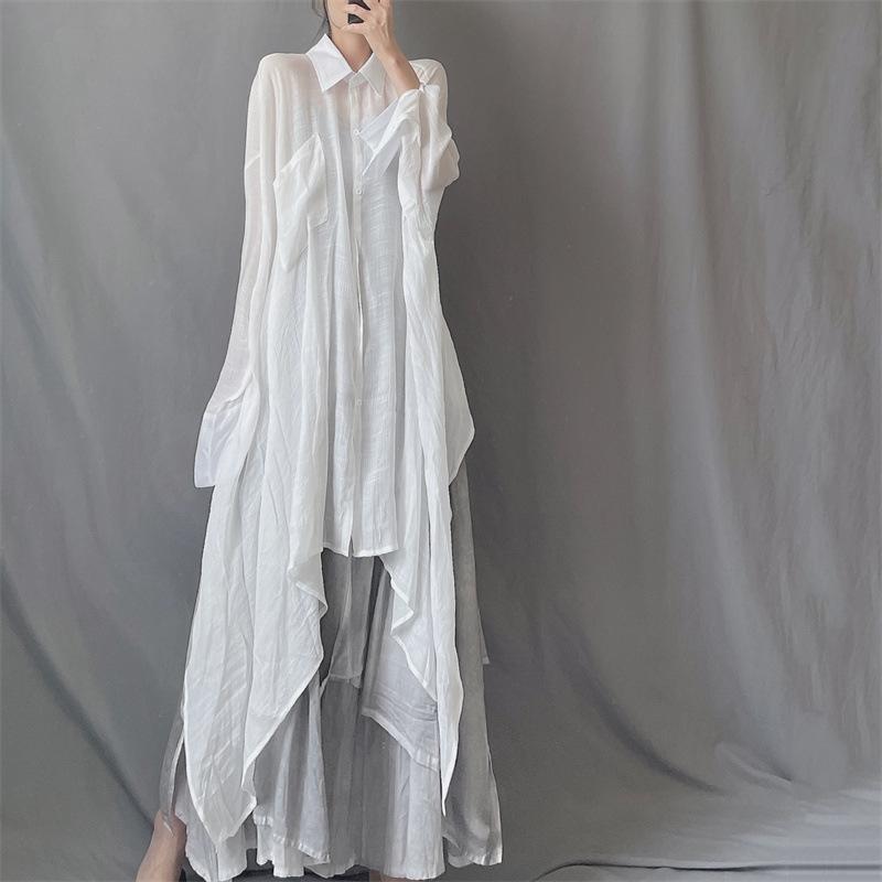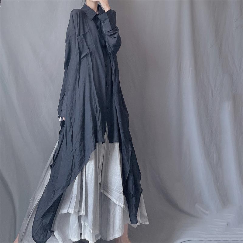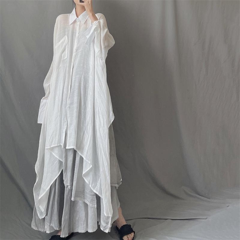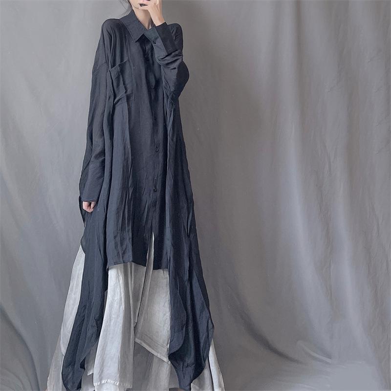 Camisa minimalista de calidad original con dobladillo irregular elegante de hilo Tencel, solapa de largo medio, protección solar, suelta y artística.