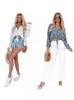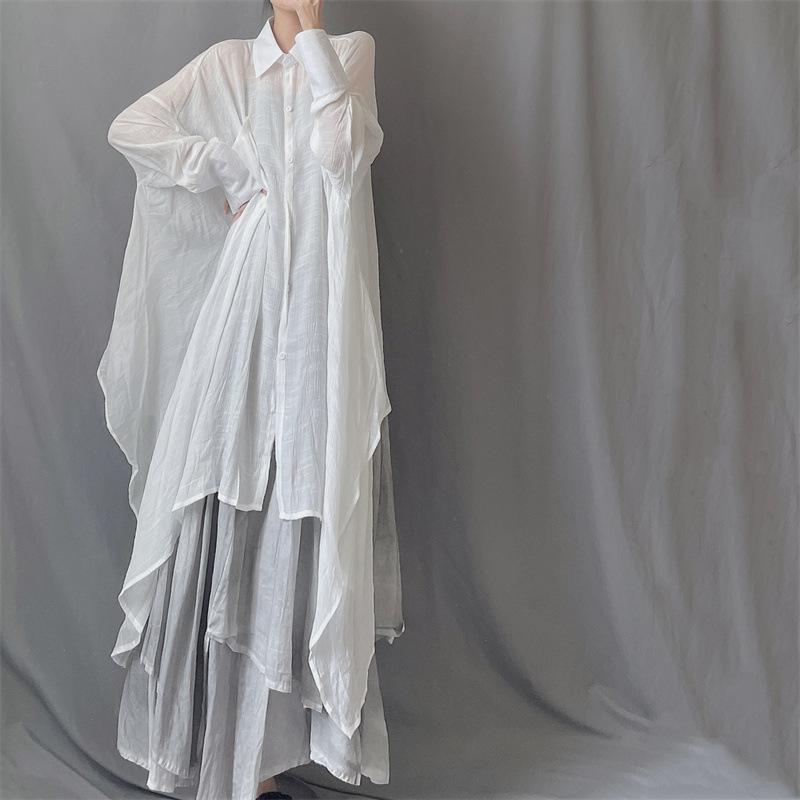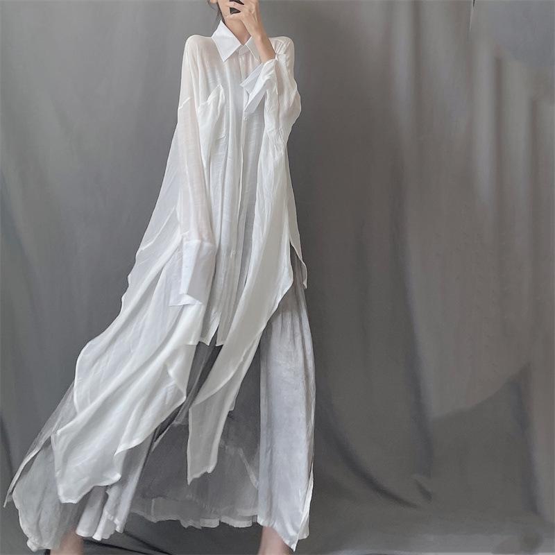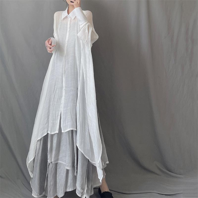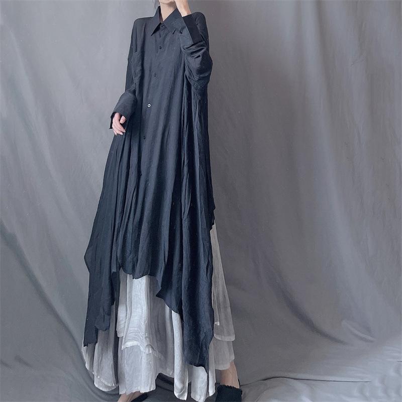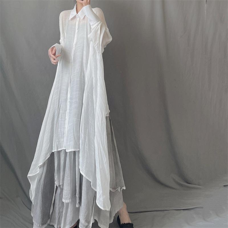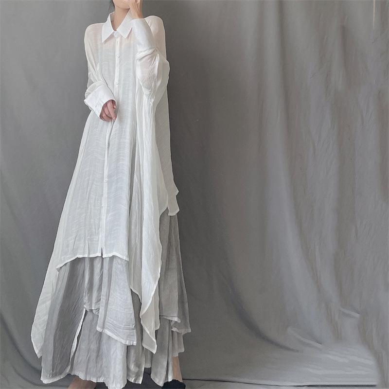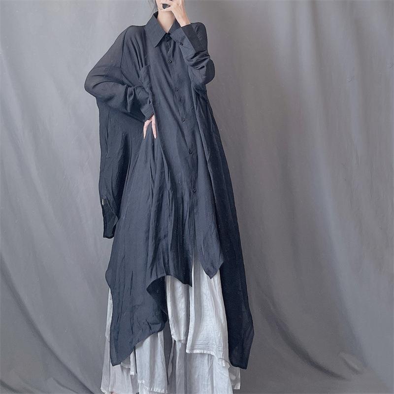 Camisa minimalista de calidad original con dobladillo irregular elegante de hilo Tencel, solapa de largo medio, protección solar, suelta y artística.