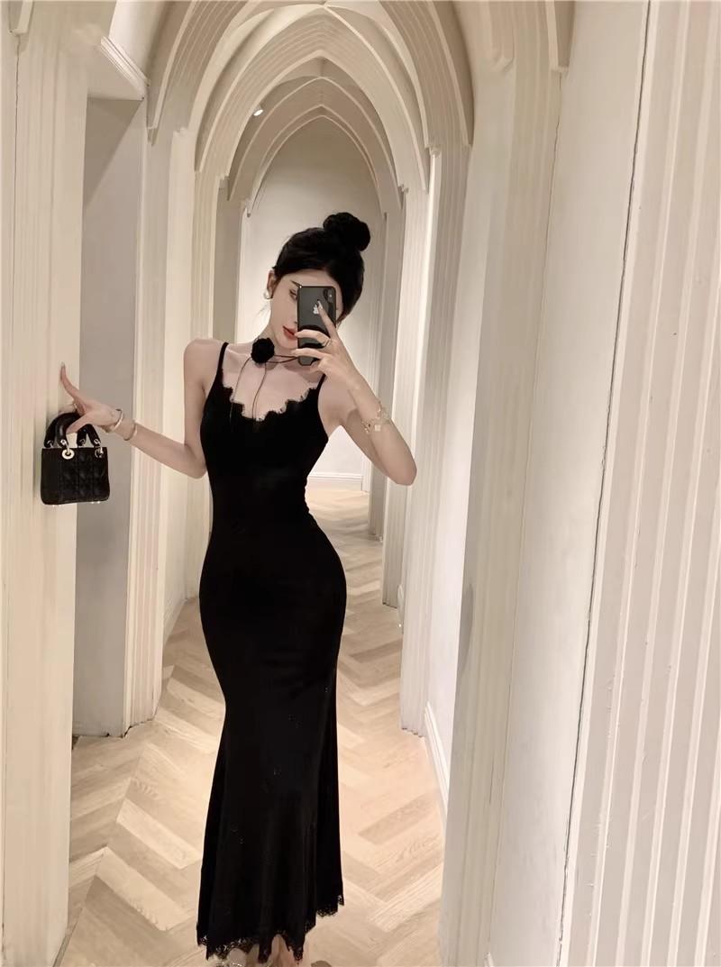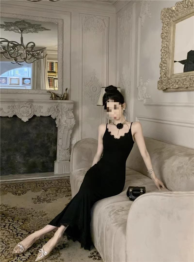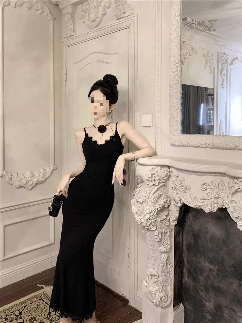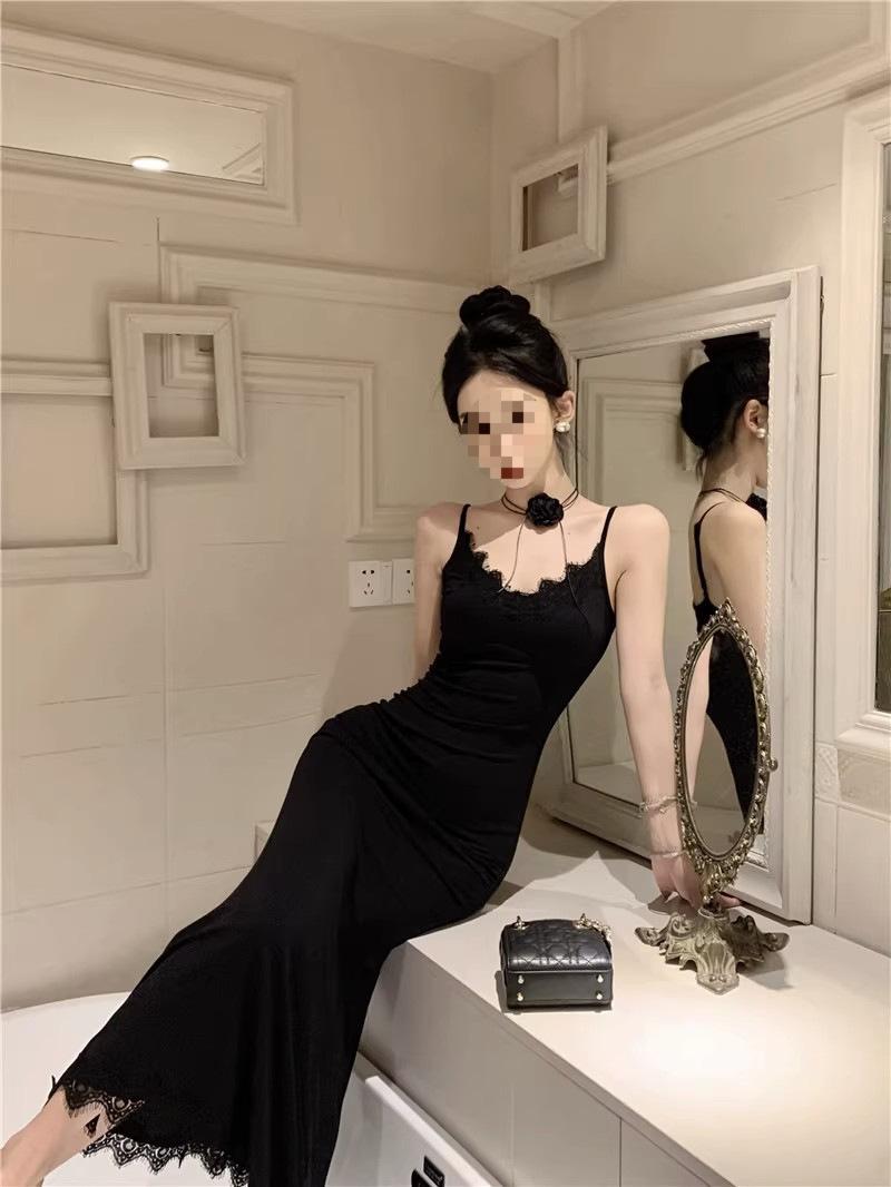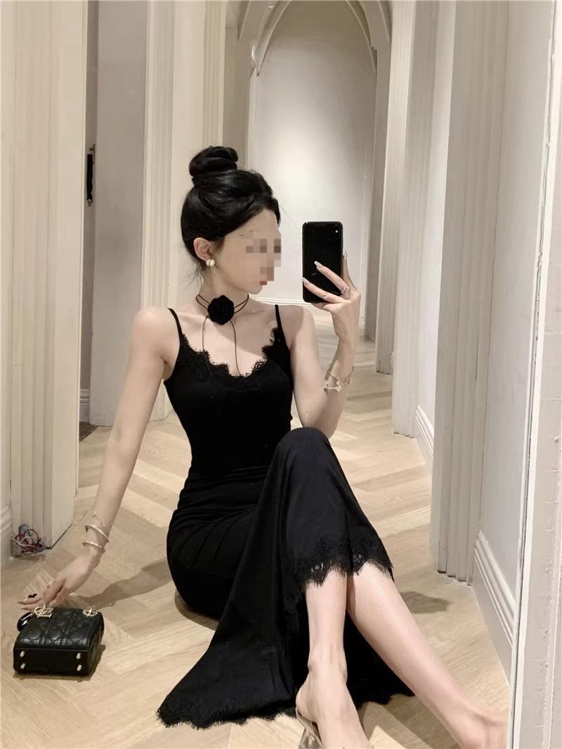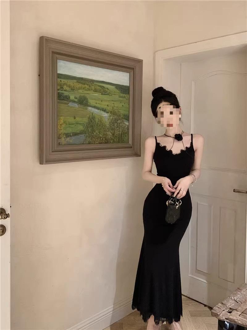 Falda de encaje adelgazante de corte entallado para mujer, de primavera y otoño, sin mangas, con tirantes finos, para familia rica y sucia, falda larga