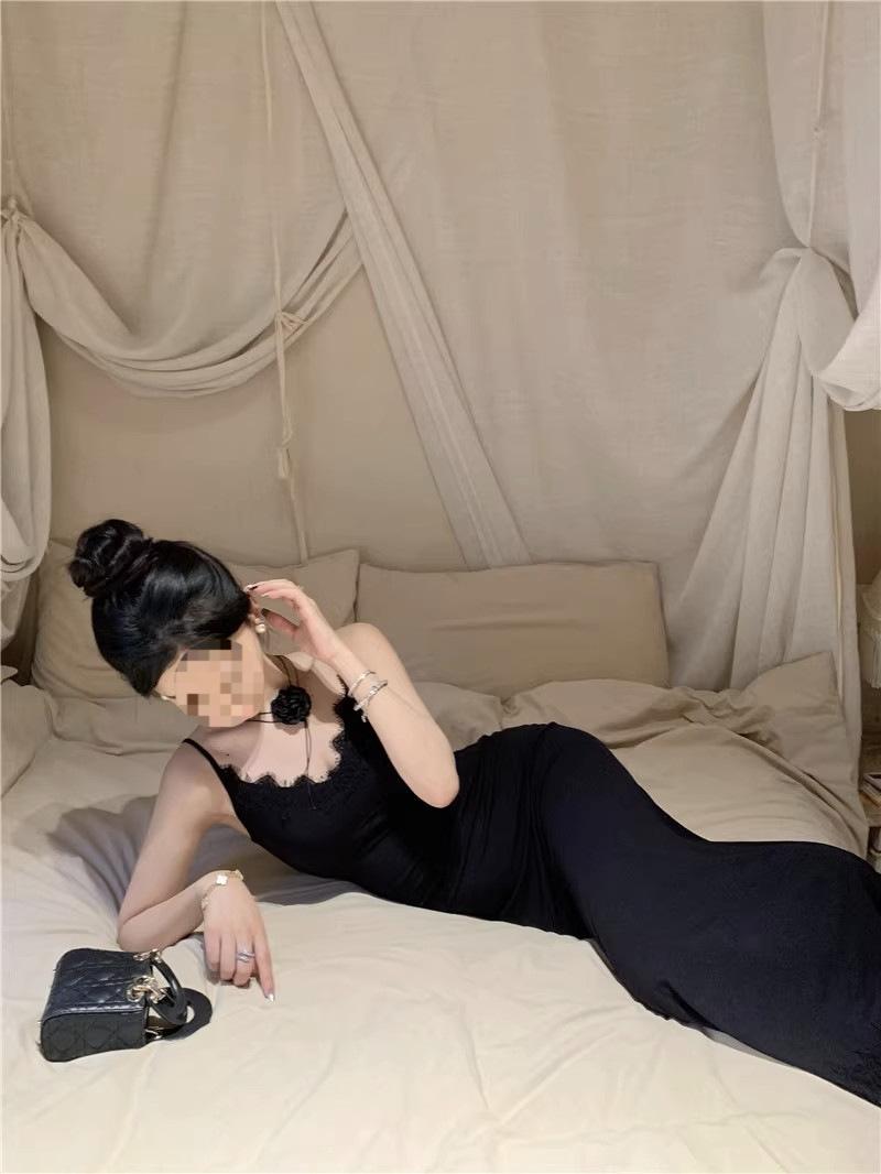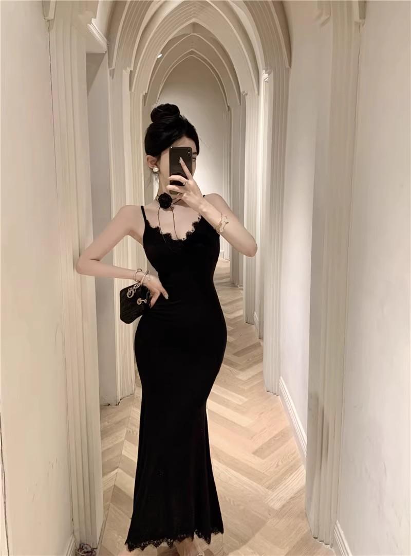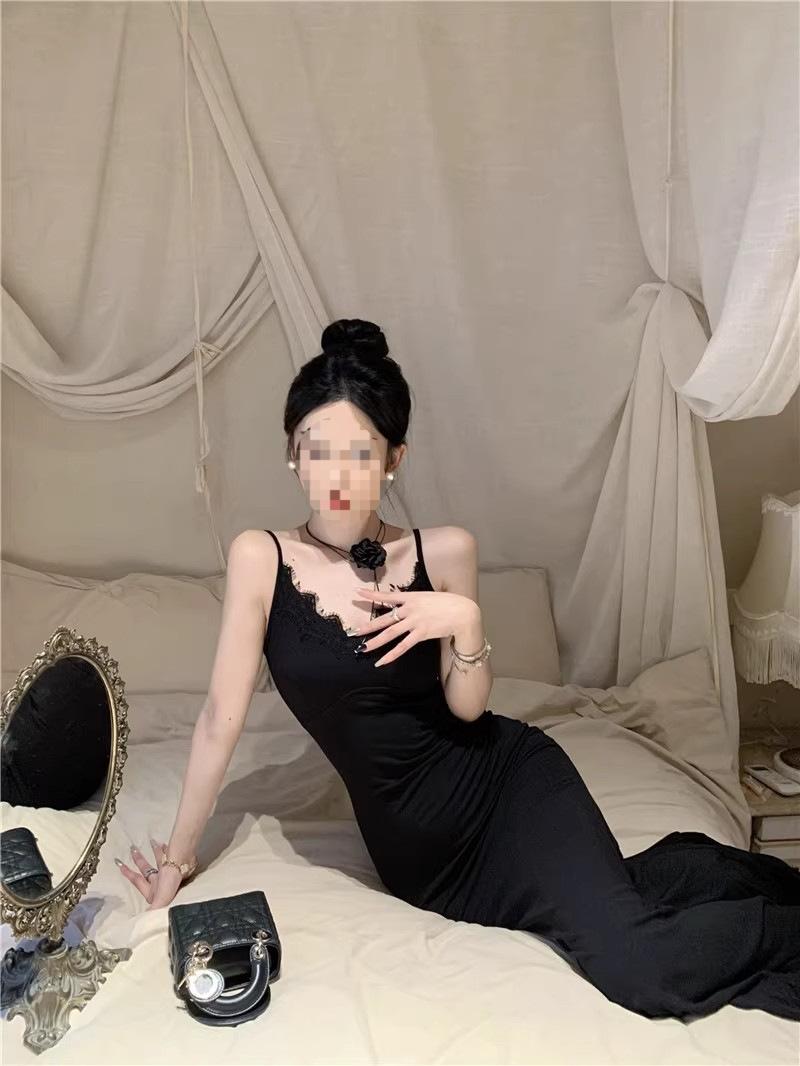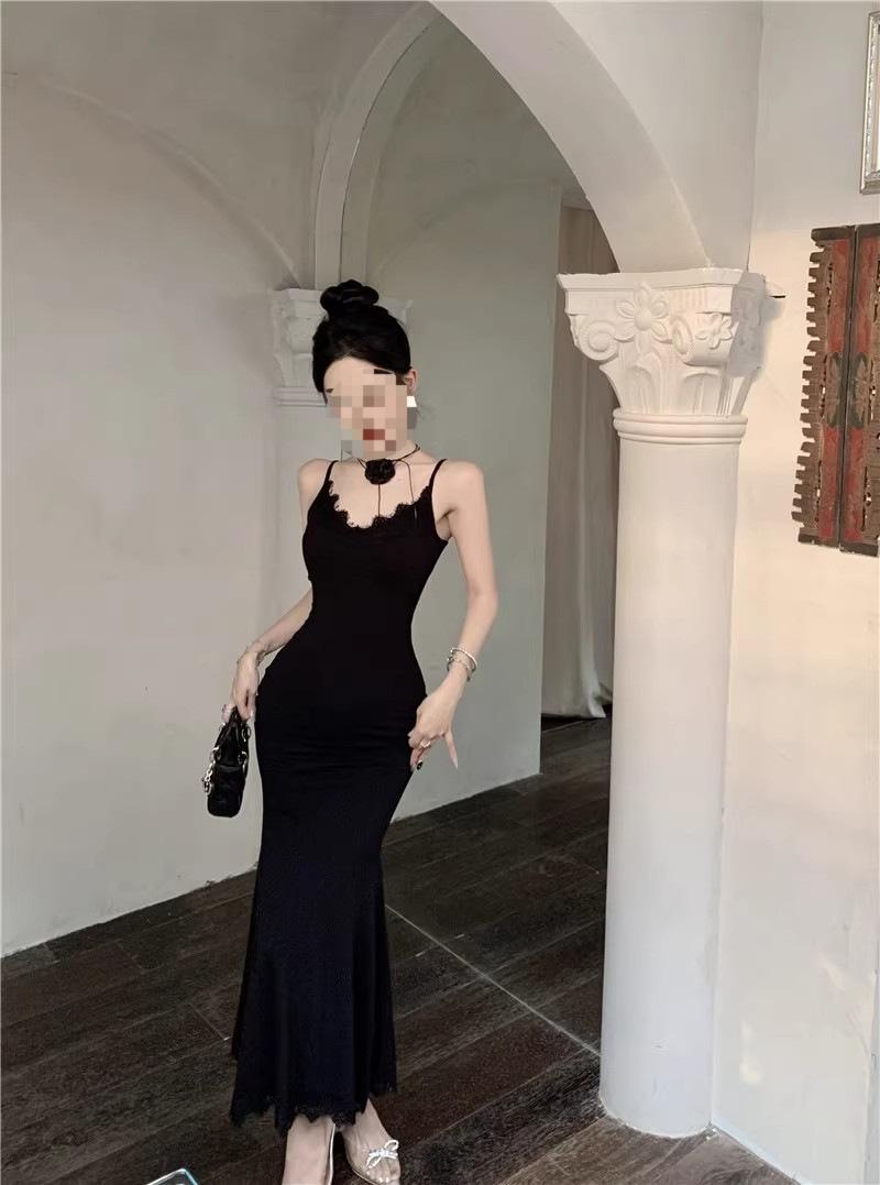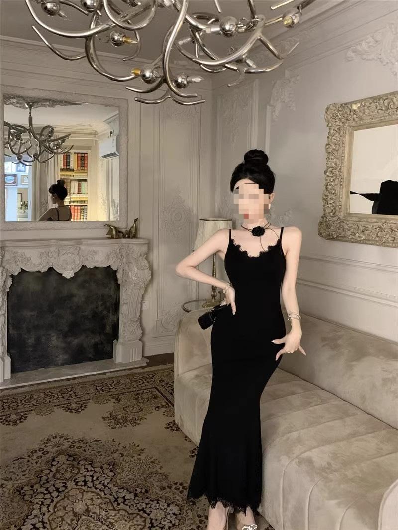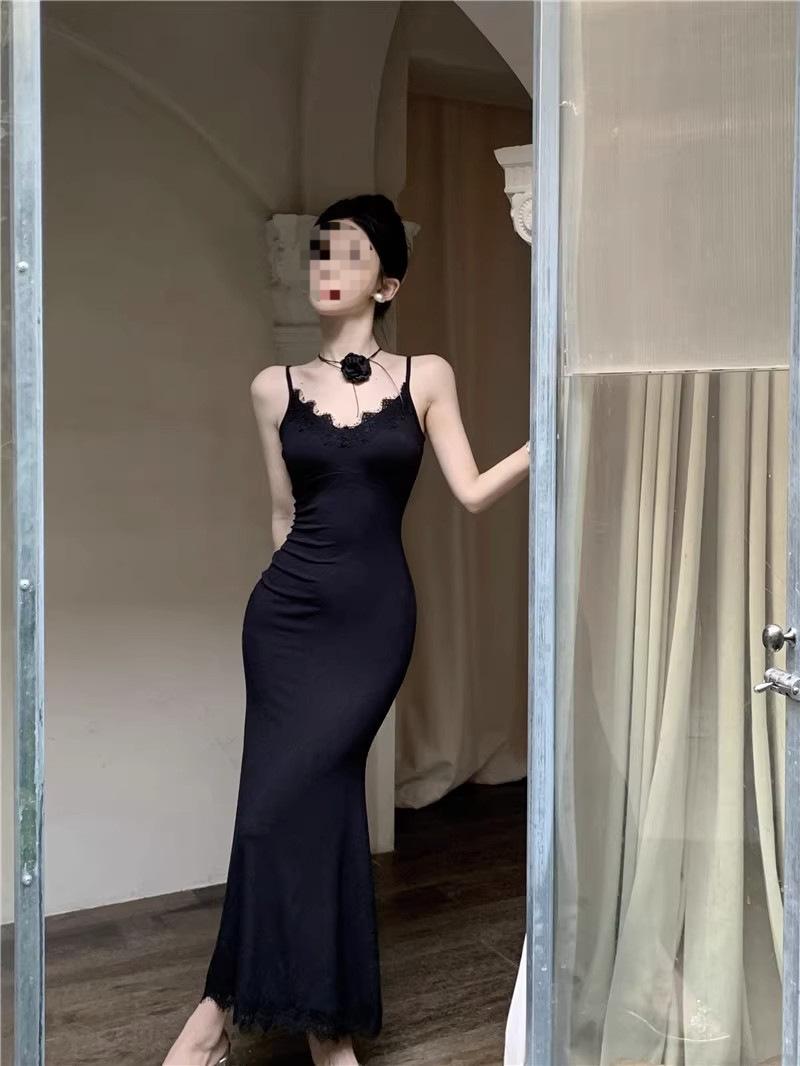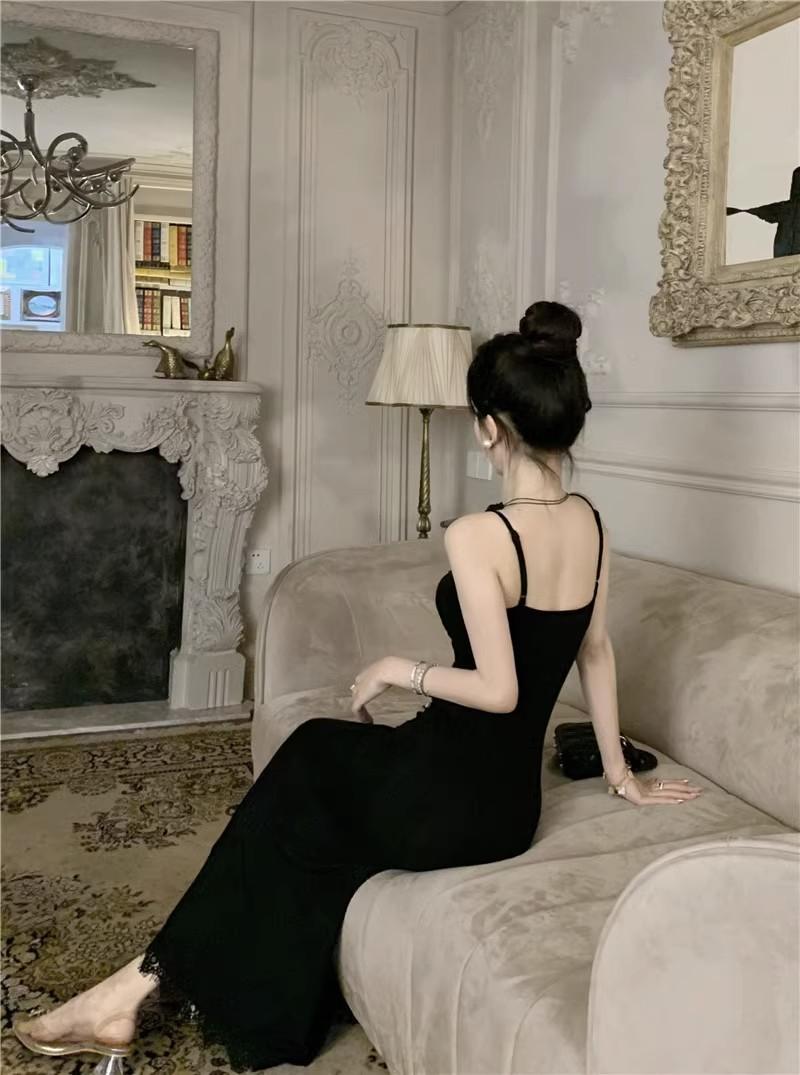 Falda de encaje adelgazante de corte entallado para mujer, de primavera y otoño, sin mangas, con tirantes finos, para familia rica y sucia, falda larga