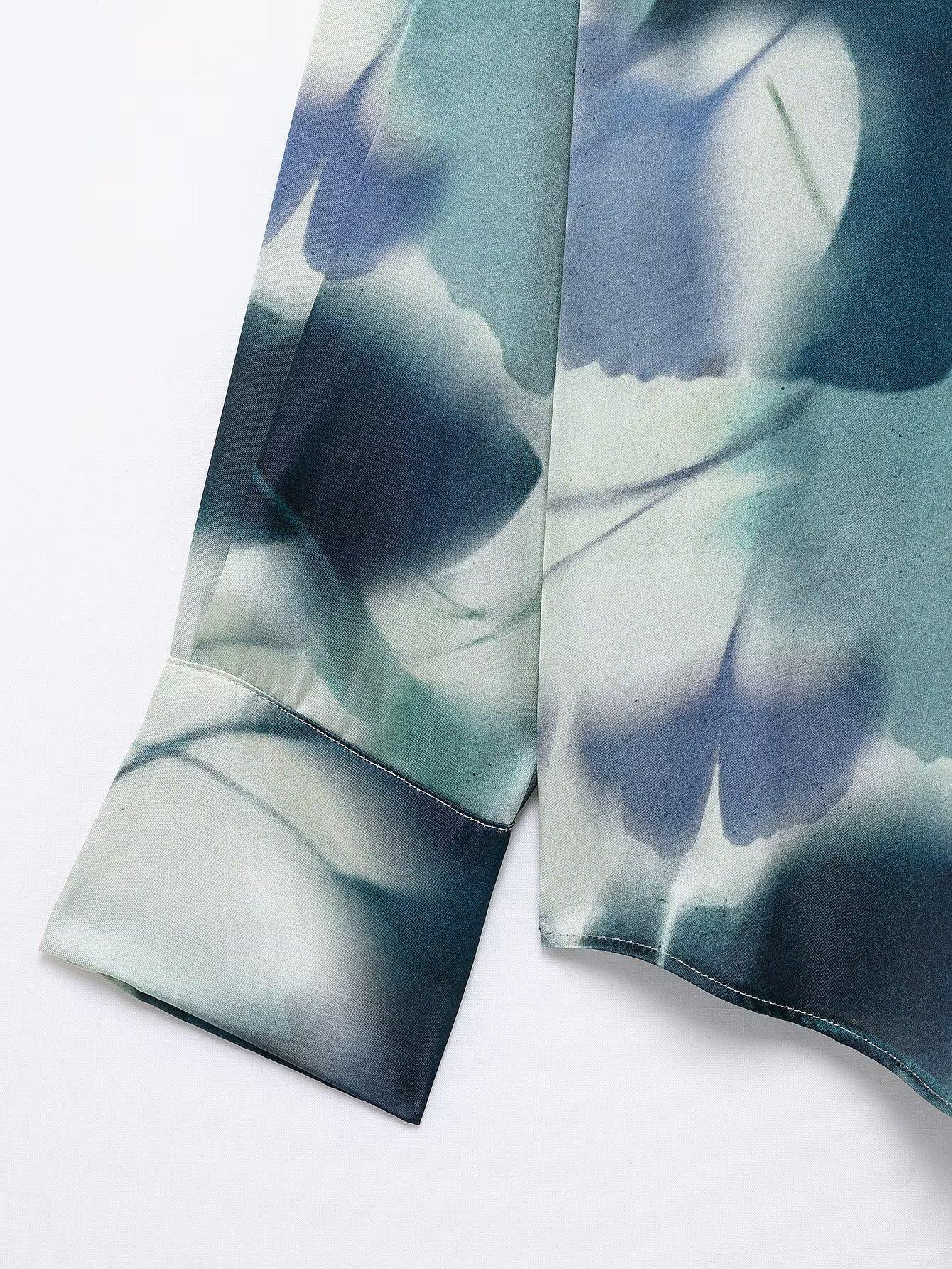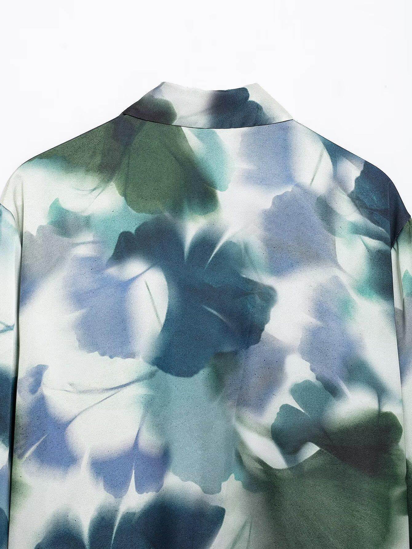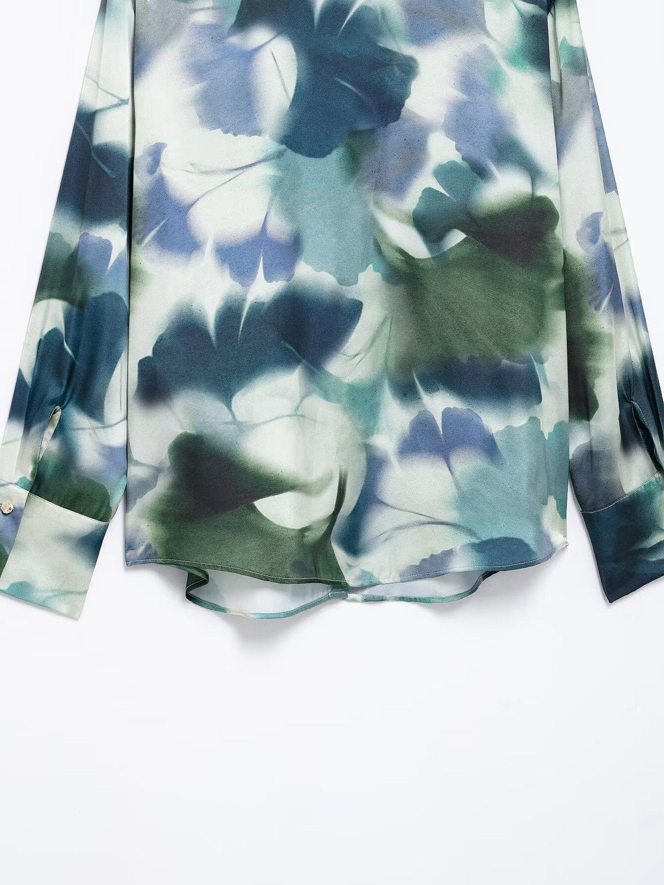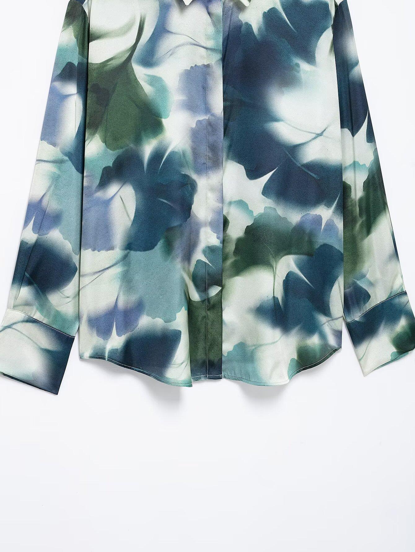 Venta al por mayor de comercio exterior Viento europeo y americano Moda casual estampada primavera y verano 2025 Camisa de solapa con textura de satén de seda para mujer D6238108