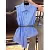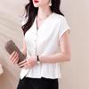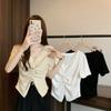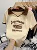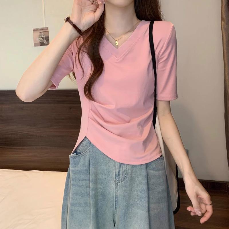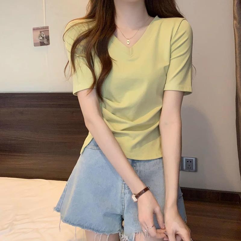 Camiseta de algodón de manga corta con cuello en V irregular estilo americano para mujer, camisa elegante de color liso, ropa de verano, top ajustado con hombros descubiertos