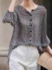 Camisa Nueva Retro a Cuadros de Chifón Estampado Primavera y Otoño Frente Corto y Espalda Larga Camisa de Manga Elástica Top de Mujer