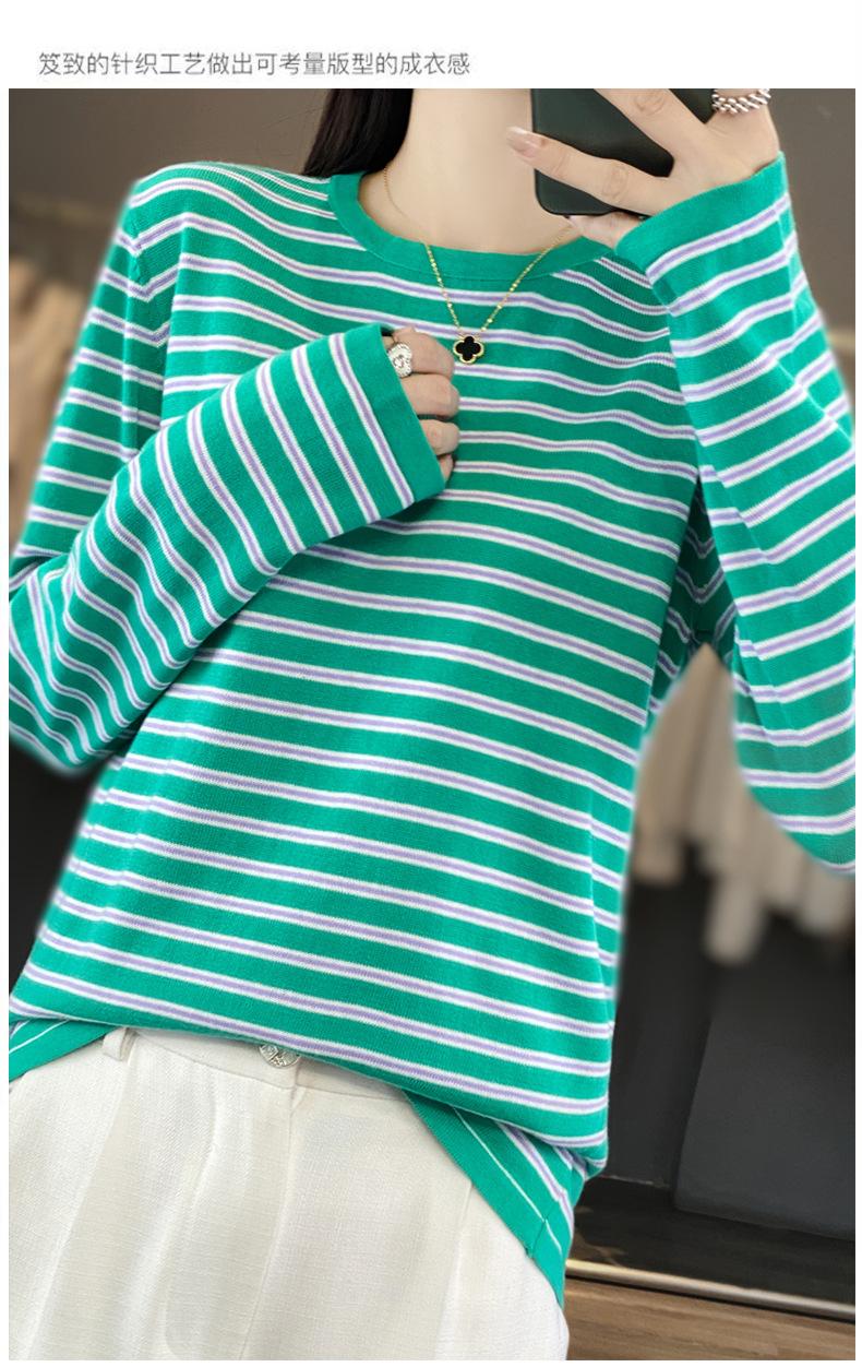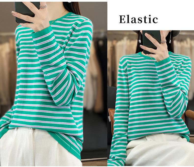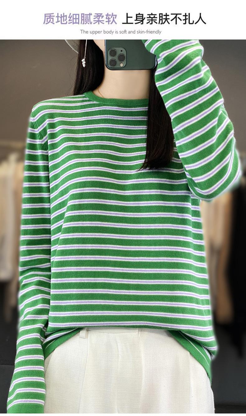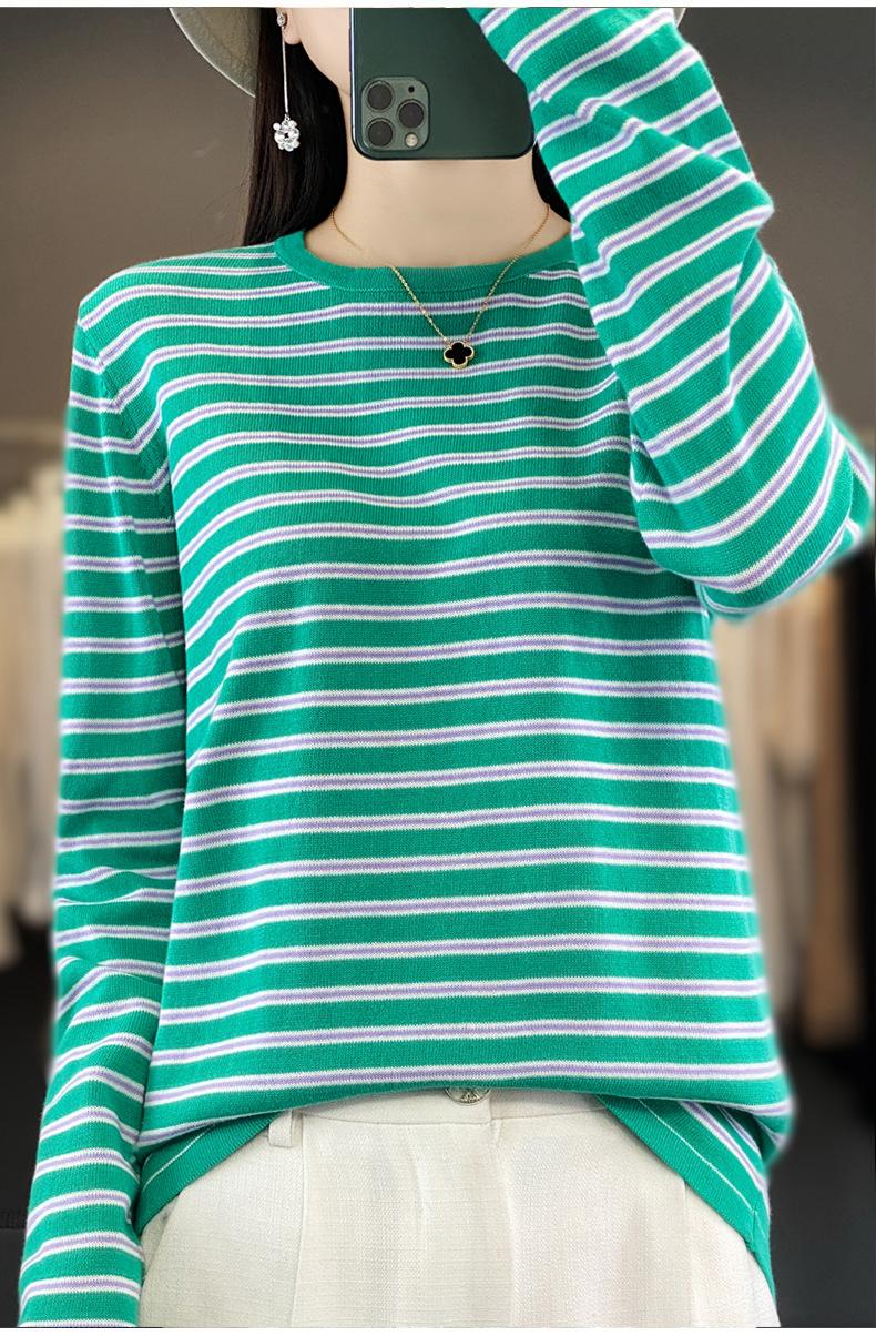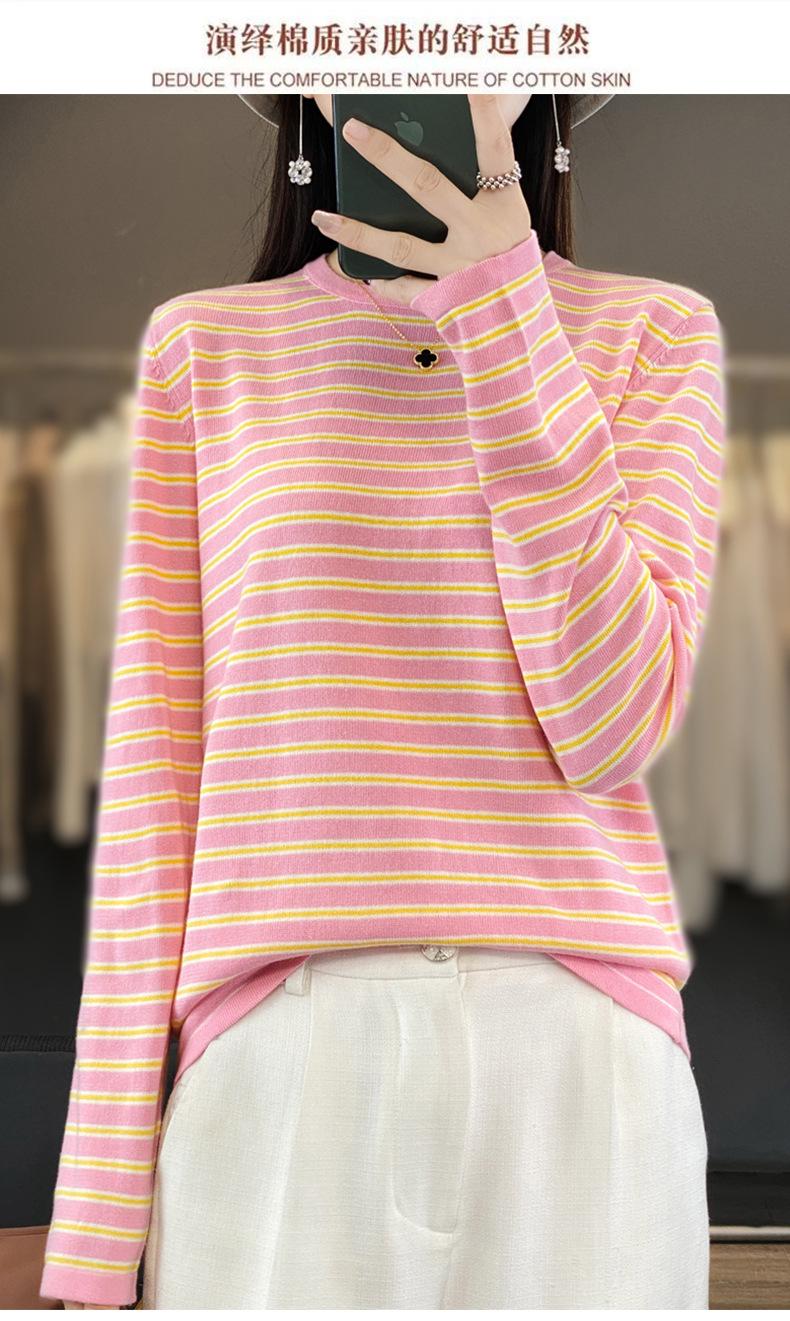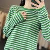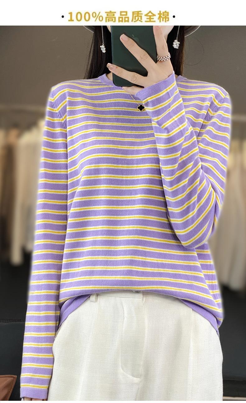 Estilo Coreano Algodón Puro Tejido Cuello Redondo Raya Horizontal Jersey de Mujer Suelto Slim Commuter Primavera Nuevo Tejido Manga Larga Ropa Exterior