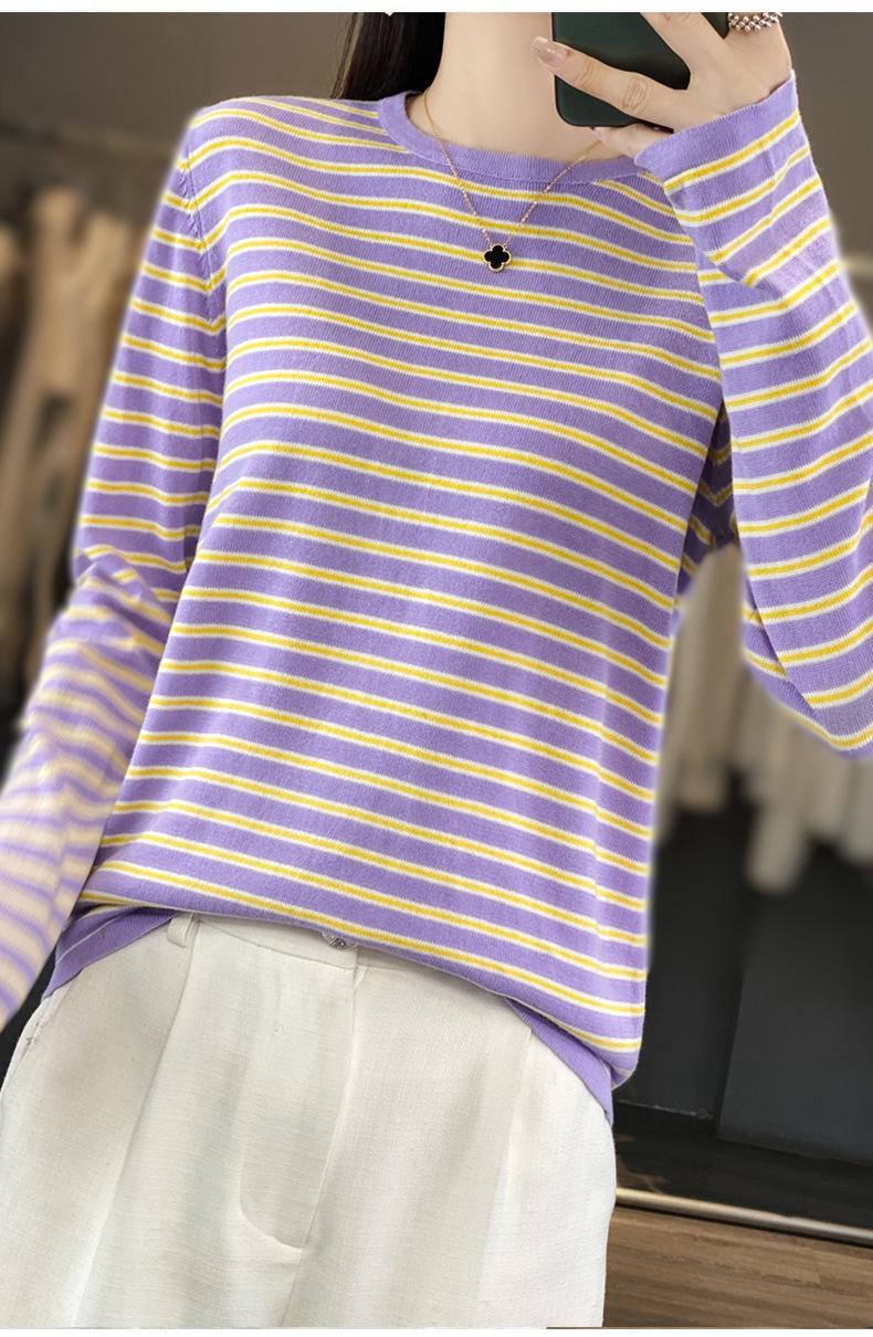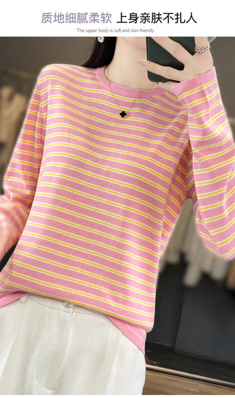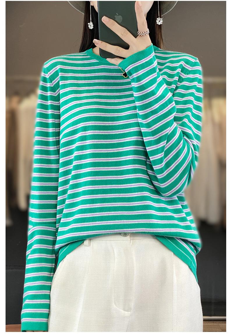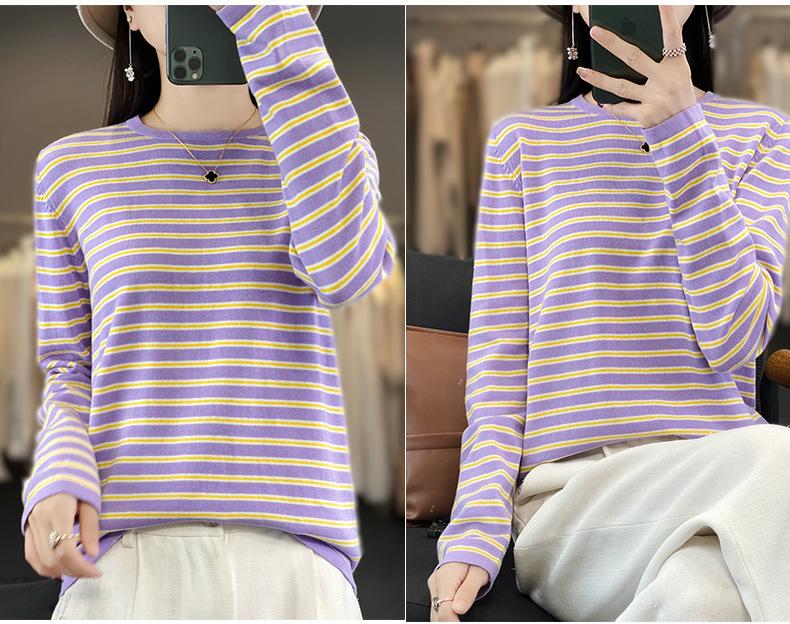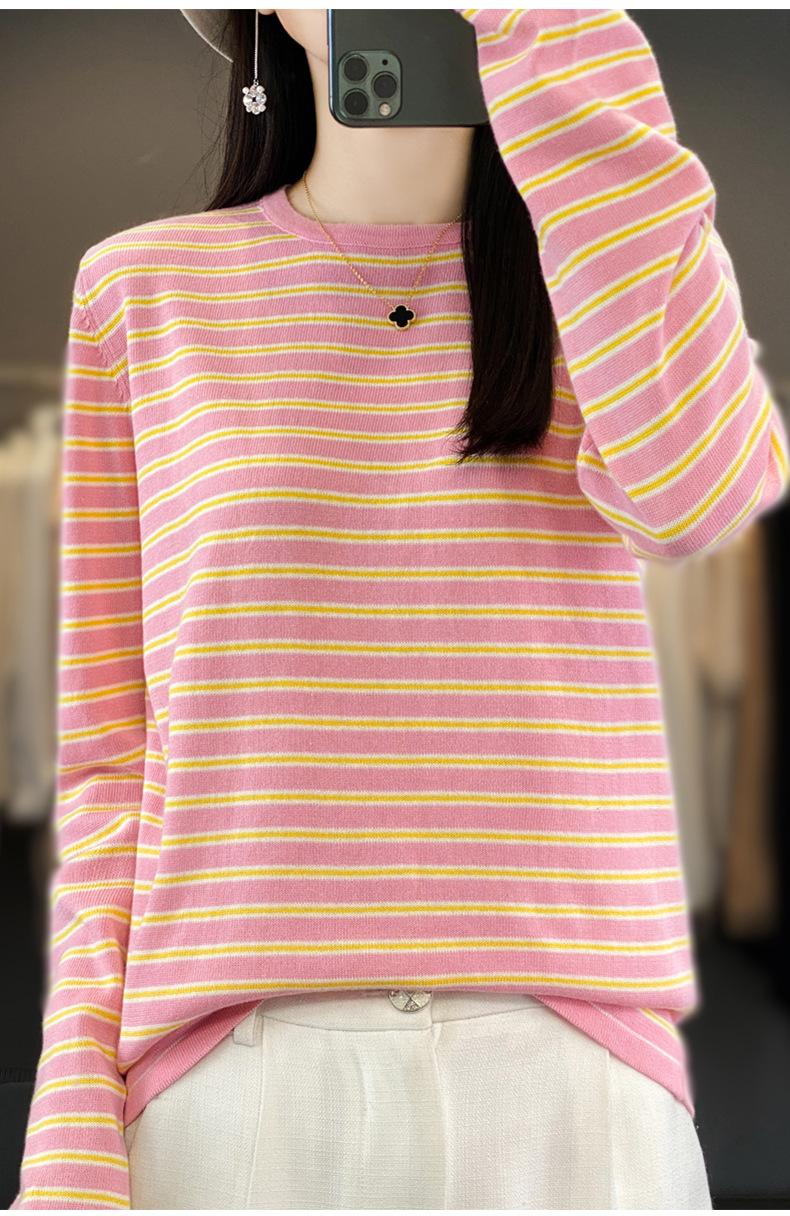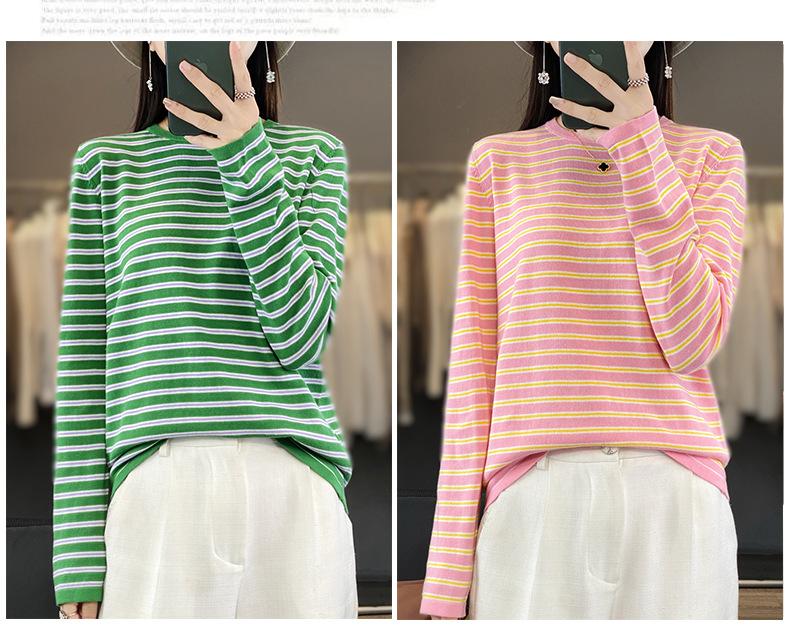 Estilo Coreano Algodón Puro Tejido Cuello Redondo Raya Horizontal Jersey de Mujer Suelto Slim Commuter Primavera Nuevo Tejido Manga Larga Ropa Exterior