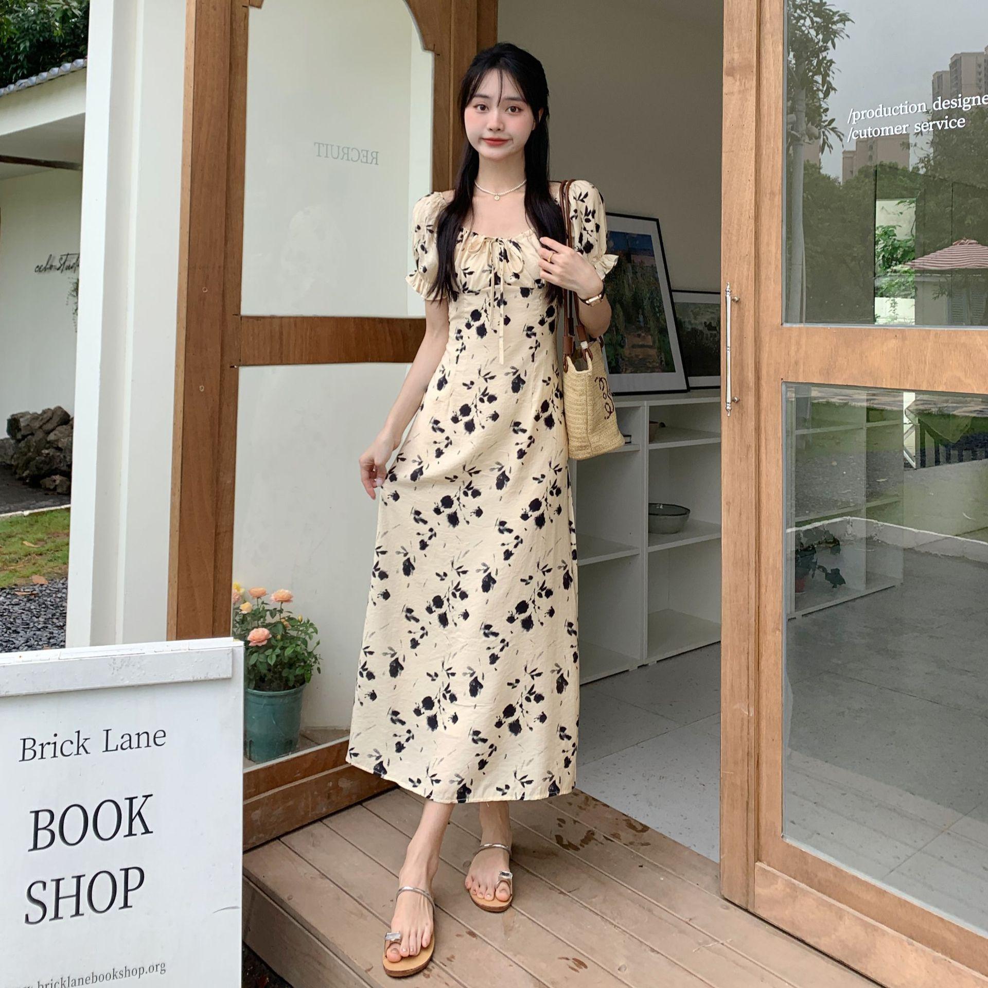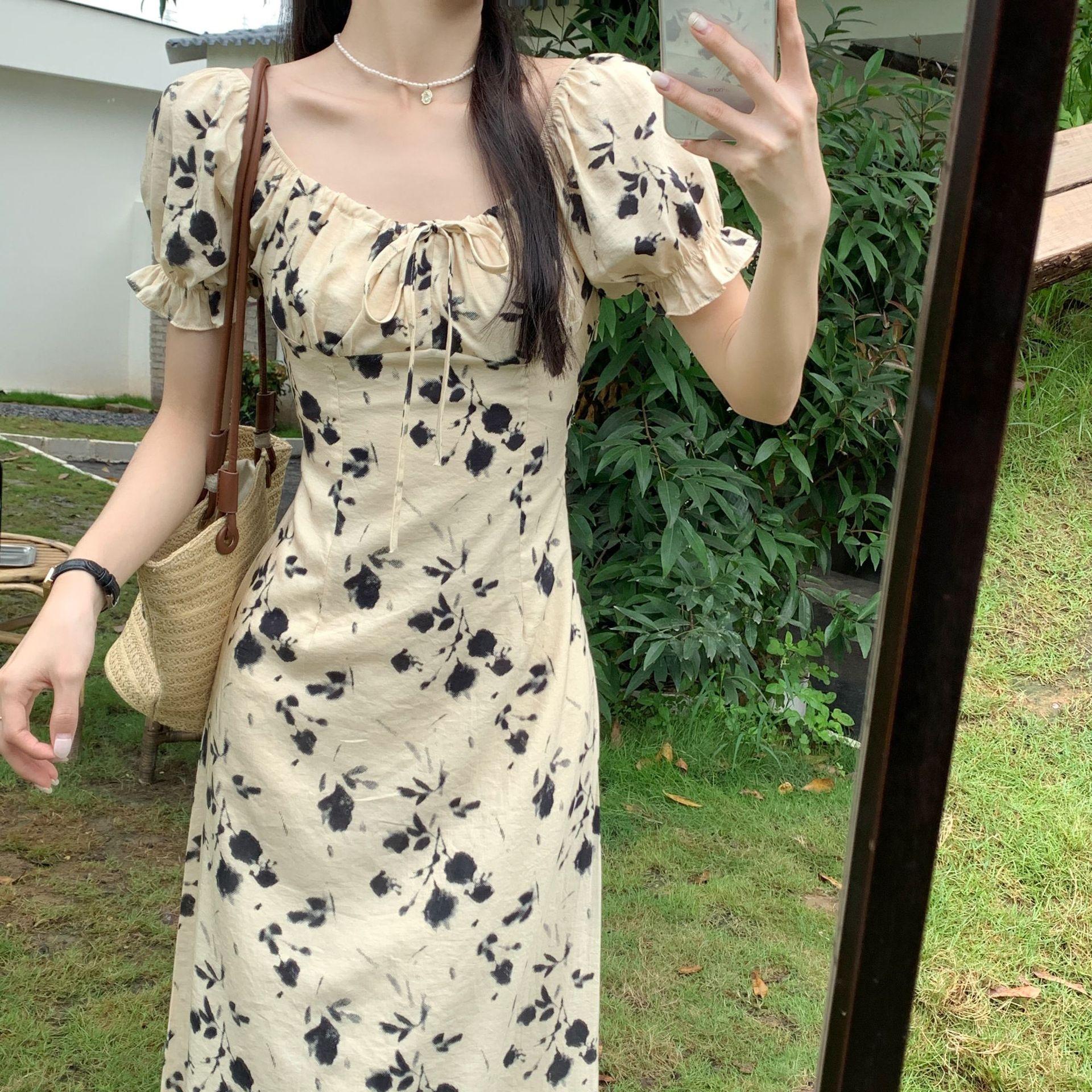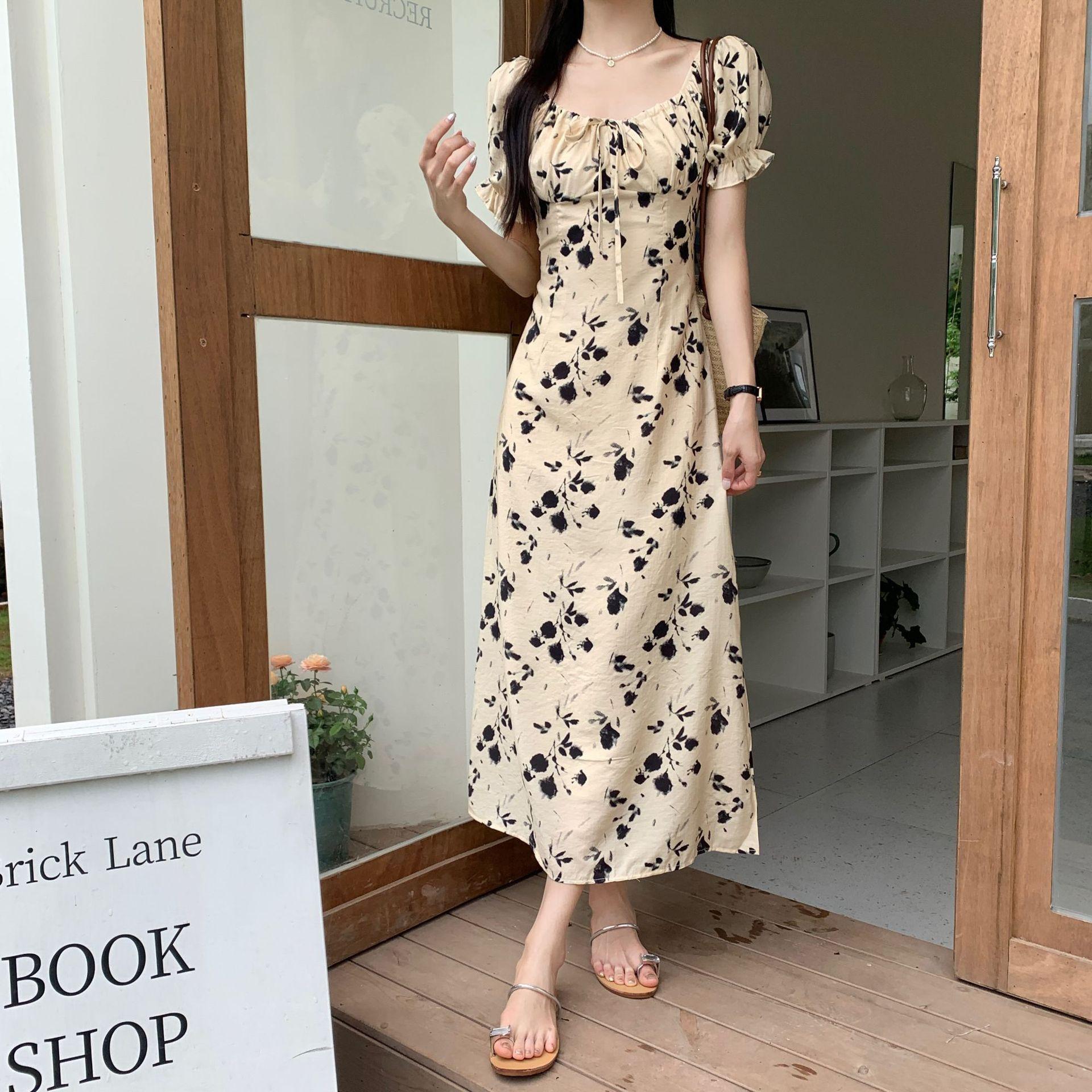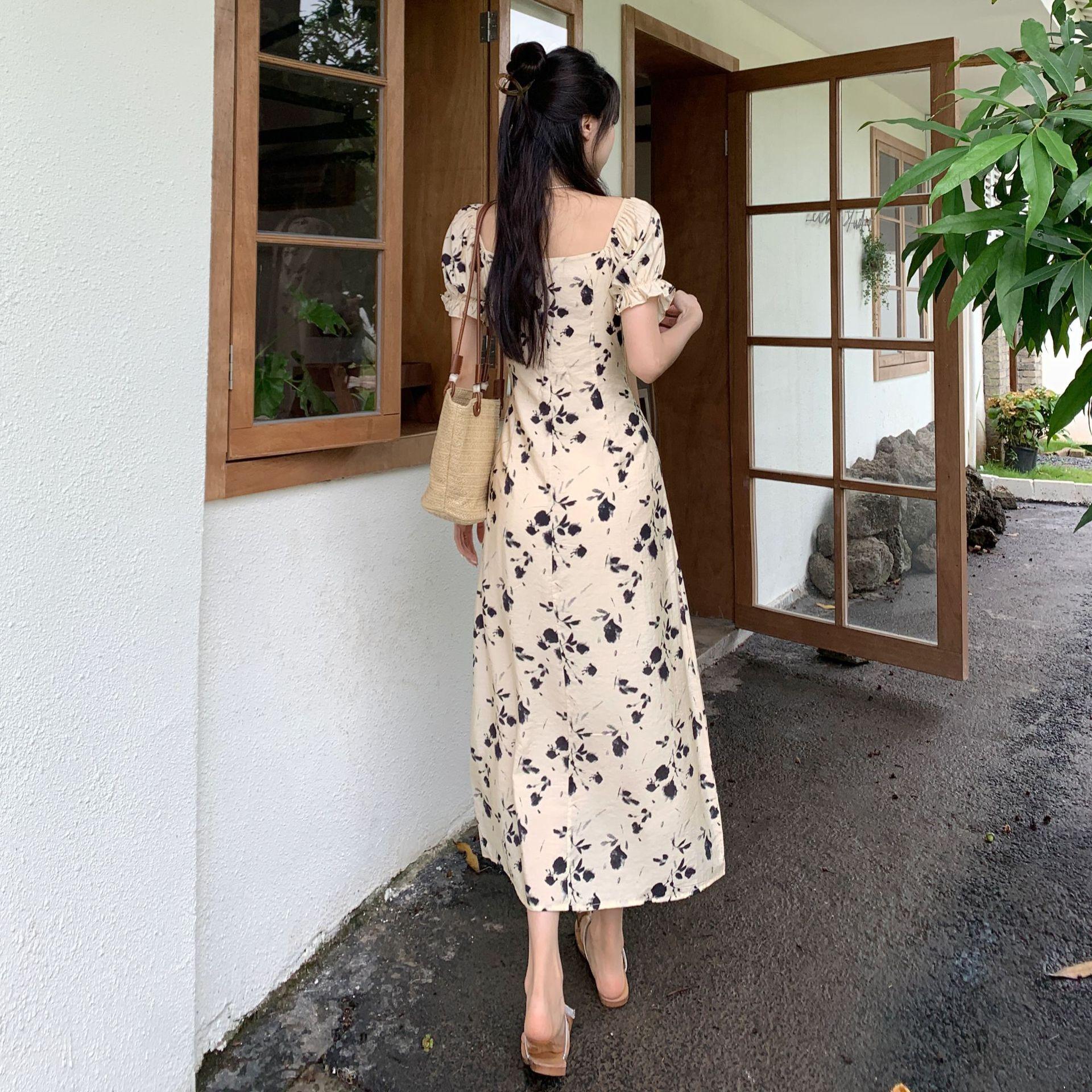 Vestido de estilo francés retro floral con cuello cuadrado y manga abullonada para mujer, verano elegante de alta calidad, estilo cálido y suave, adelgazante, falda larga