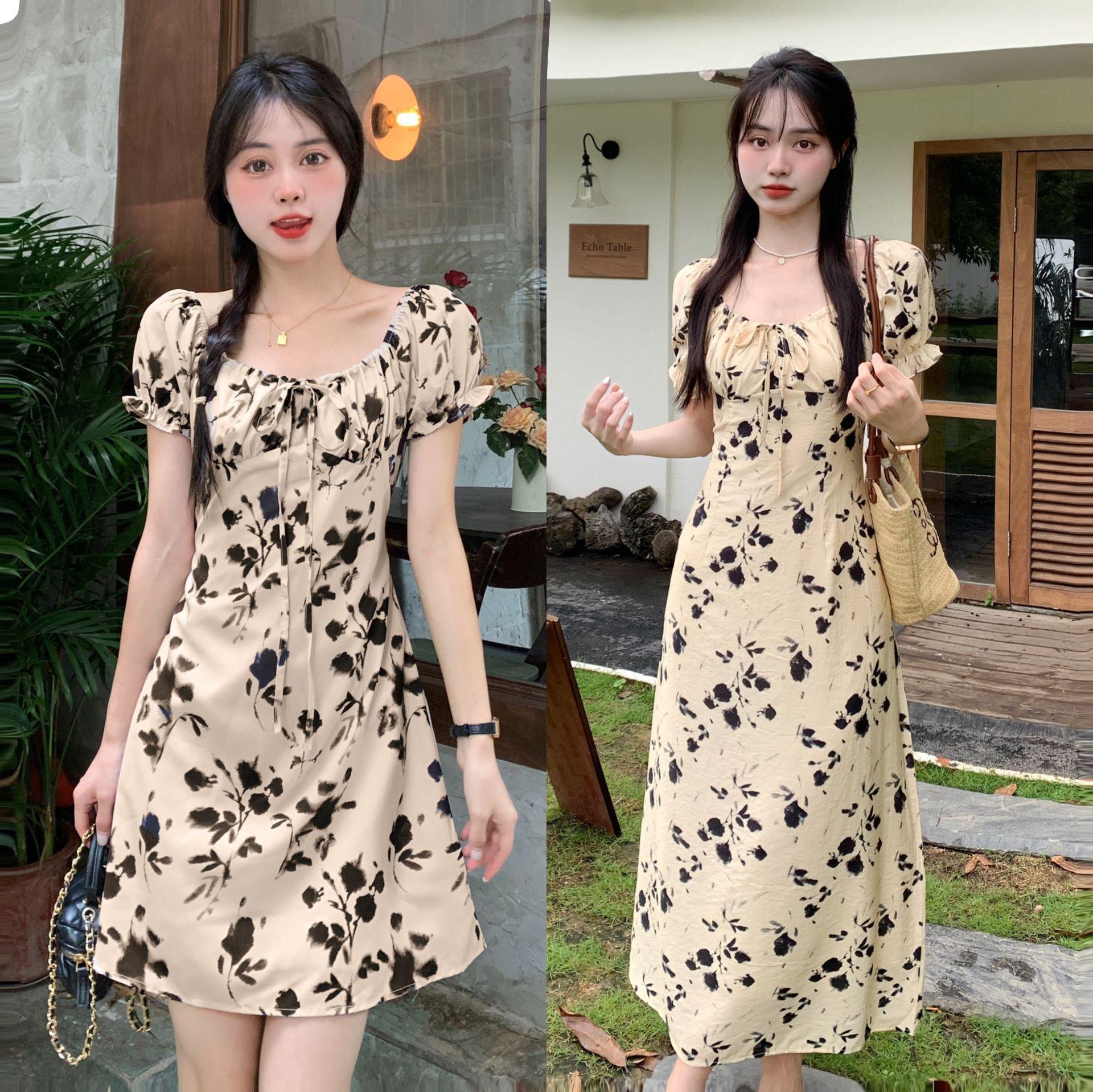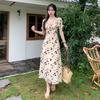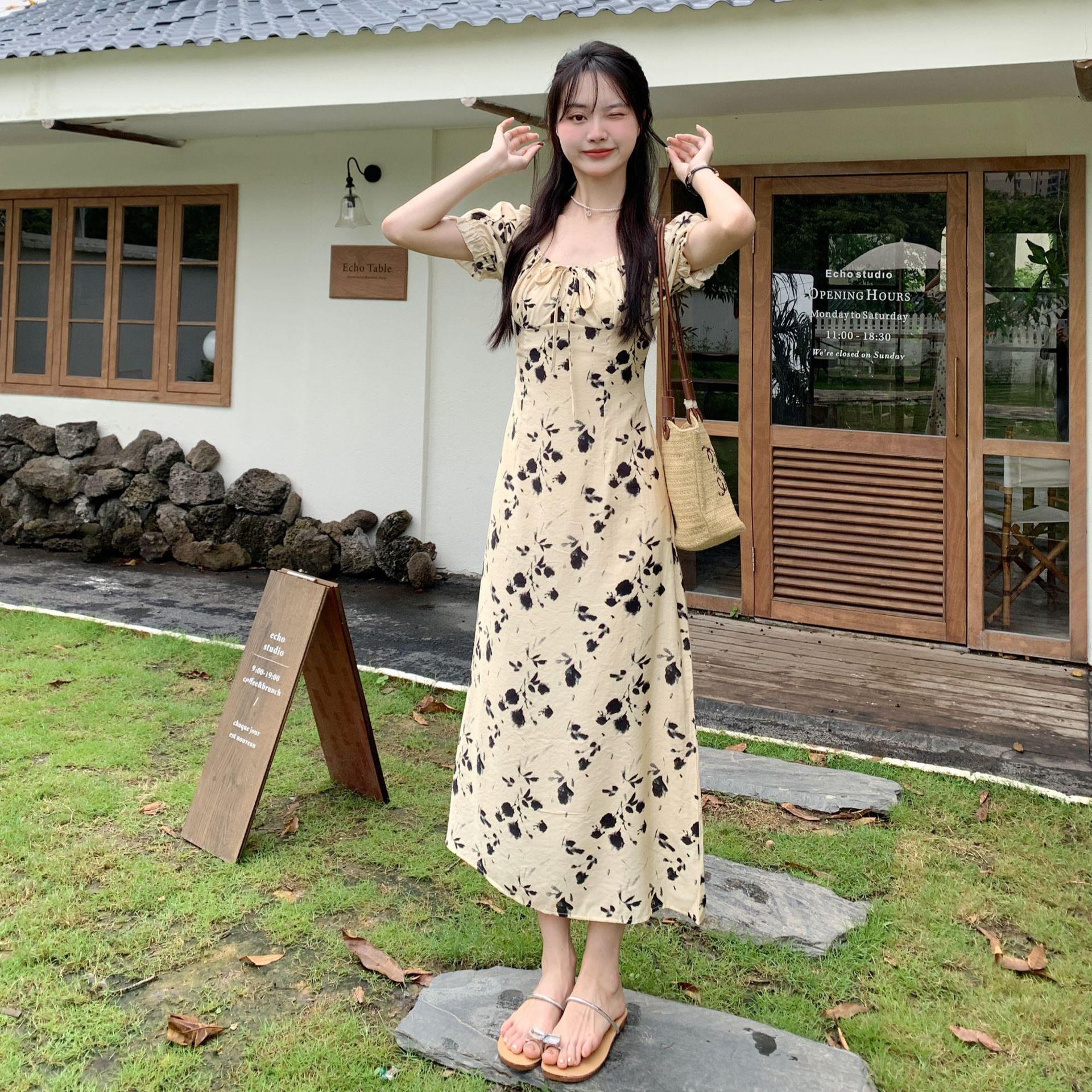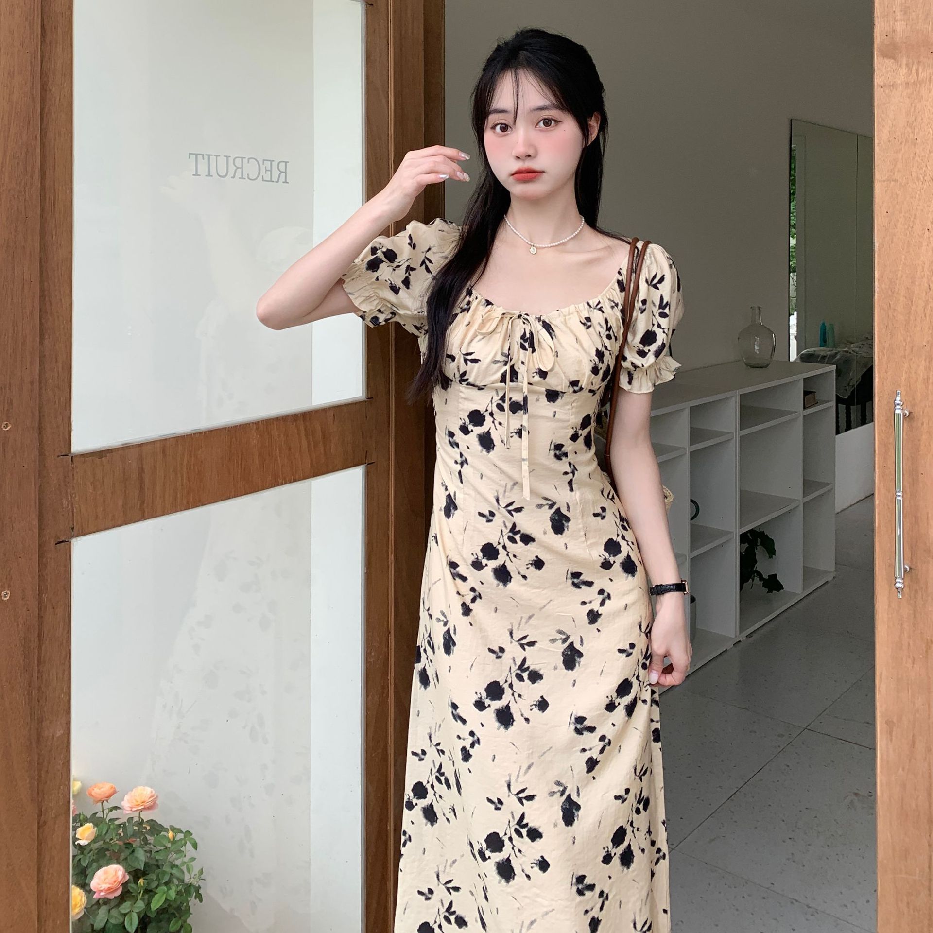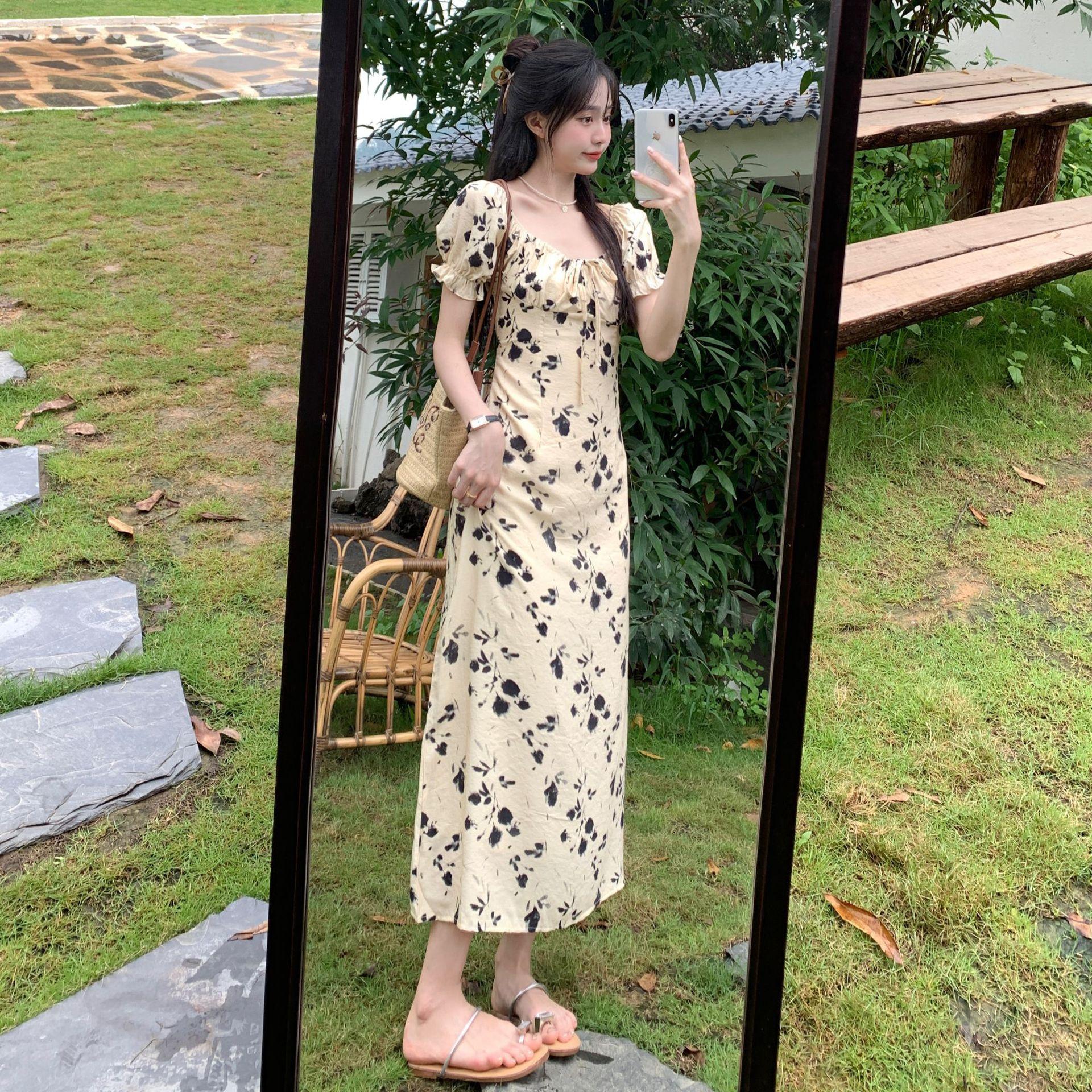 Vestido de estilo francés retro floral con cuello cuadrado y manga abullonada para mujer, verano elegante de alta calidad, estilo cálido y suave, adelgazante, falda larga