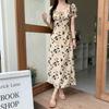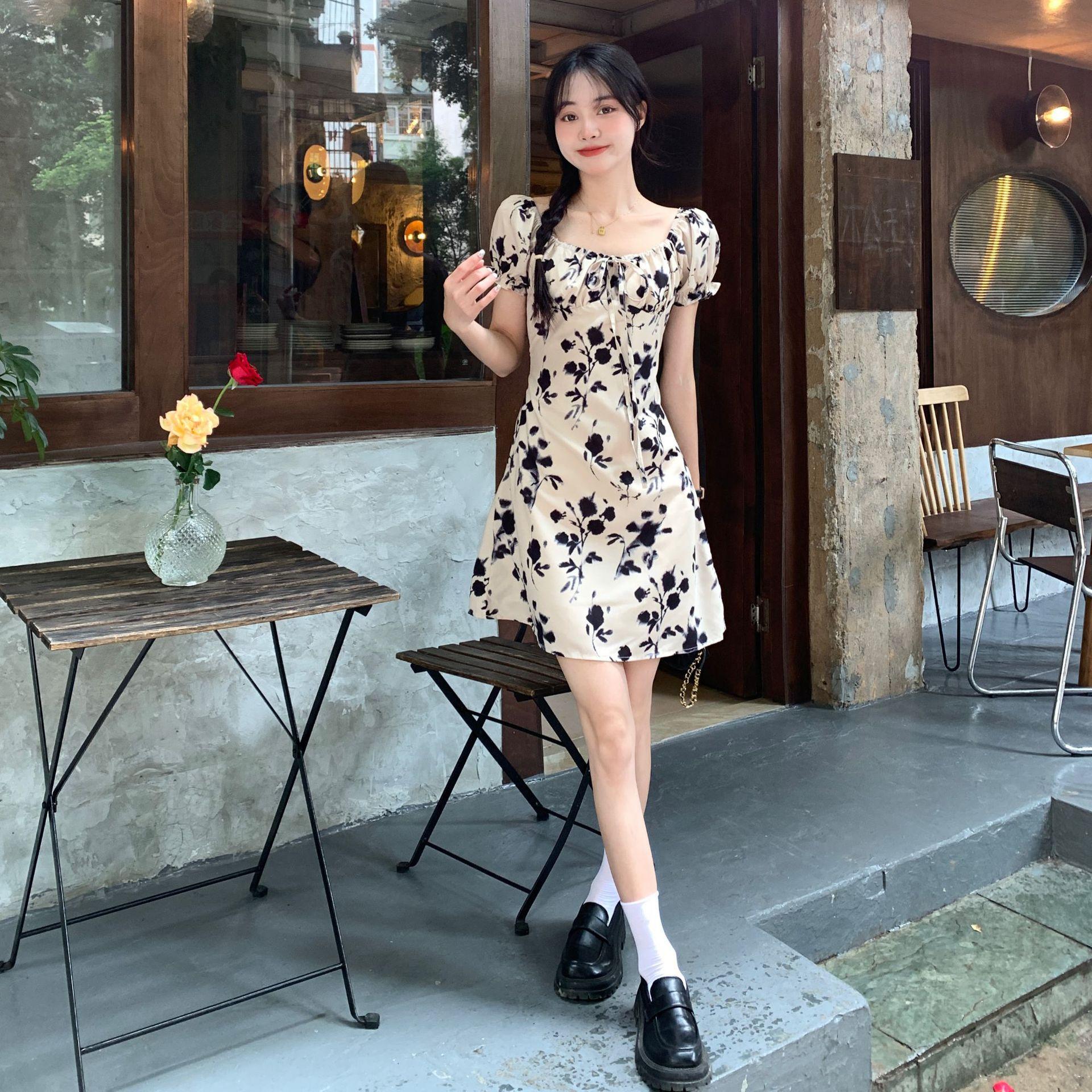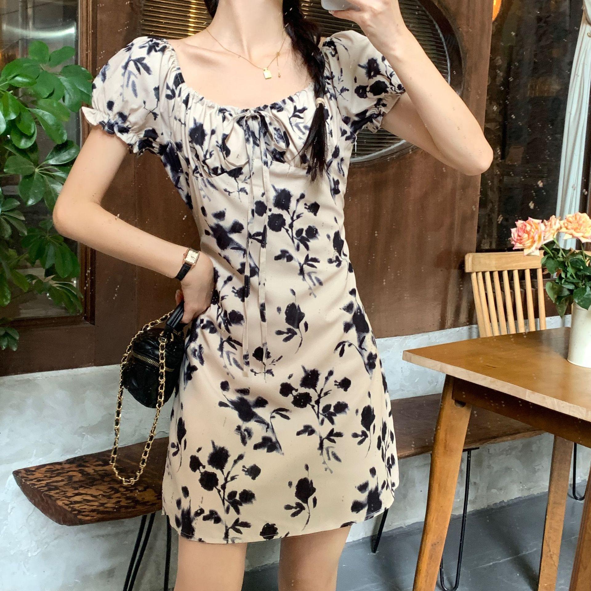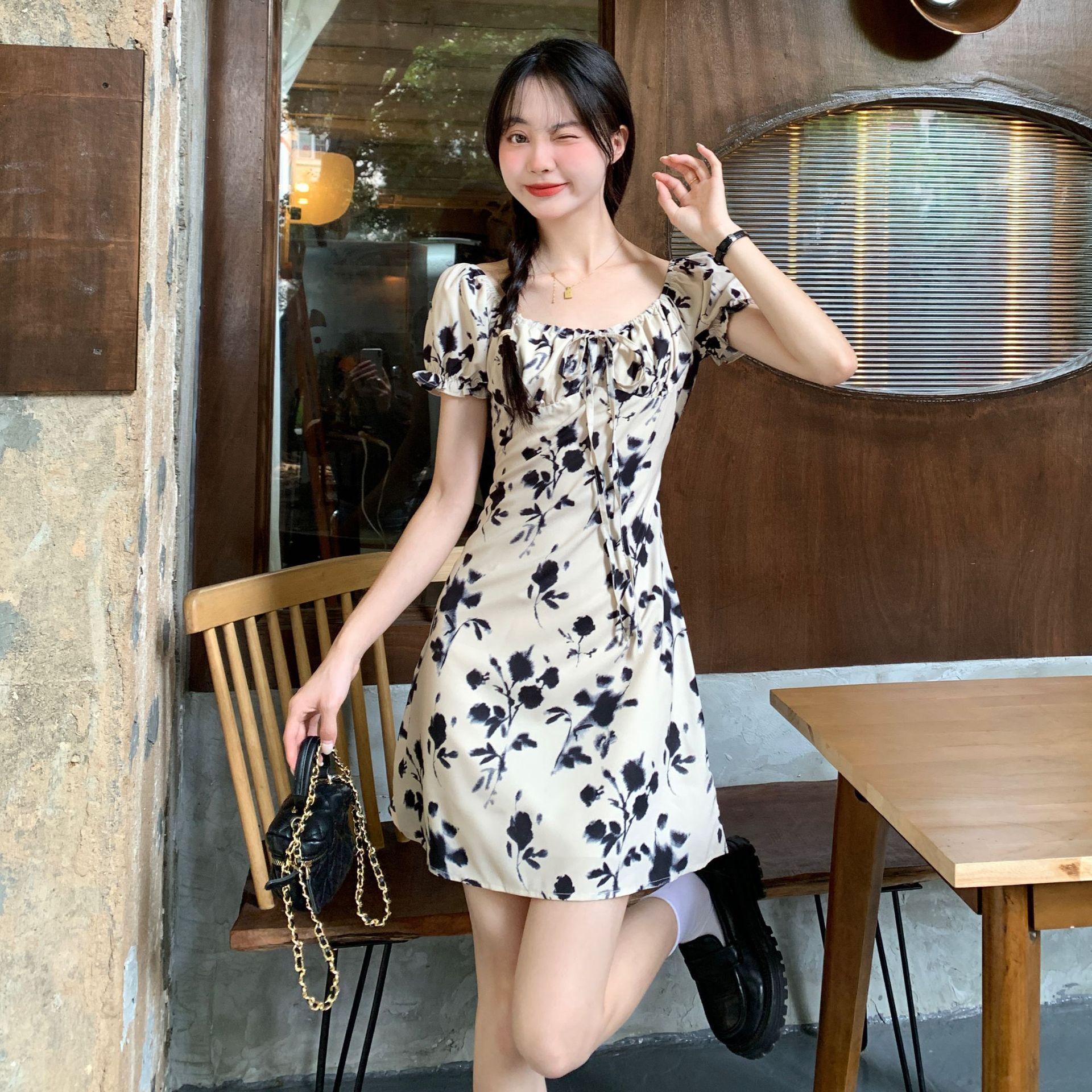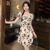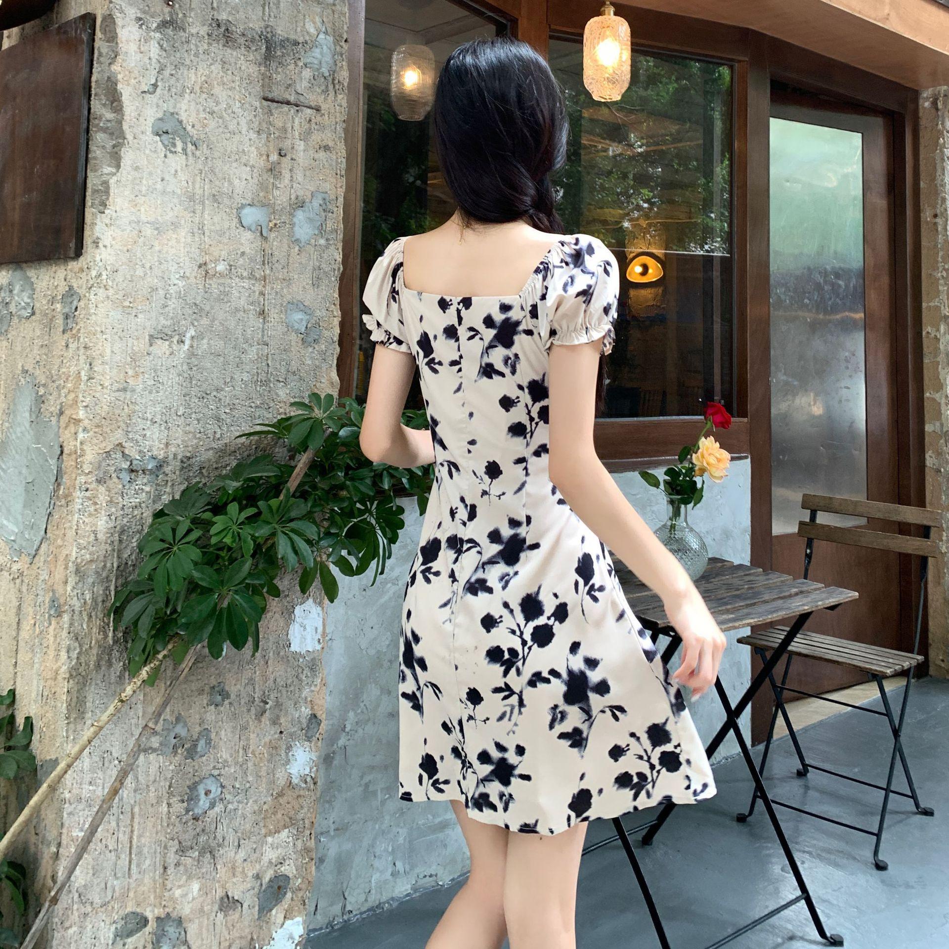 Vestido de estilo francés retro floral con cuello cuadrado y manga abullonada para mujer, verano elegante de alta calidad, estilo cálido y suave, adelgazante, falda larga