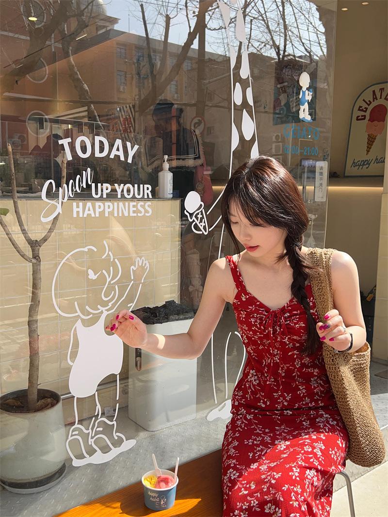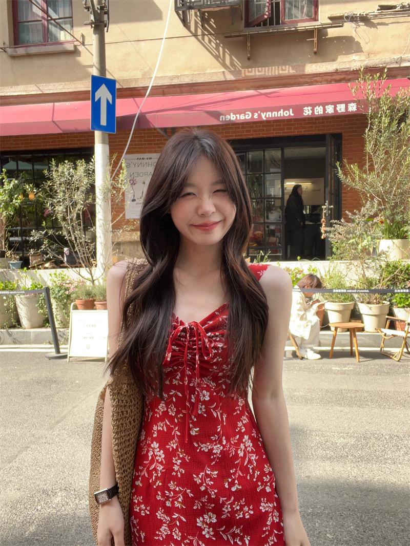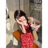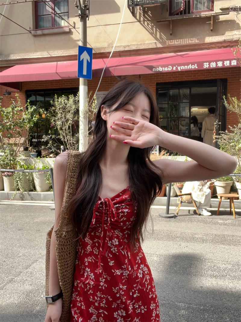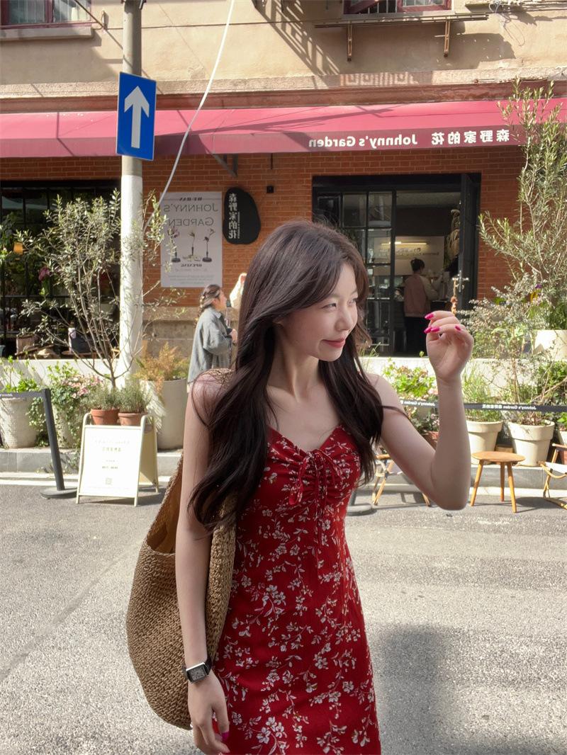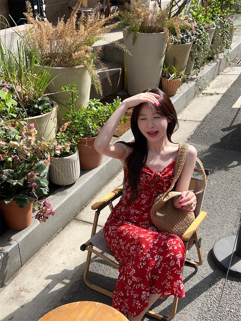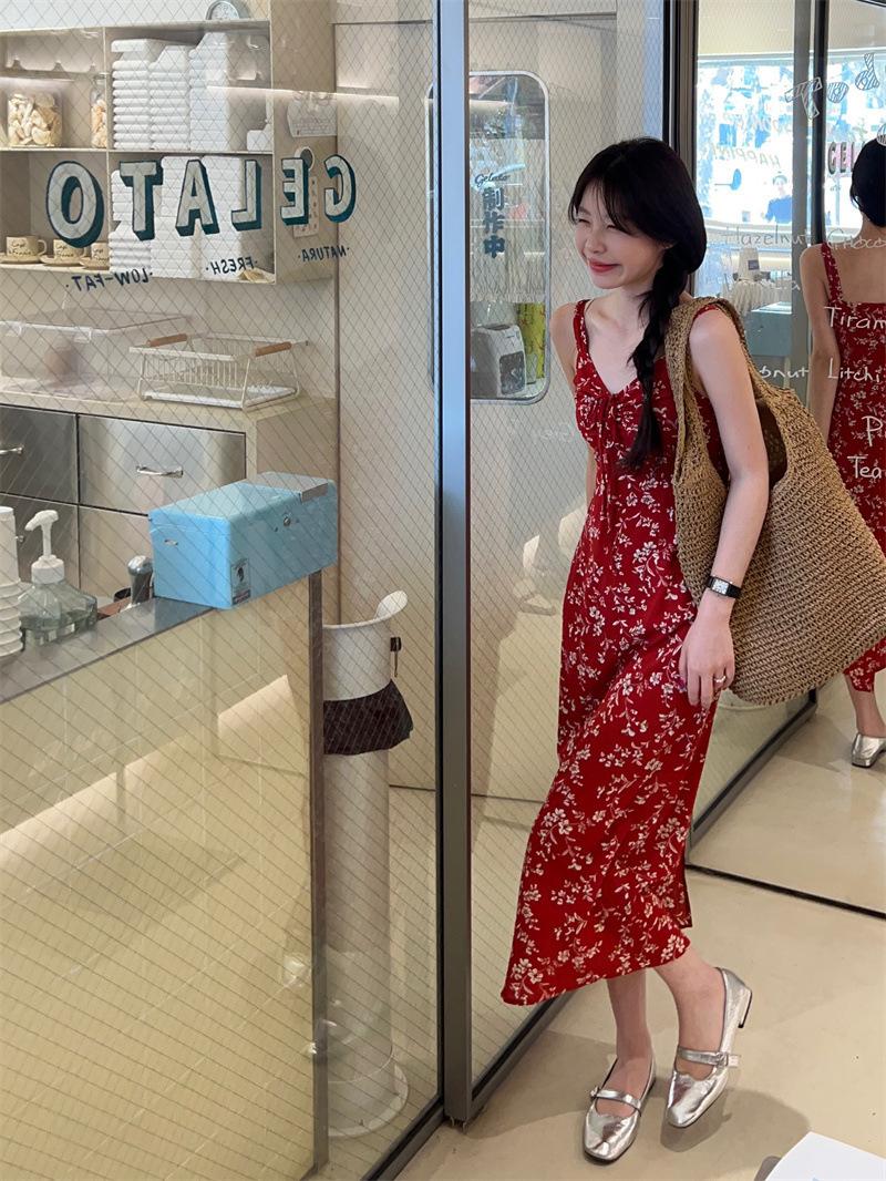 Vestido playero elegante para vacaciones de verano en la playa, vestido largo adelgazante con cintura francesa roja y flores para mujer