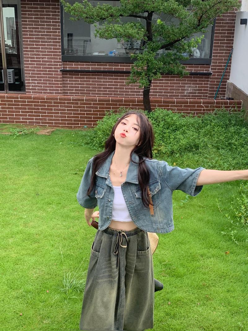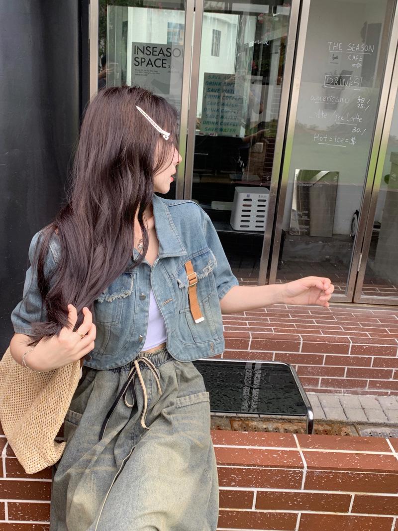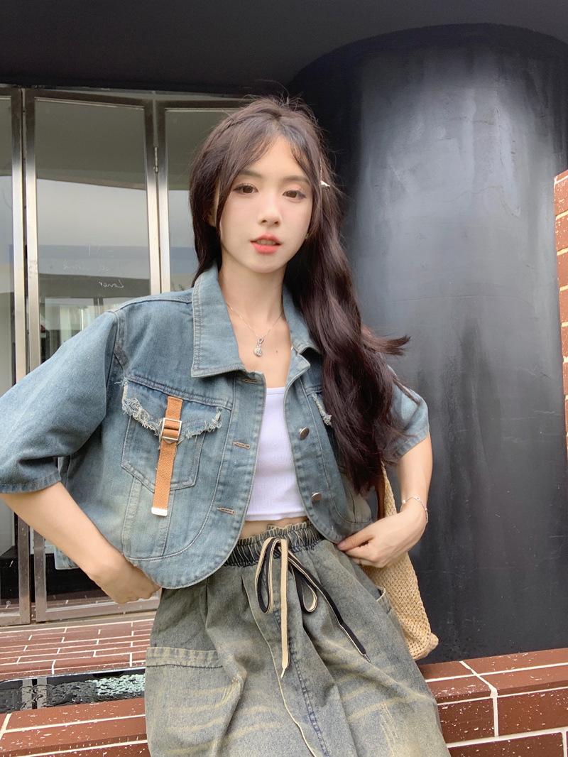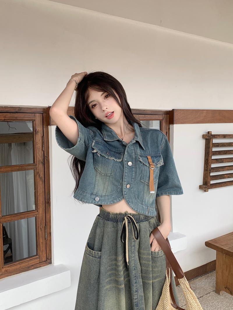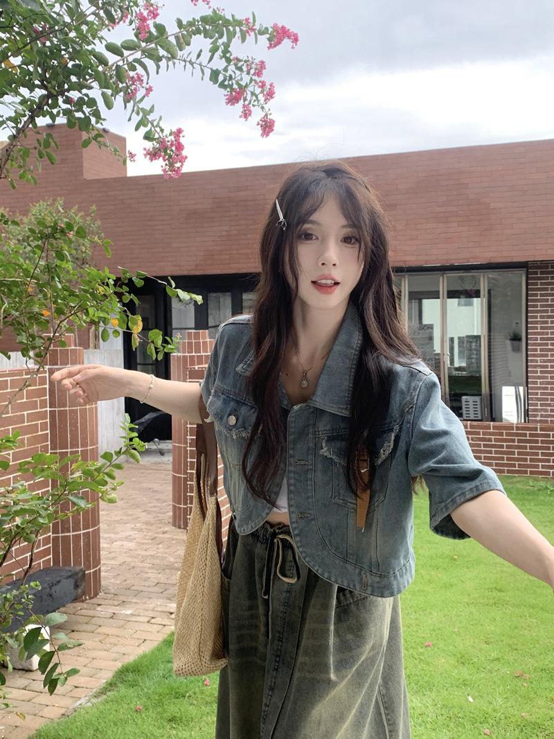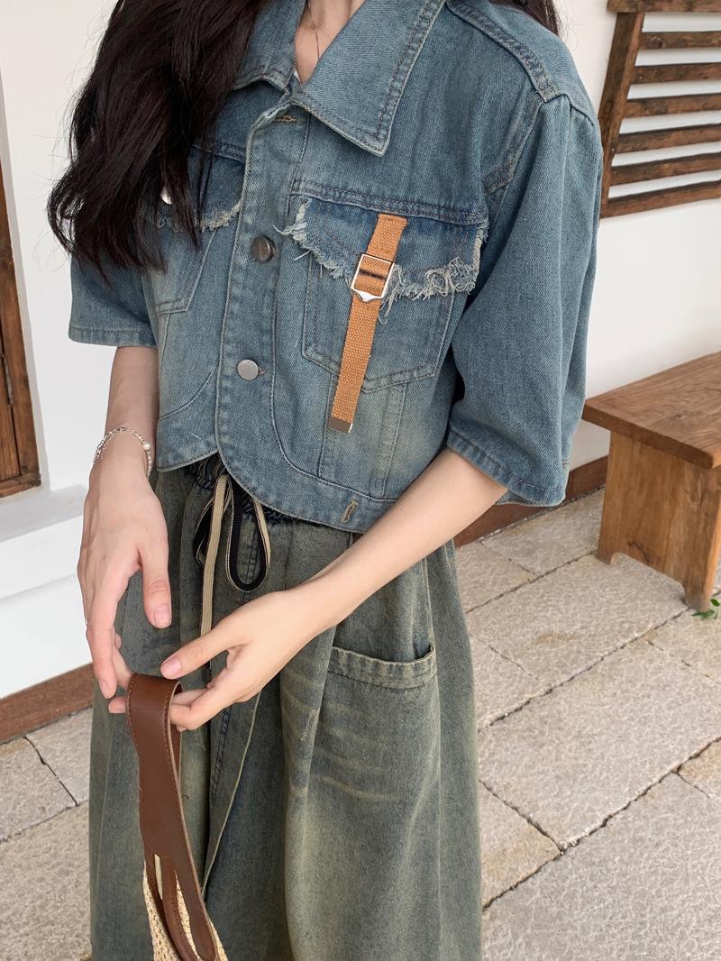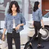 Abrigo vaquero de manga corta con diseño de estilo Chanel para mujer, holgado, adelgazante, de verano, con solapa y corte a juego.
