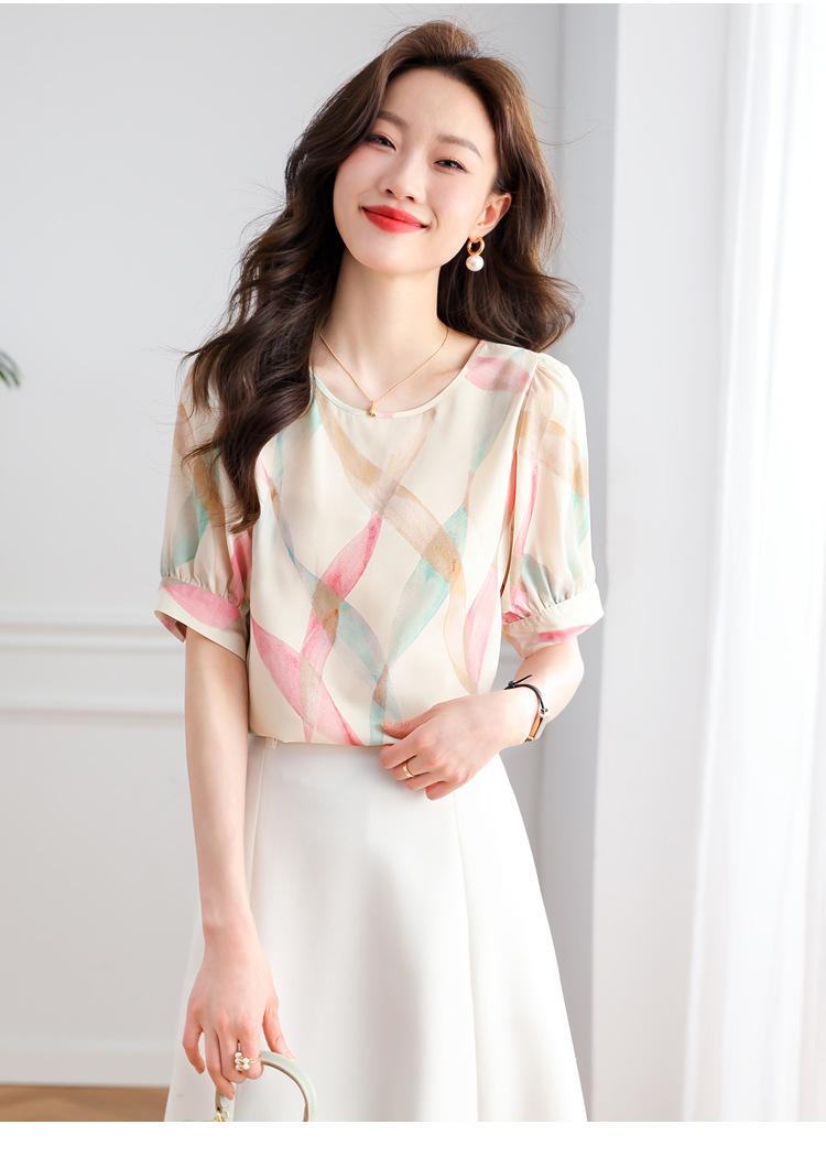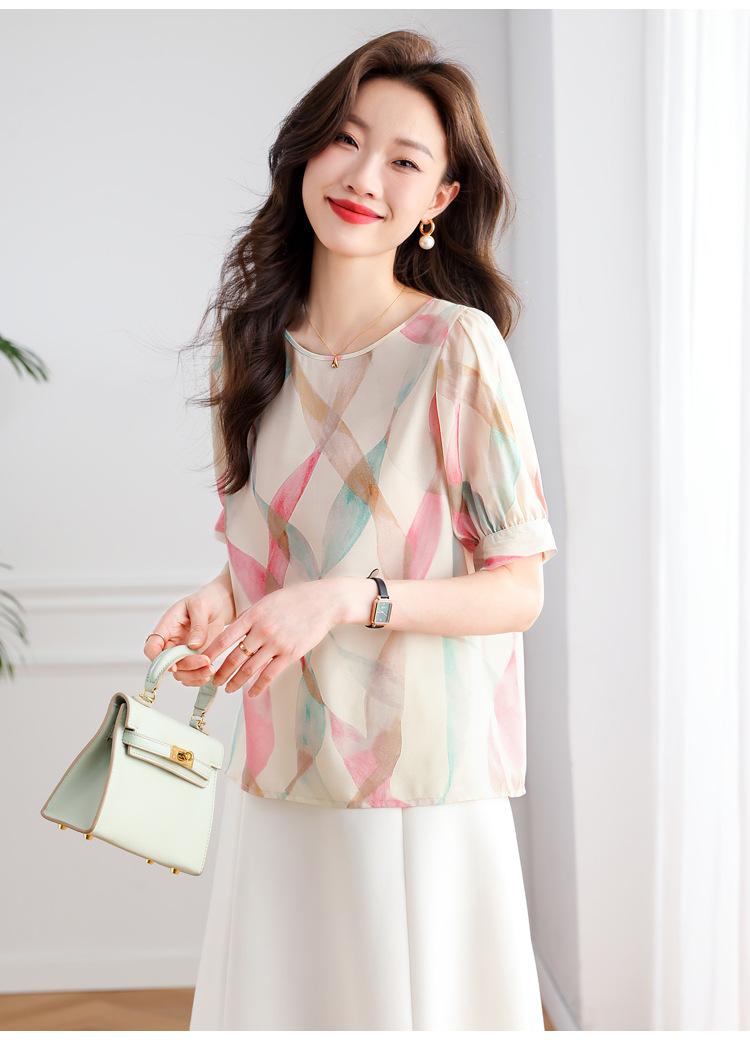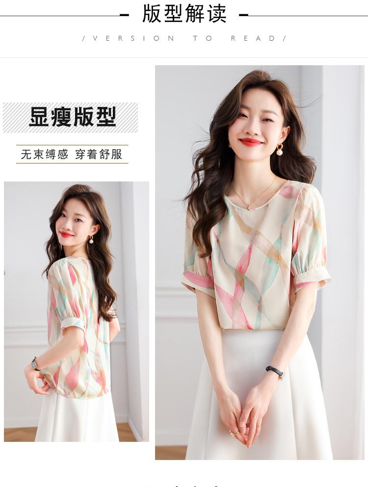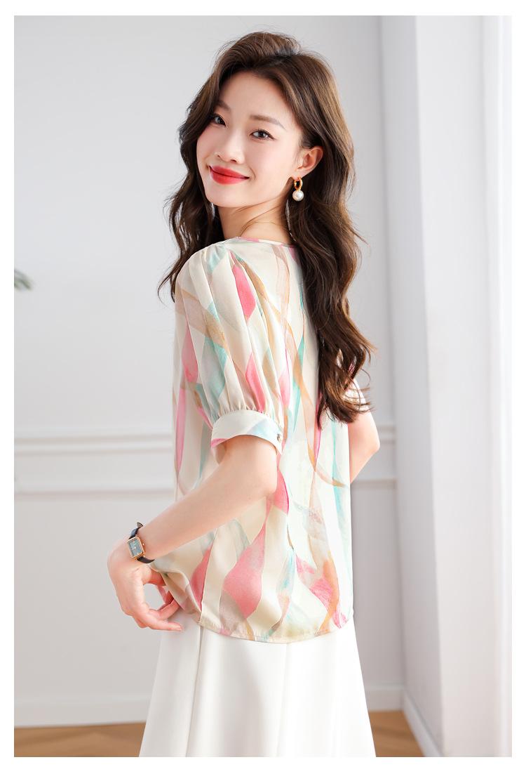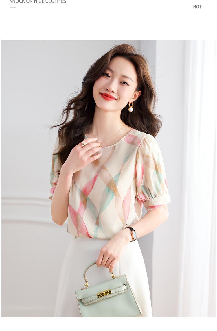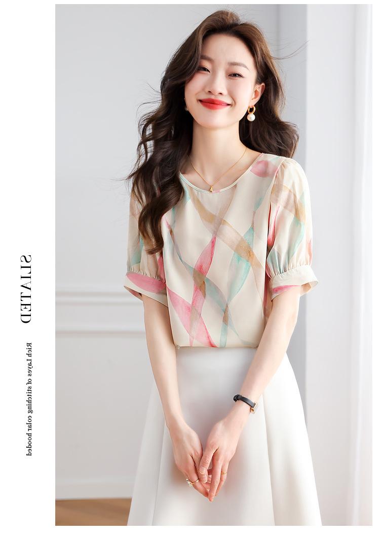 2025 Nuevo Estilo de Verano Camisa de Chifón Fina de Manga Corta para Mujer con Color Contrastante Elegante Camisita Pequeña Cuello Redondo Top Pulóver