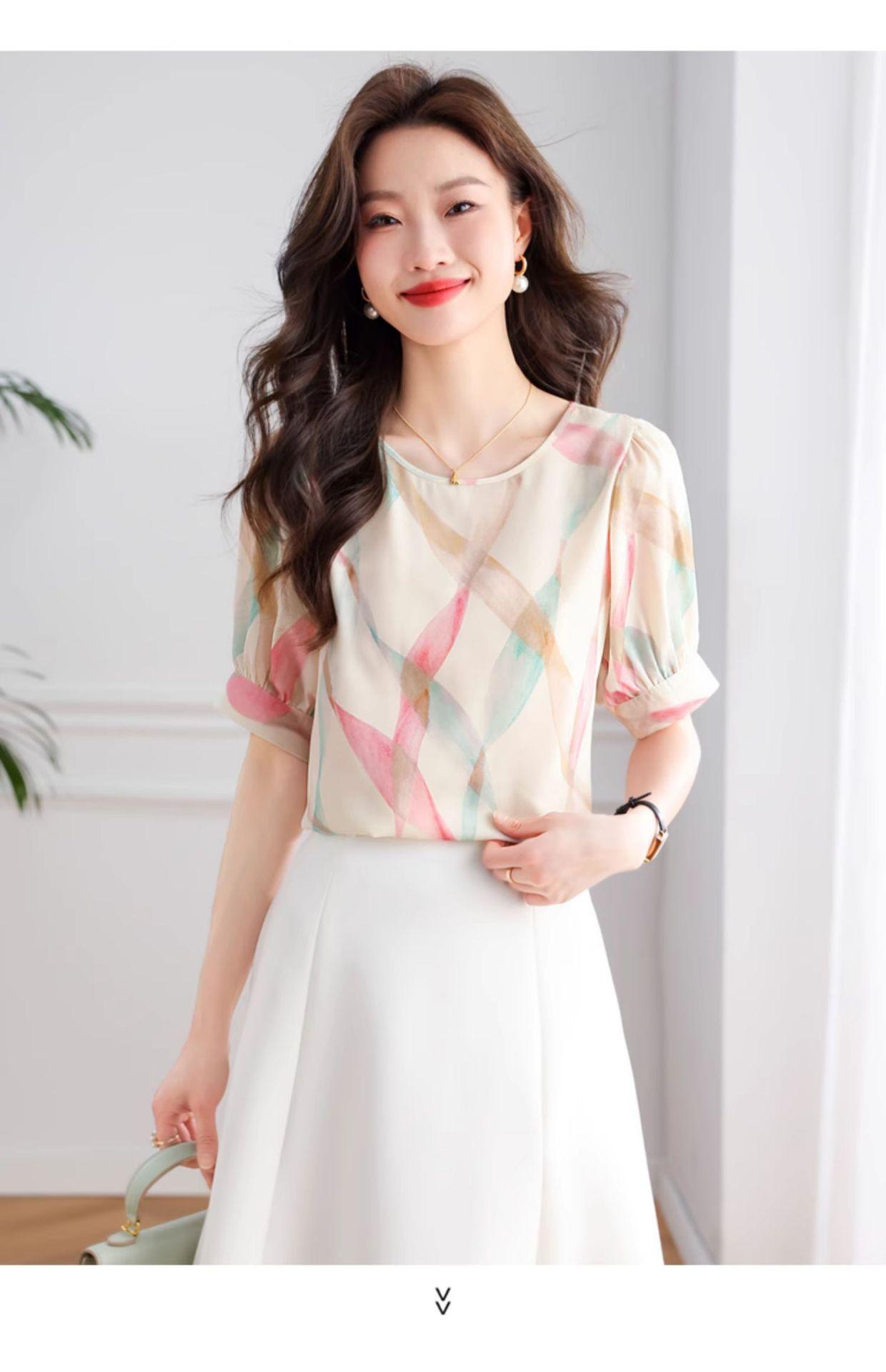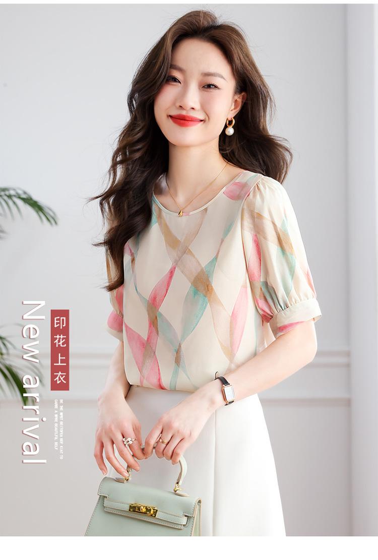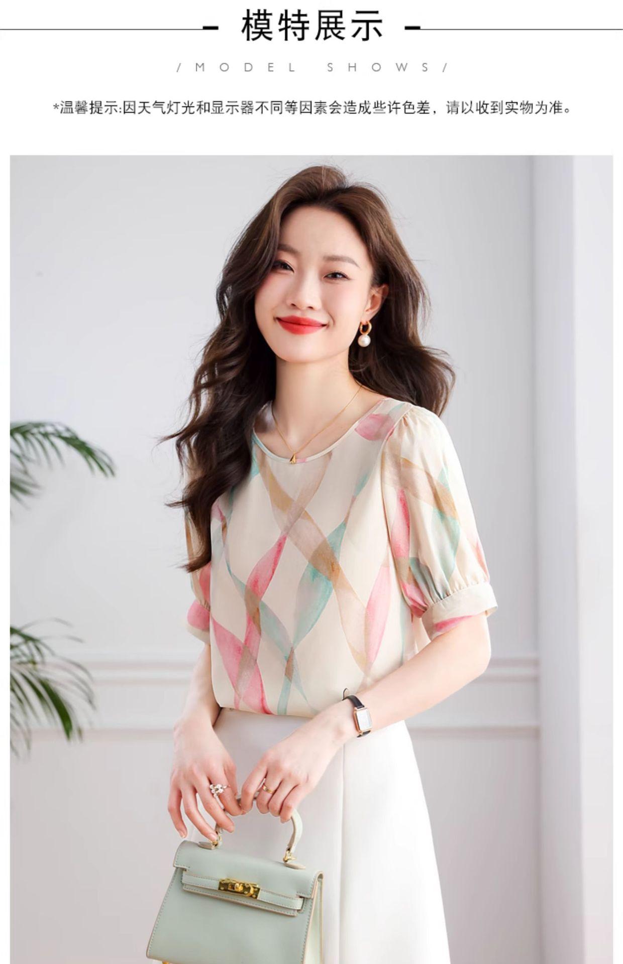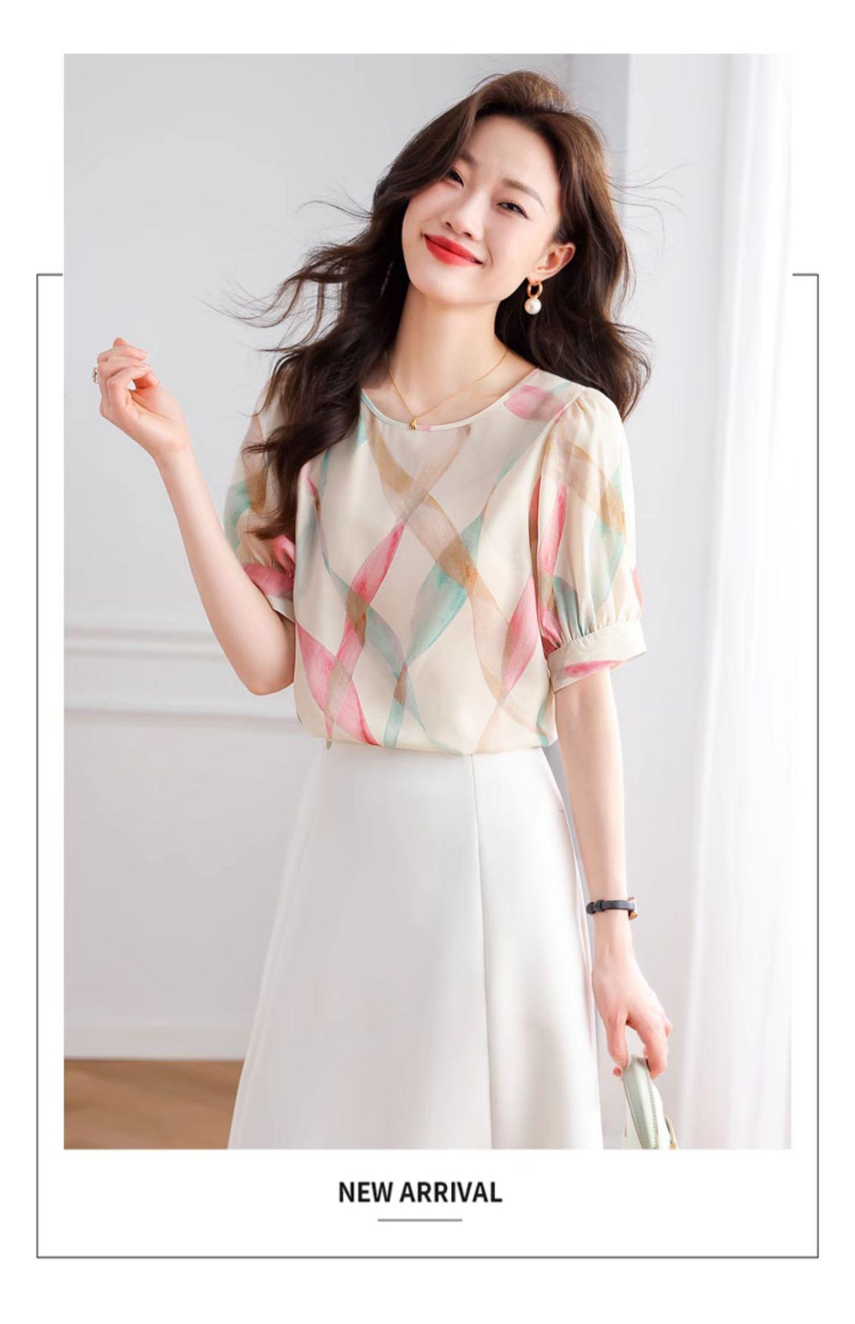 2025 Nuevo Estilo de Verano Camisa de Chifón Fina de Manga Corta para Mujer con Color Contrastante Elegante Camisita Pequeña Cuello Redondo Top Pulóver