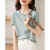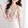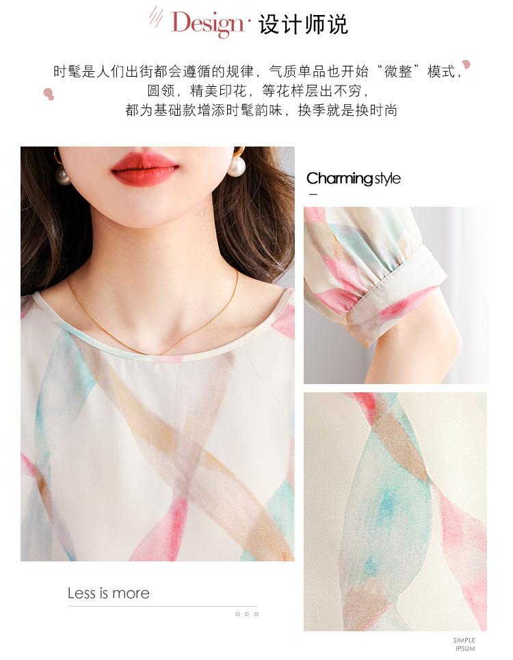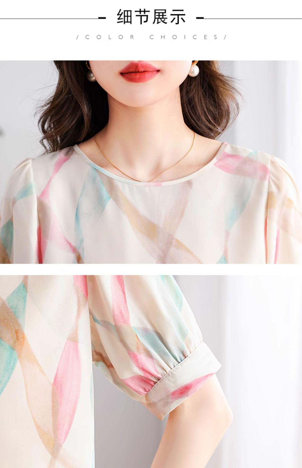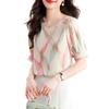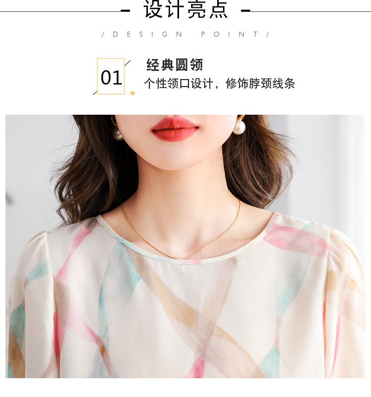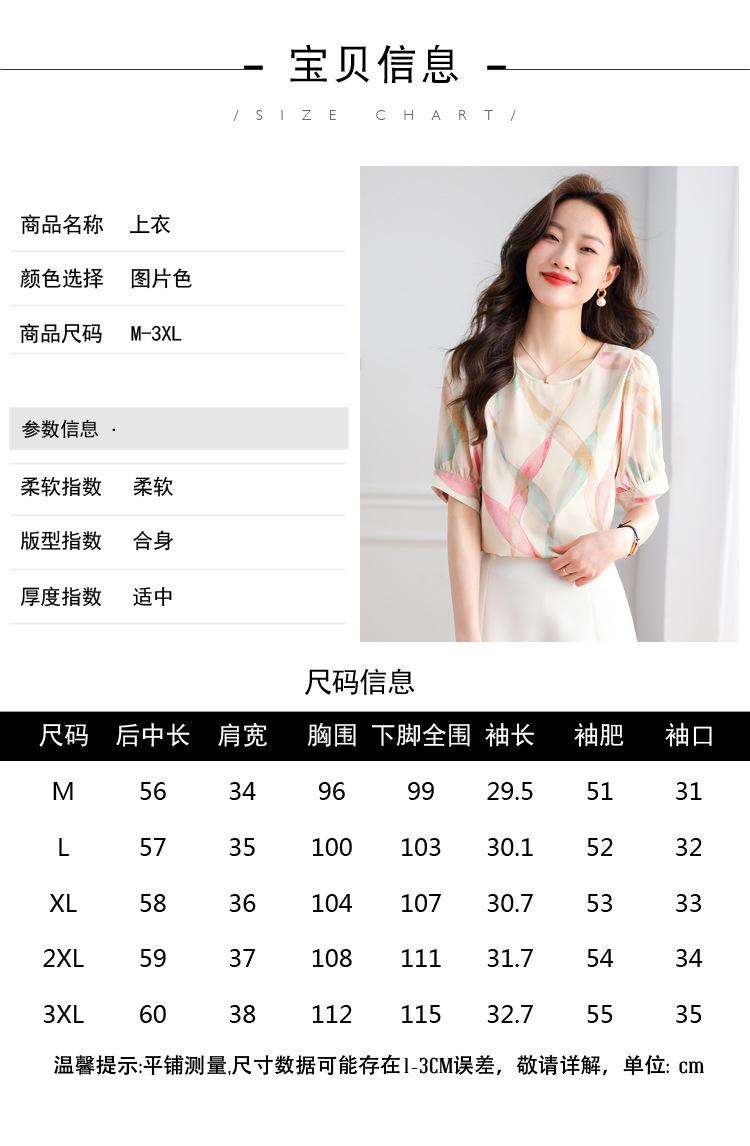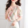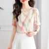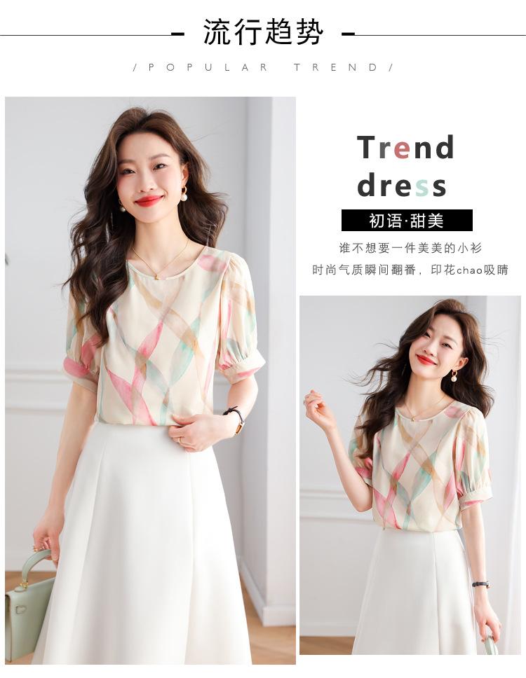 2025 Nuevo Estilo de Verano Camisa de Chifón Fina de Manga Corta para Mujer con Color Contrastante Elegante Camisita Pequeña Cuello Redondo Top Pulóver