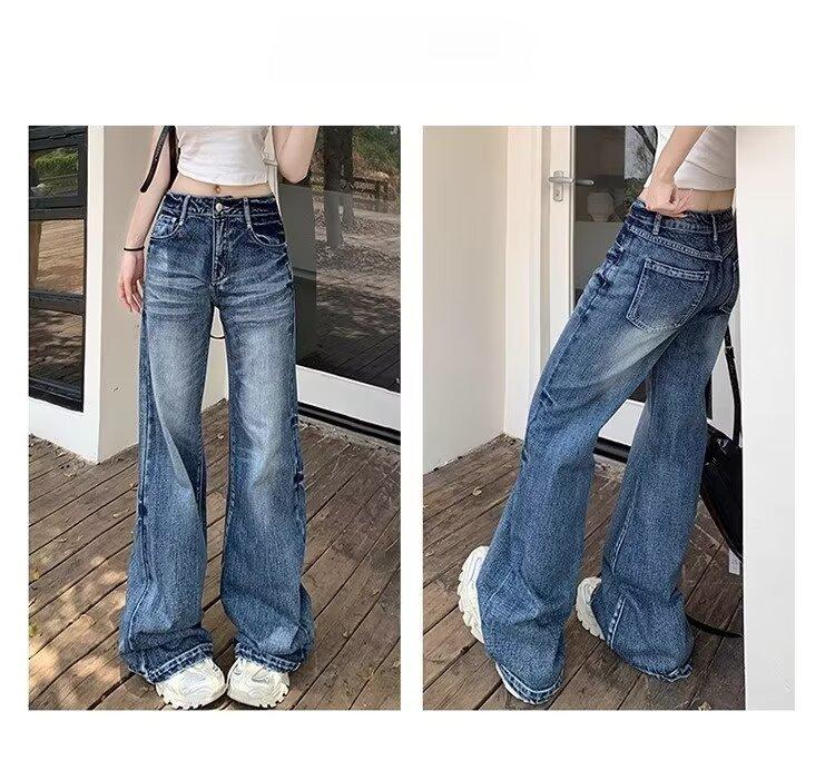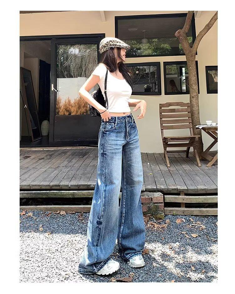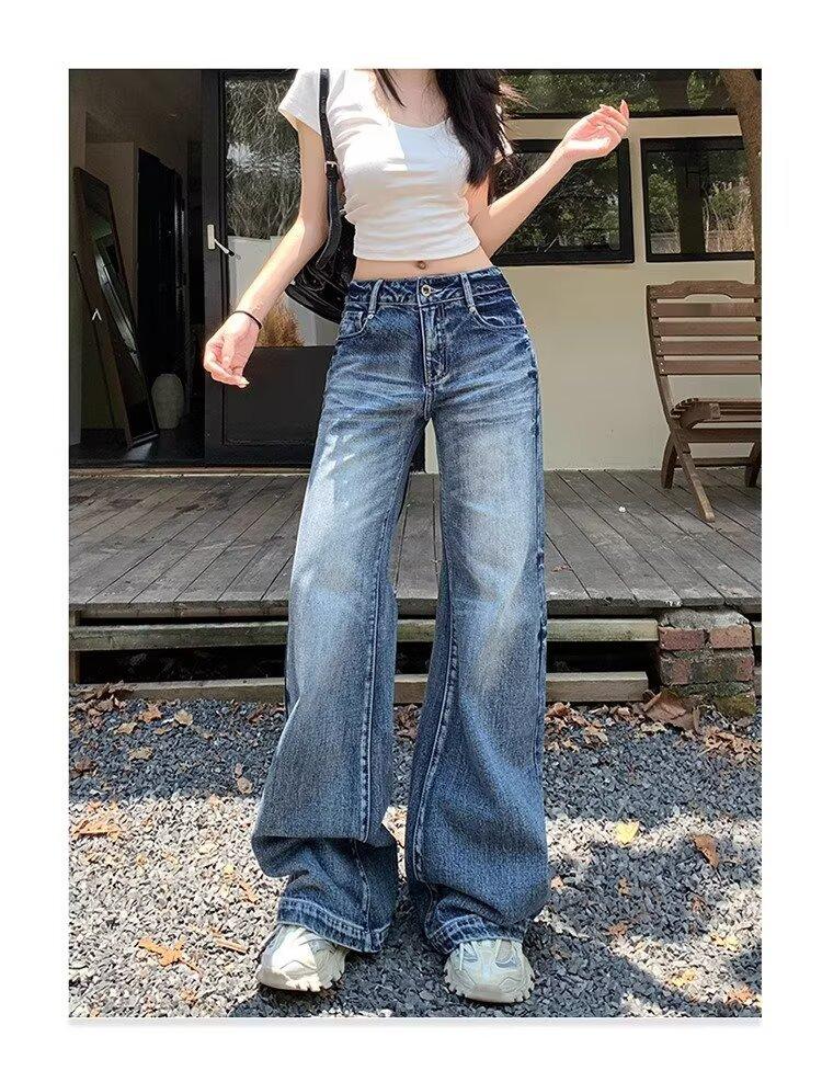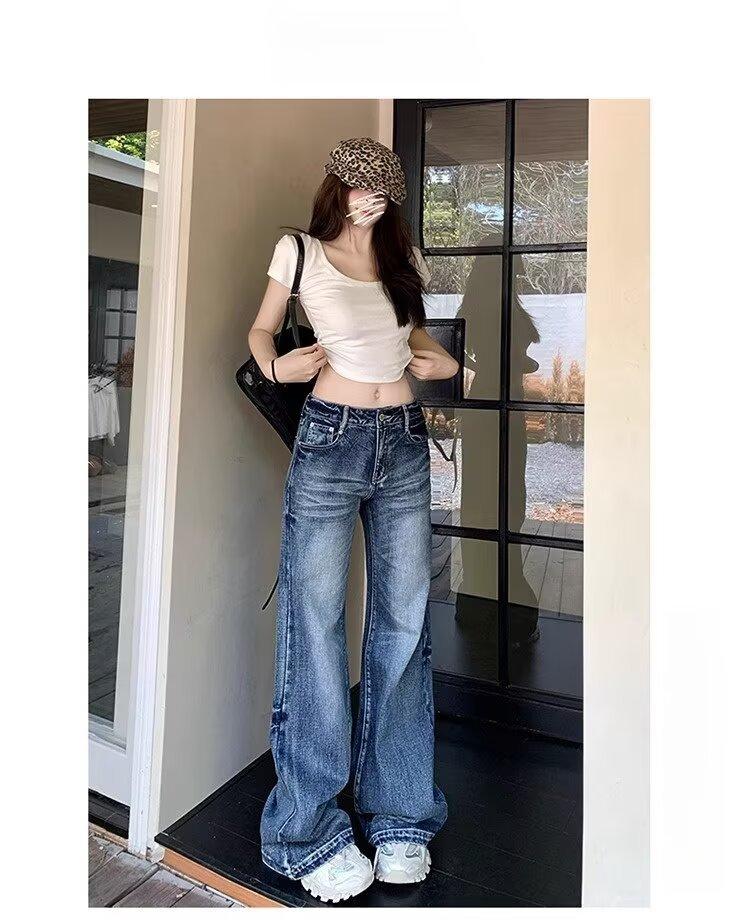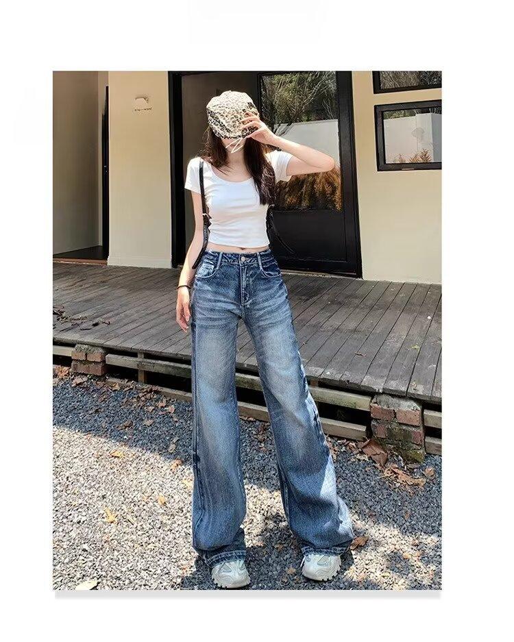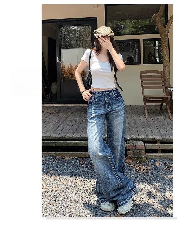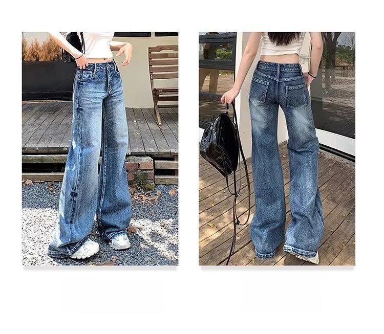 Talla grande Estilo Americano Vintage Lavado Jeans de Pierna Recta para Mujer 2025 Verano Nuevo Cintura Alta Entallados Adelgazantes Pantalones de Pierna Ancha