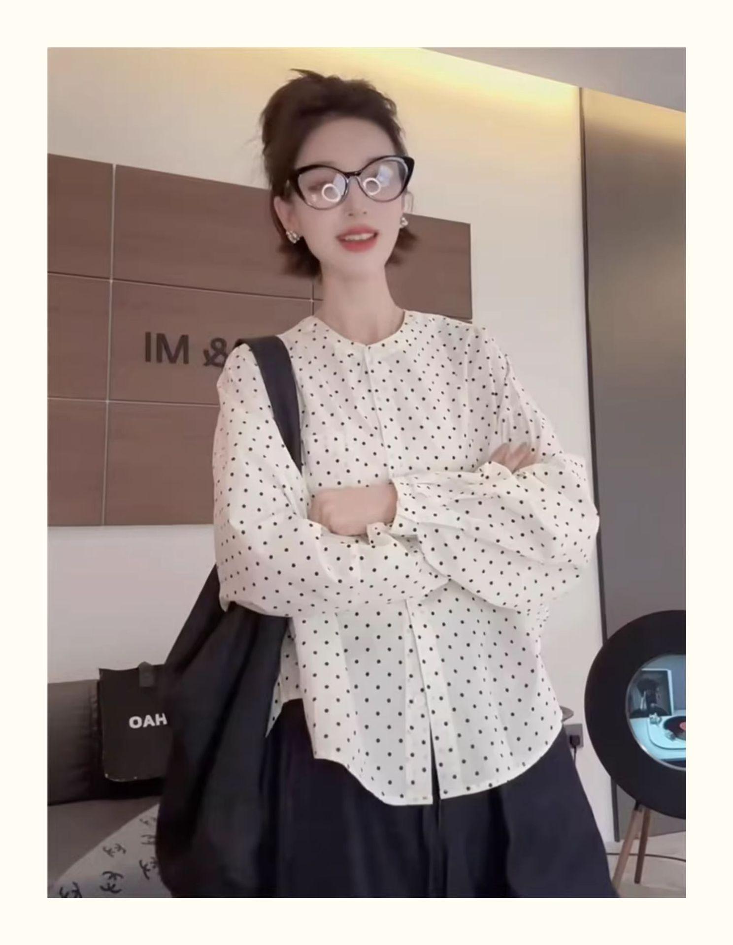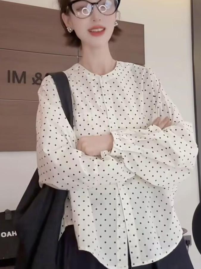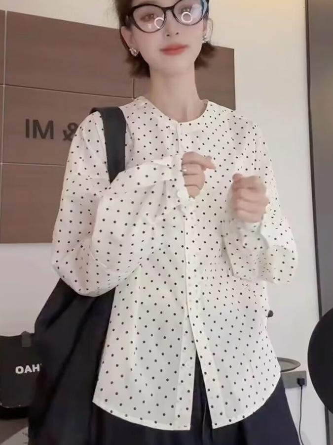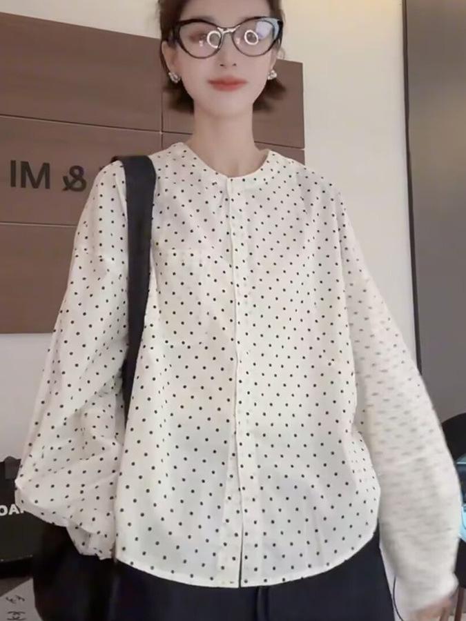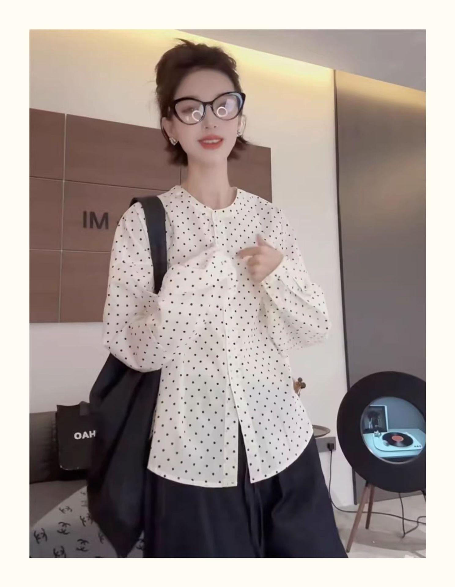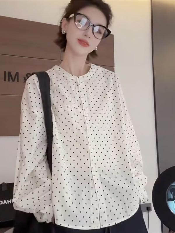 Camisa de cuello redondo dulce de moda para mujer, primavera y otoño 2025, nueva camisa coreana informal holgada con lunares, elegante y combinable.