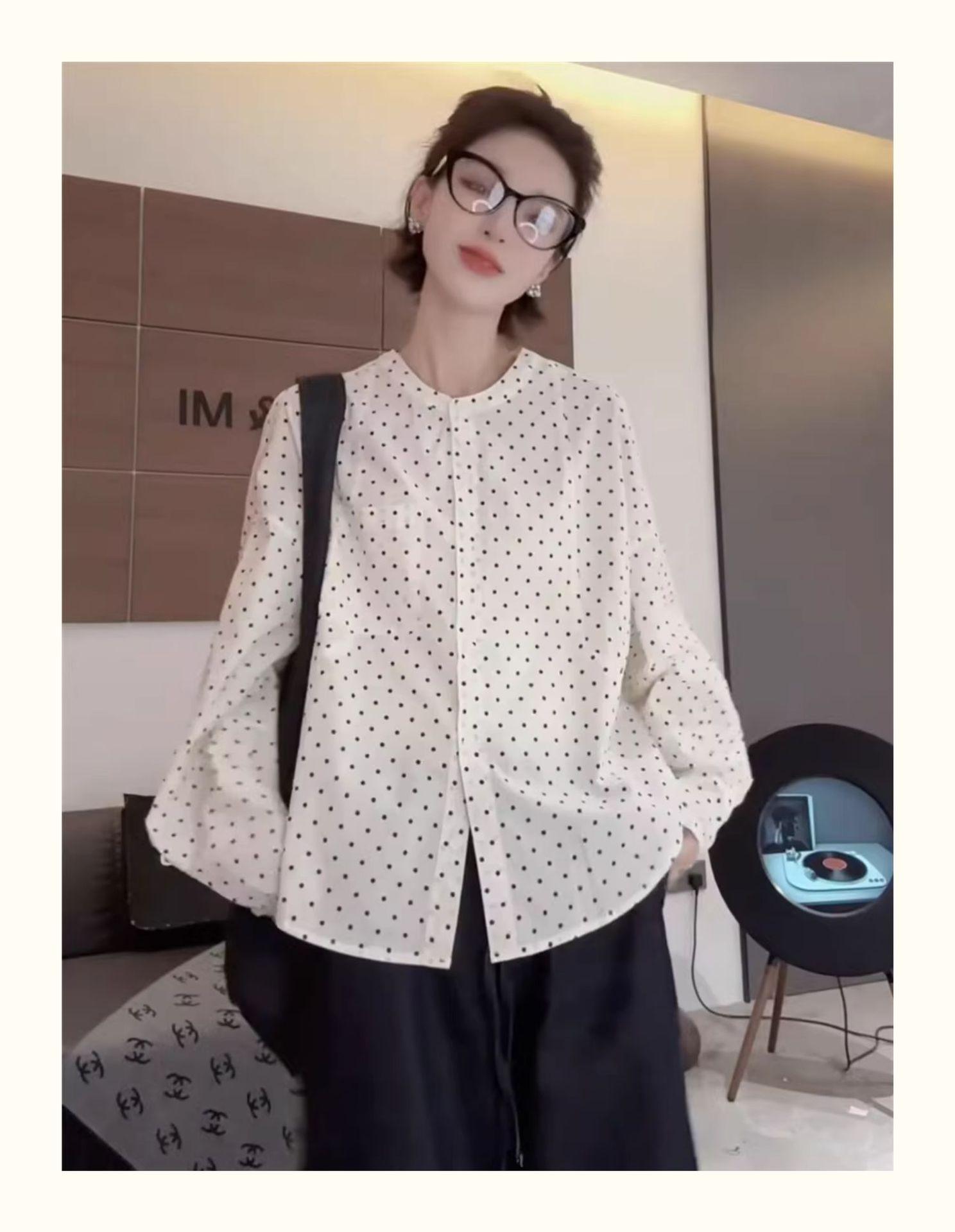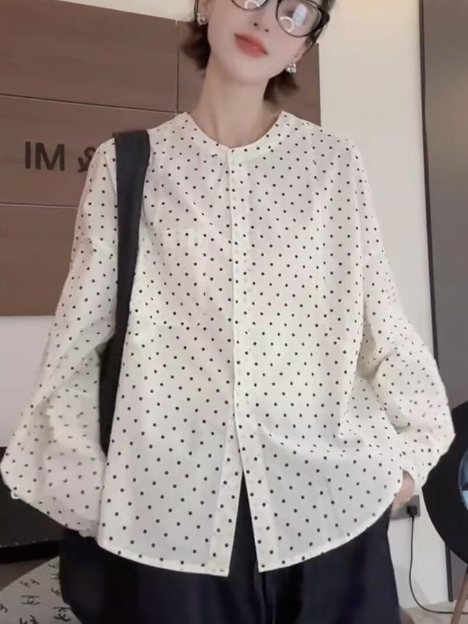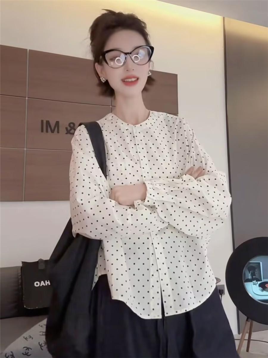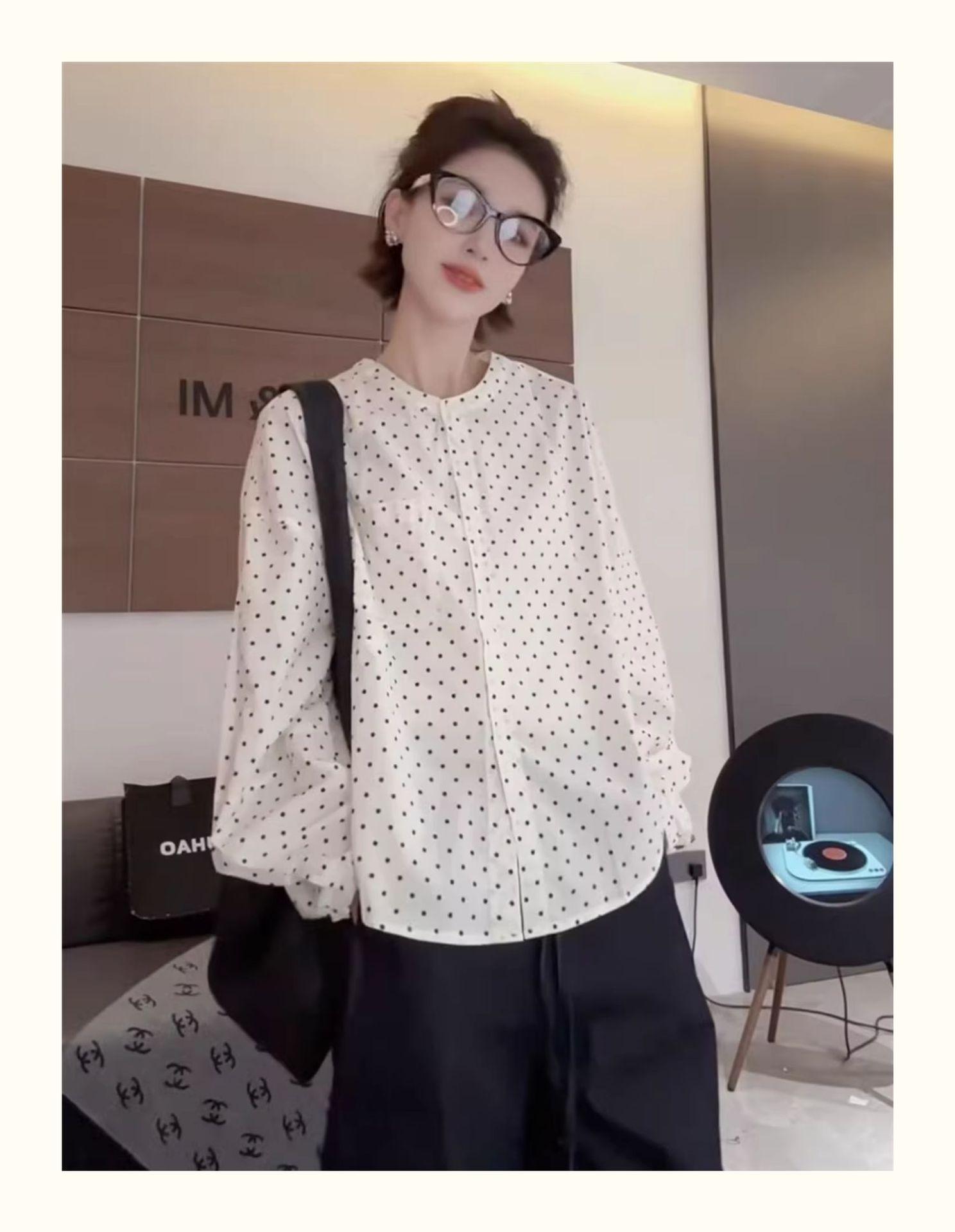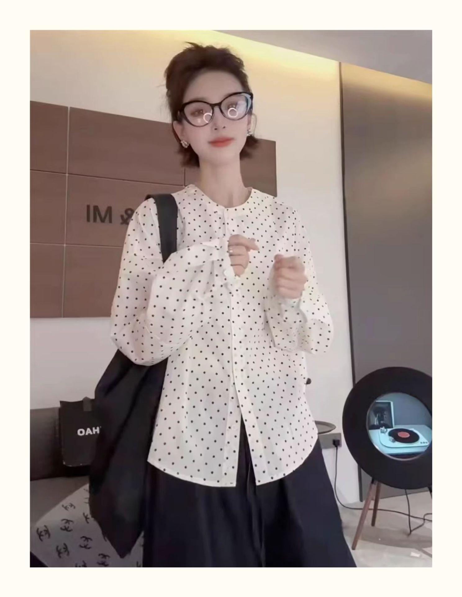 Camisa de cuello redondo dulce de moda para mujer, primavera y otoño 2025, nueva camisa coreana informal holgada con lunares, elegante y combinable.