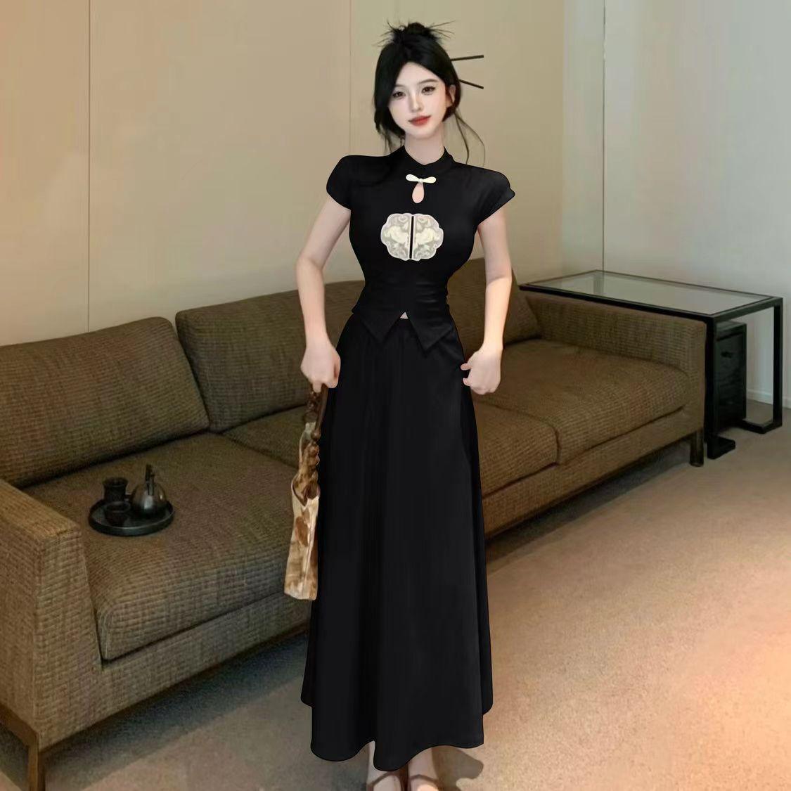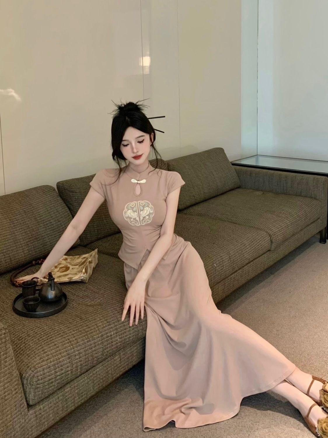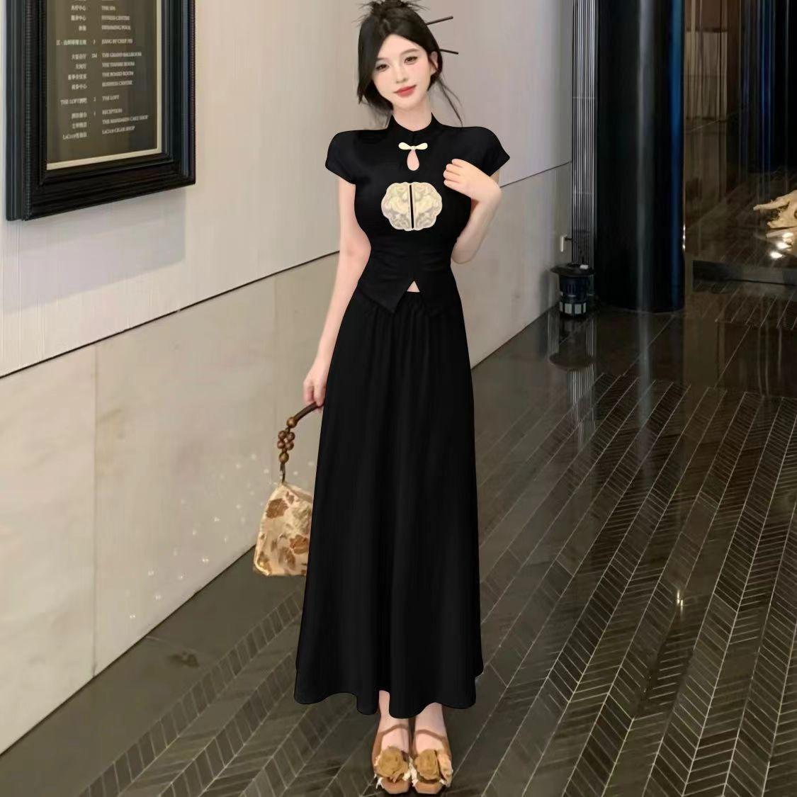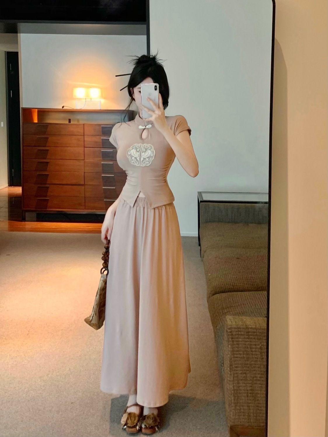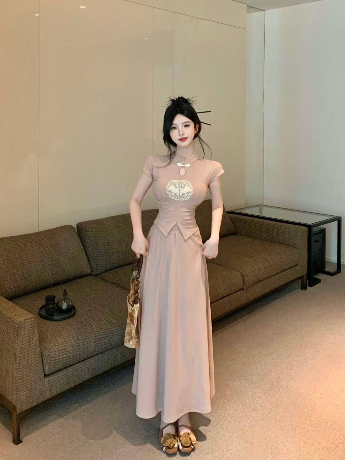Traje de manga corta con hebilla bordada estilo nacional chino 2025 para mujer, primavera y verano, nuevo conjunto de dos piezas con top ajustado y vestido largo.