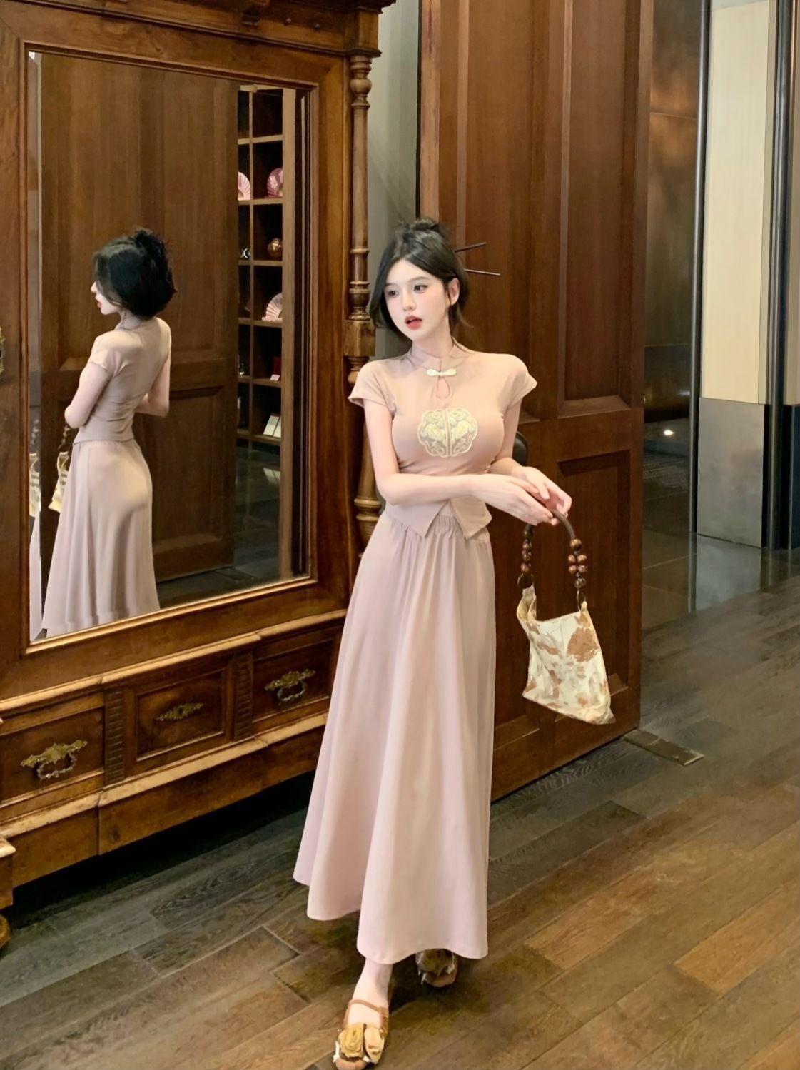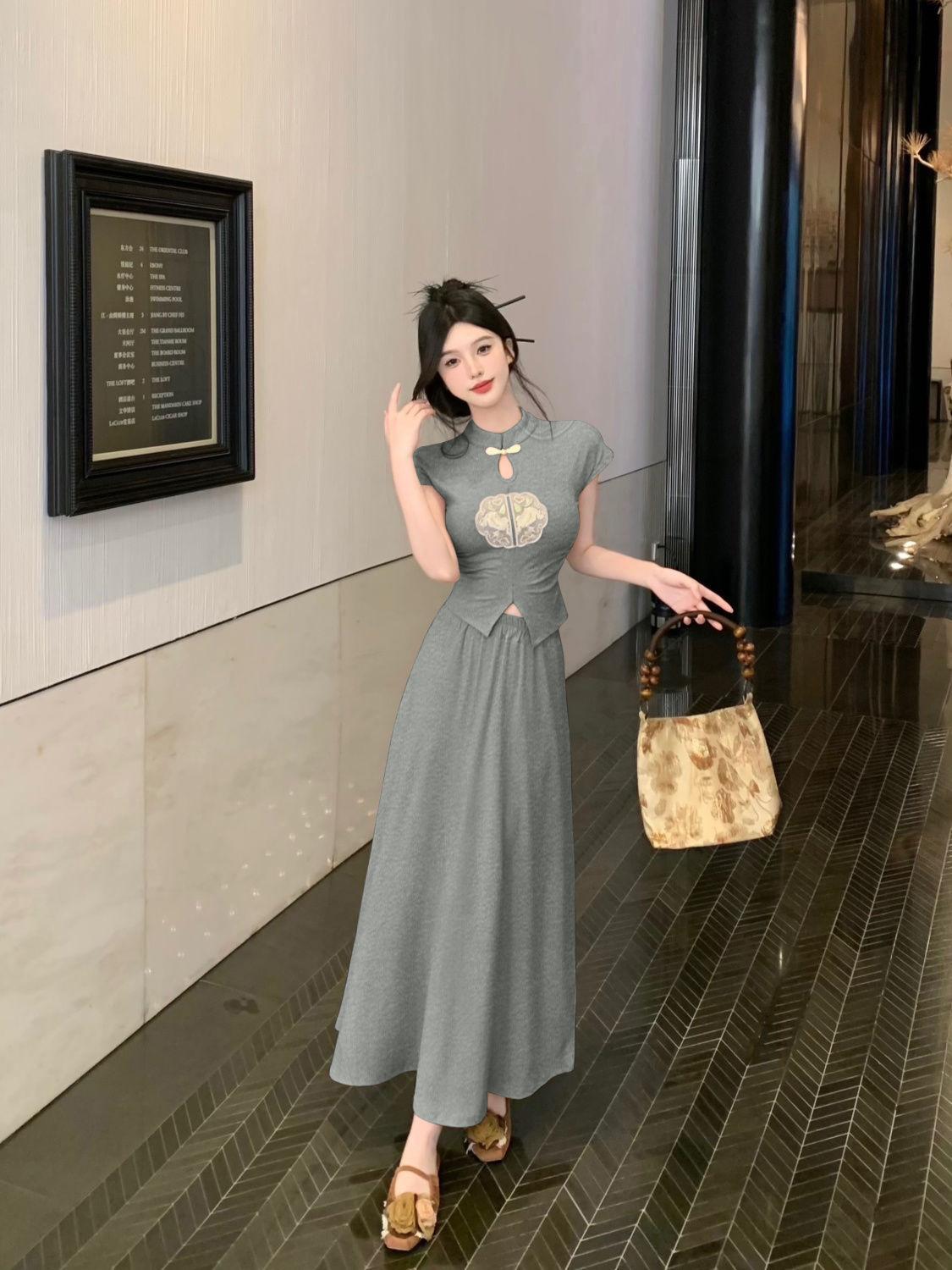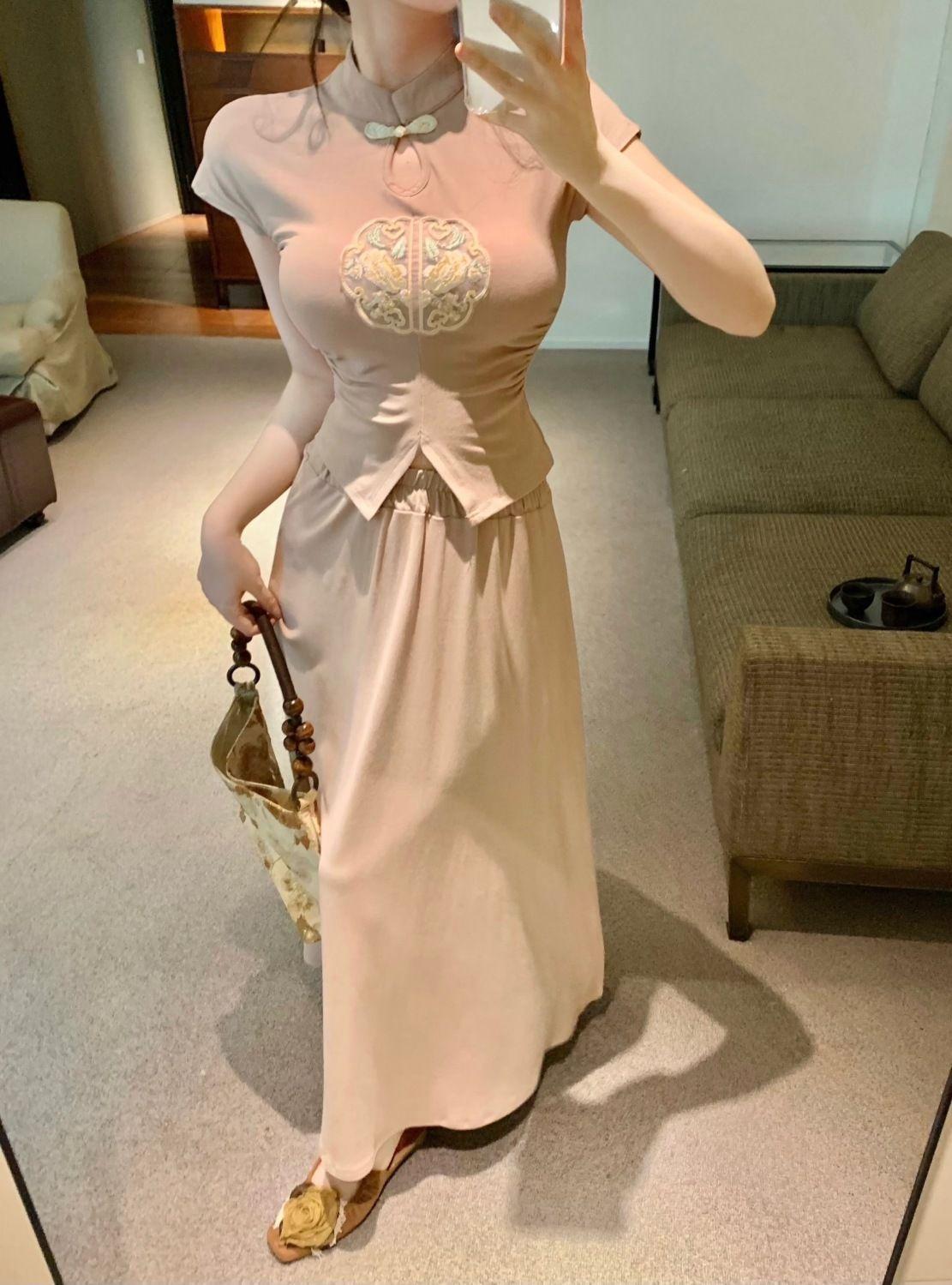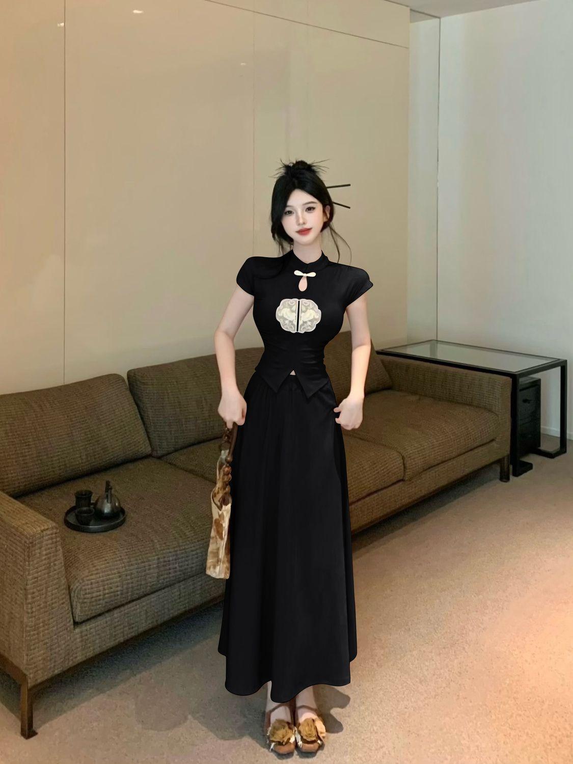 Traje de manga corta con hebilla bordada estilo nacional chino 2025 para mujer, primavera y verano, nuevo conjunto de dos piezas con top ajustado y vestido largo.