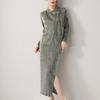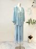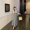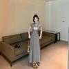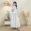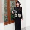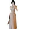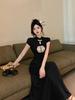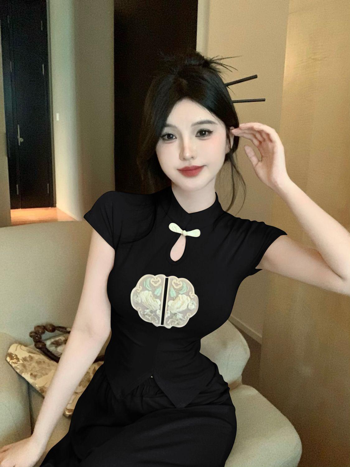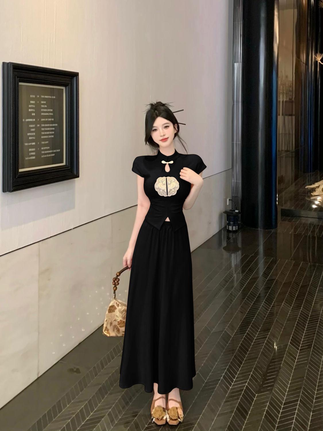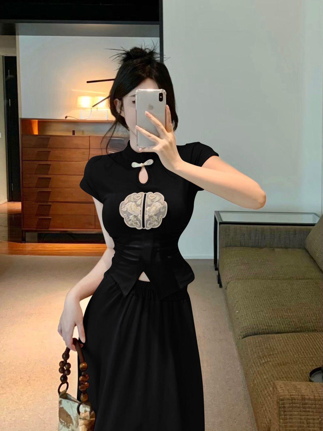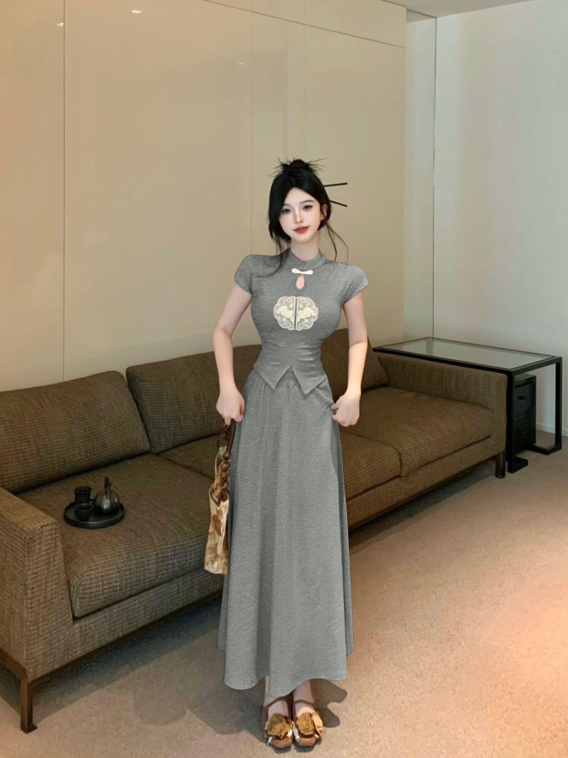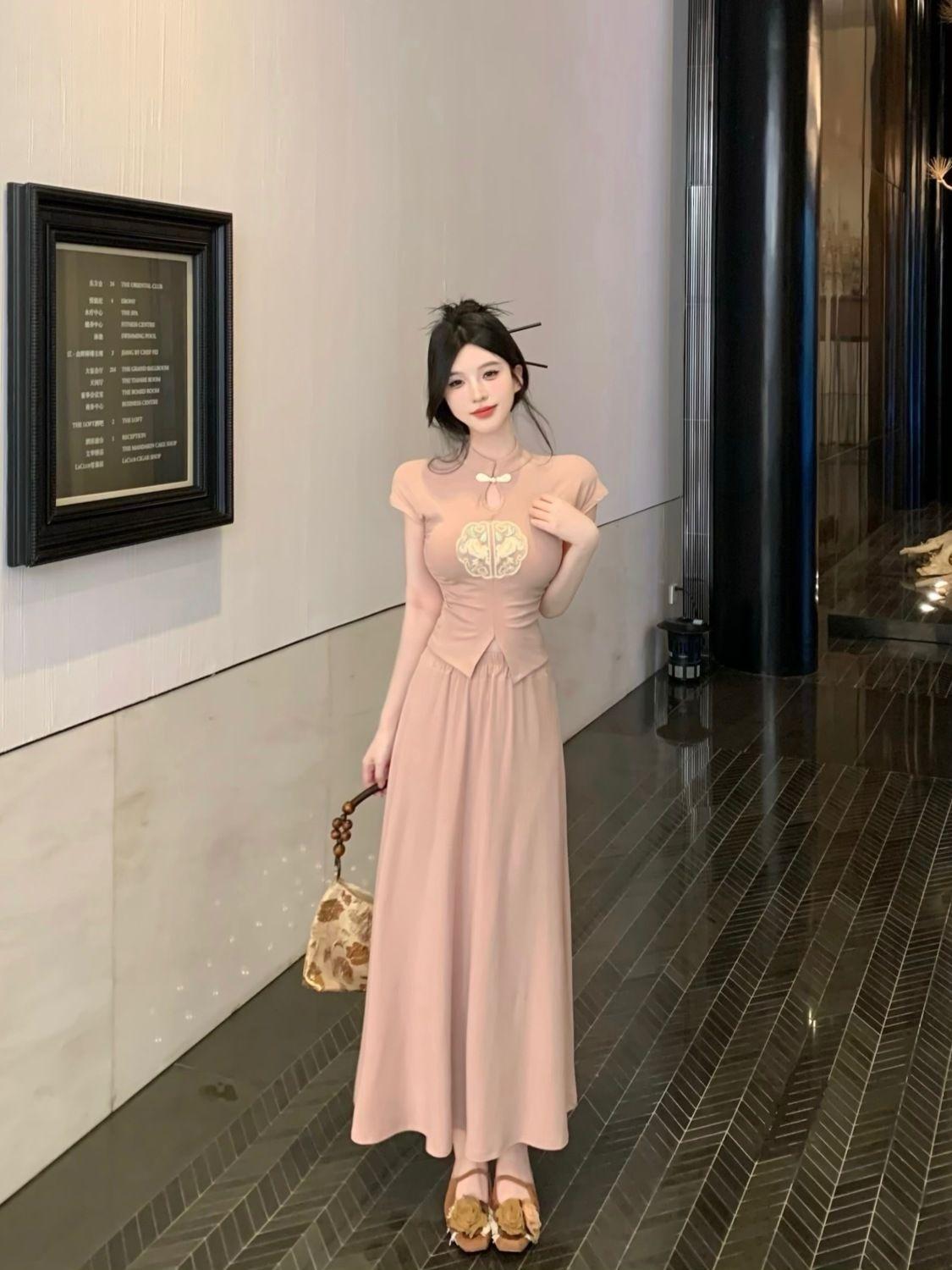 Traje de manga corta con hebilla bordada estilo nacional chino 2025 para mujer, primavera y verano, nuevo conjunto de dos piezas con top ajustado y vestido largo.