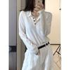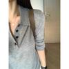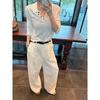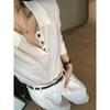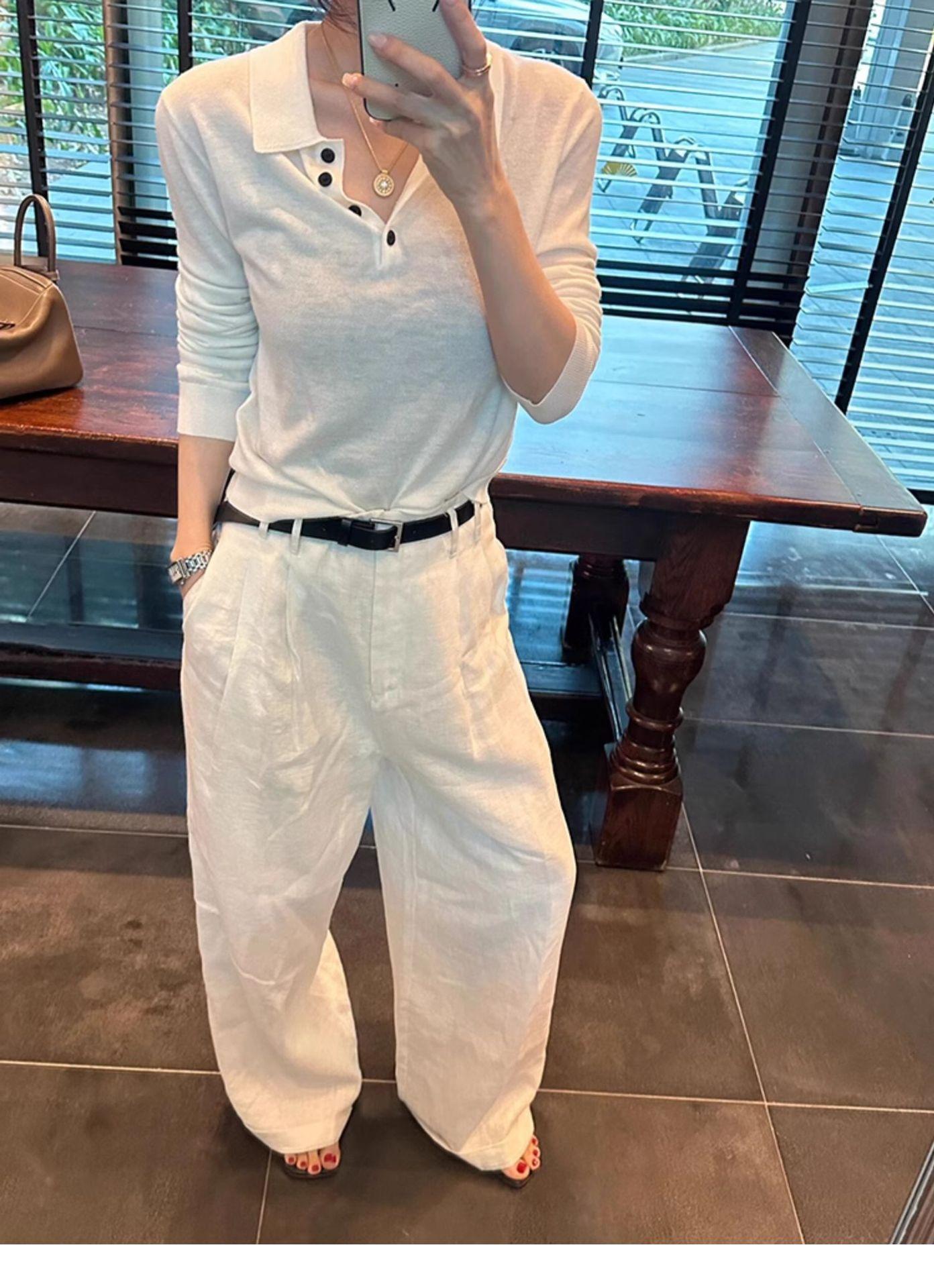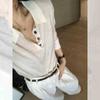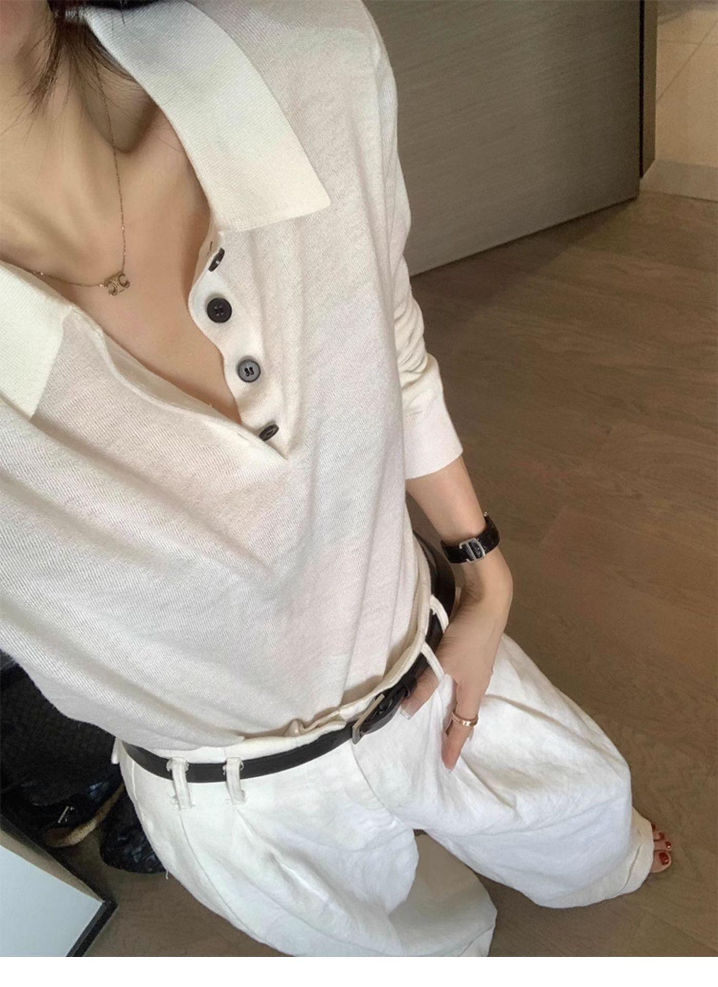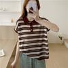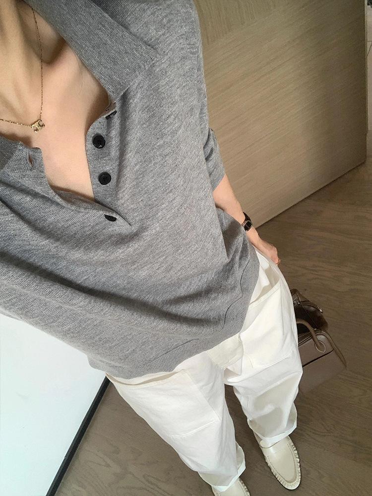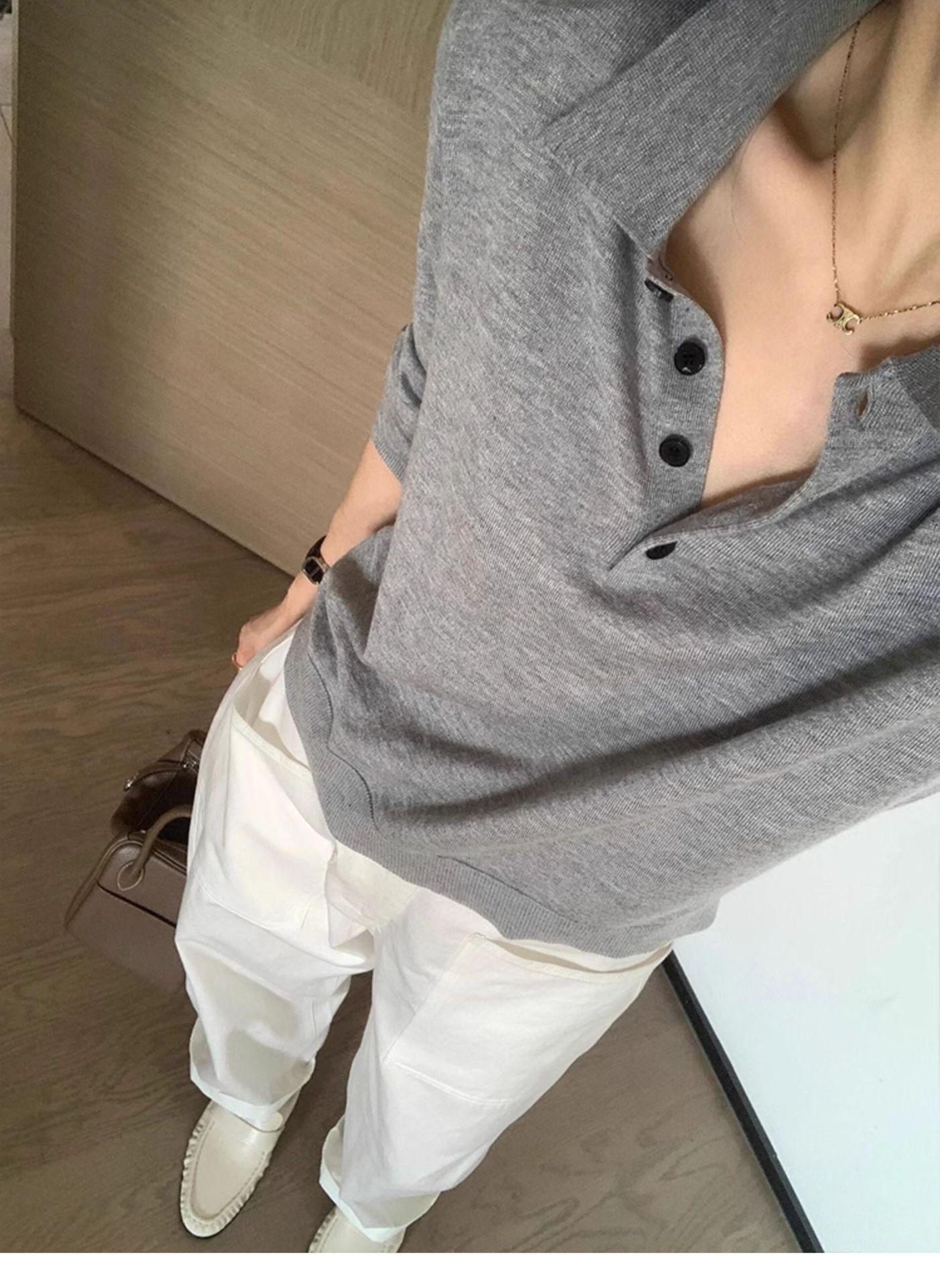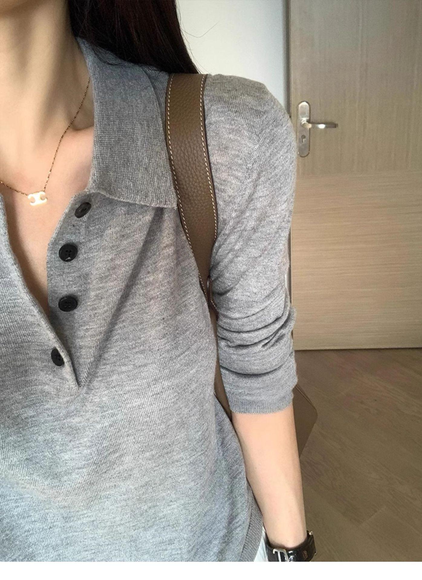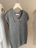 Camiseta corta de manga corta con cuello polo gris estilo francés y hombros descubiertos de seda helada para mujer, top de punto fino de verano