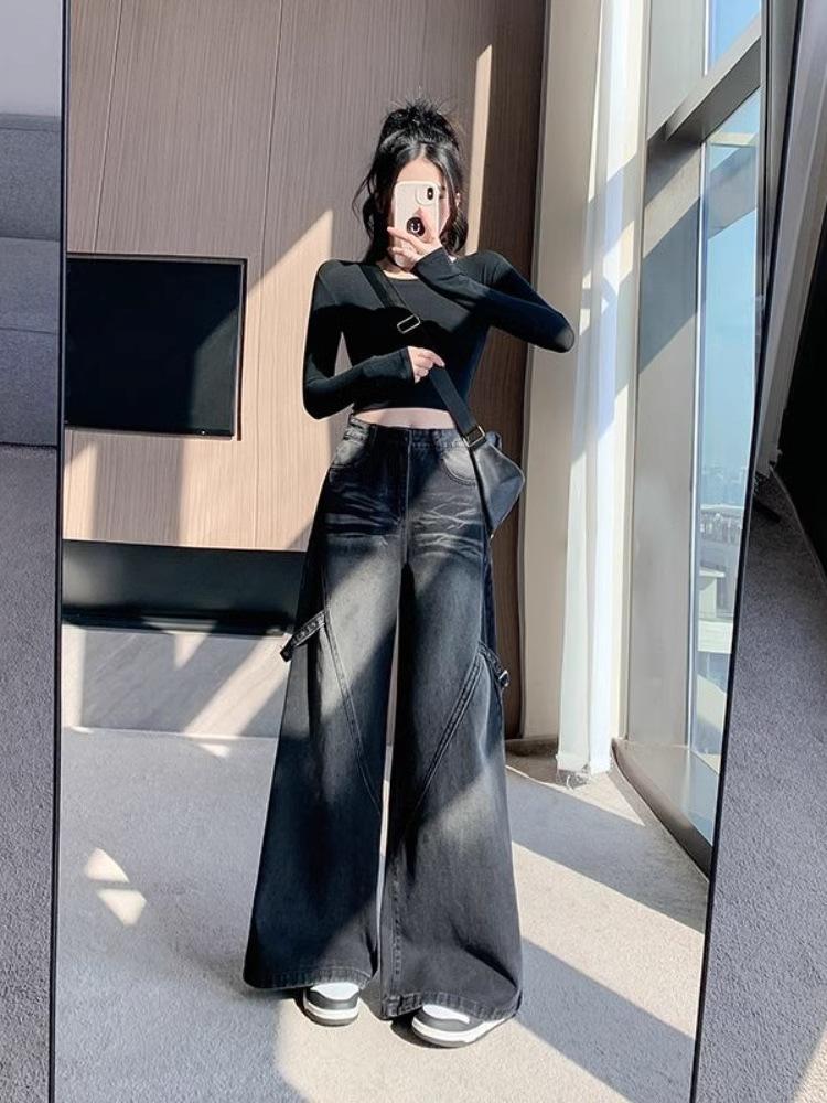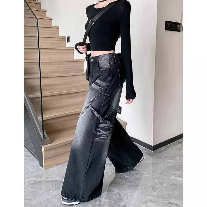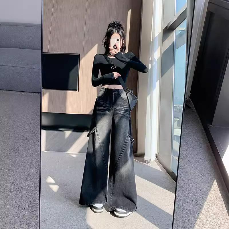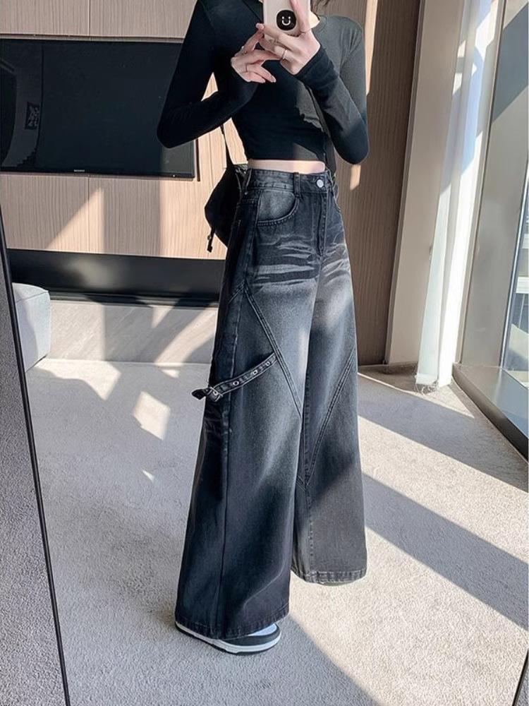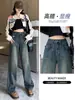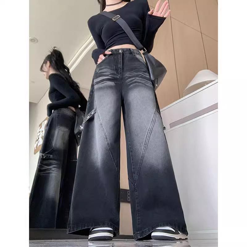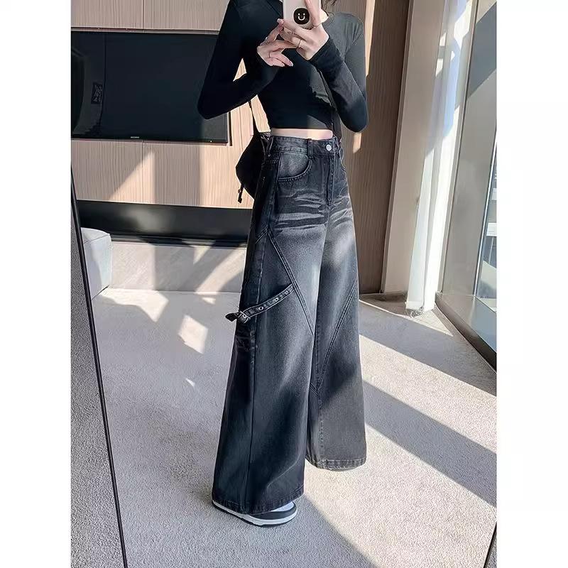Pantalones vaqueros rectos estilo americano con diseño de tiras retro para mujer, pantalones holgados adelgazantes de calle alta con pierna ancha, novedad de 2024
