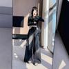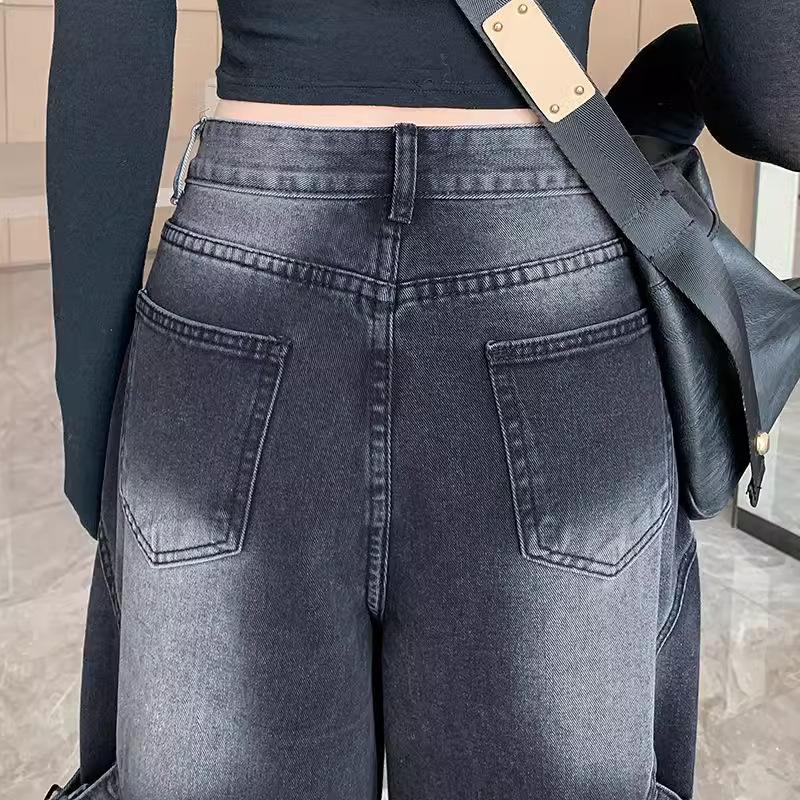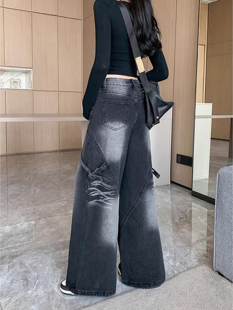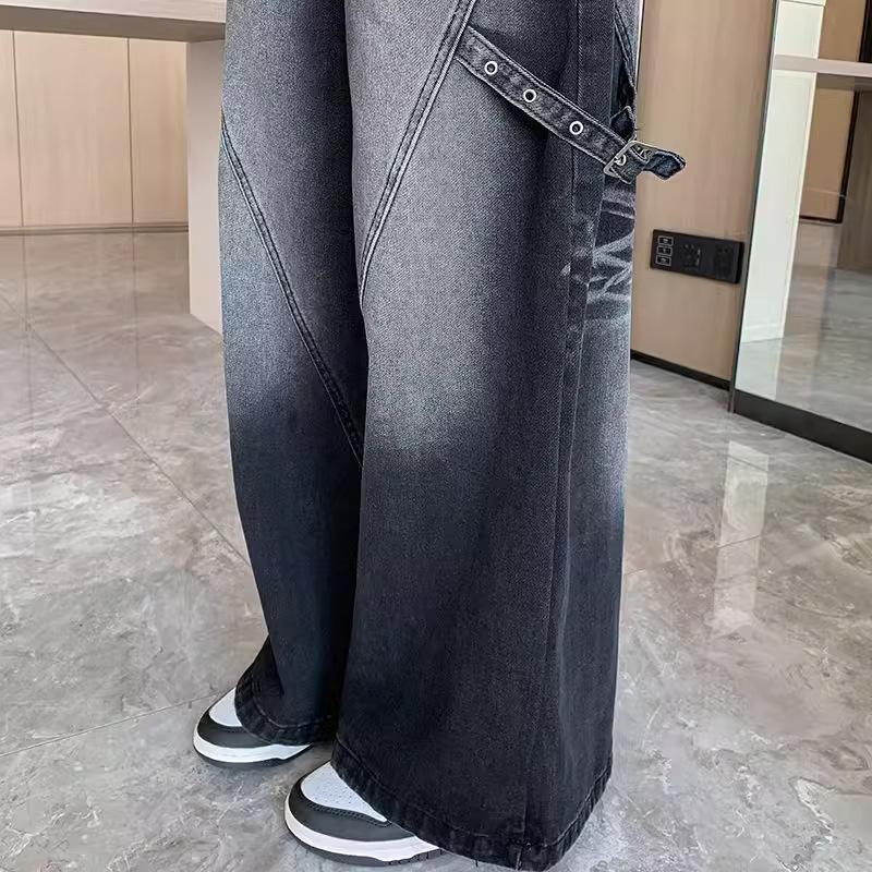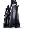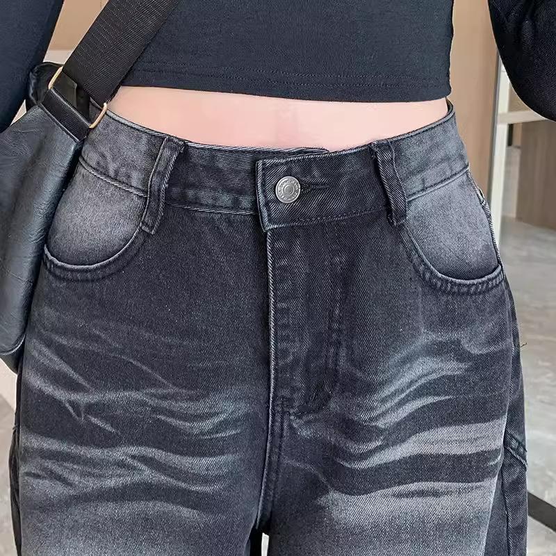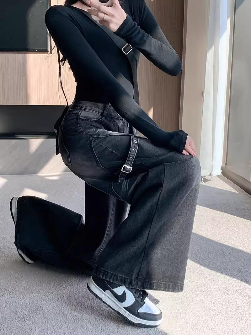 Pantalones vaqueros rectos estilo americano con diseño de tiras retro para mujer, pantalones holgados adelgazantes de calle alta con pierna ancha, novedad de 2024