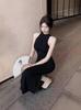 Vestido negro elegante y dulce de alta sociedad francesa con volantes y cintura alta y hombros estrechos.