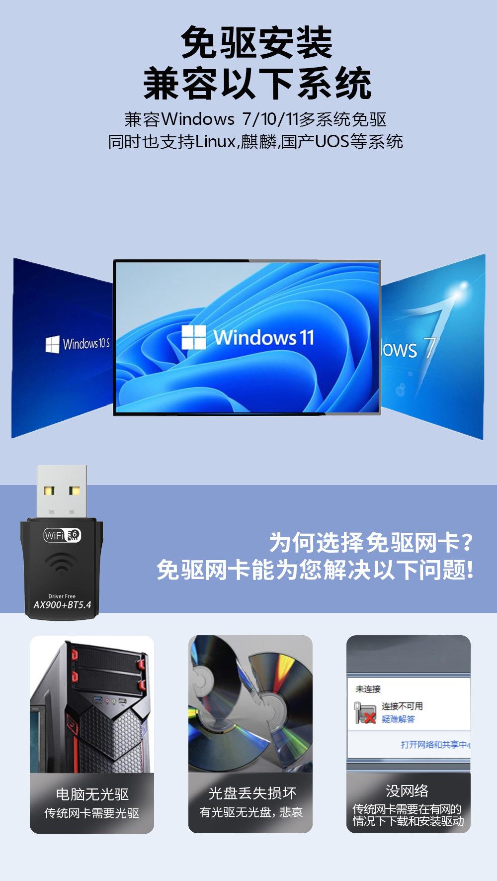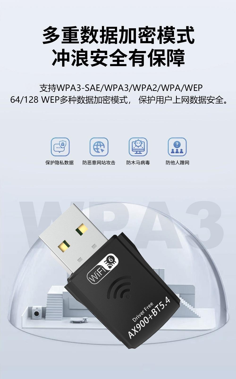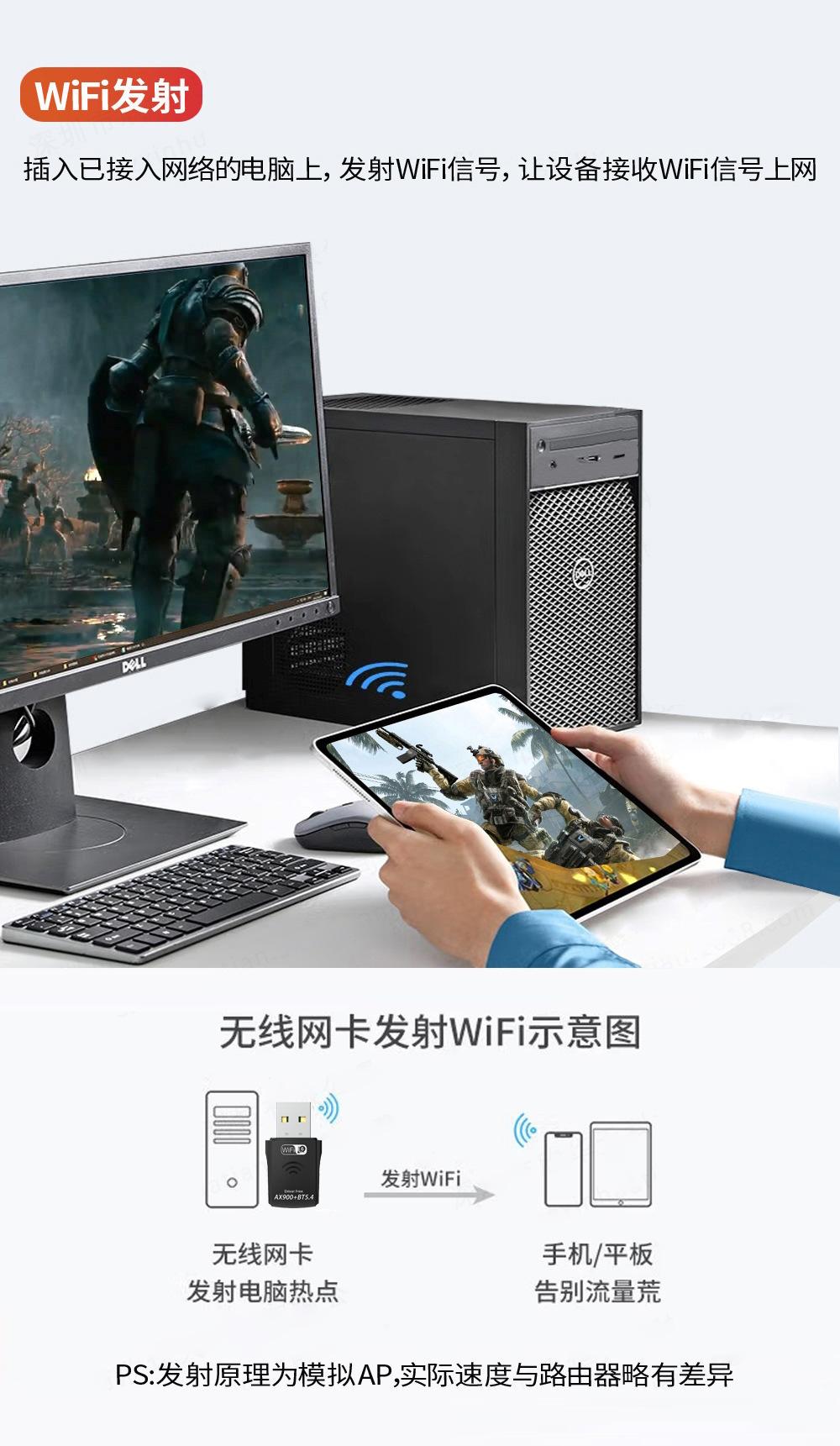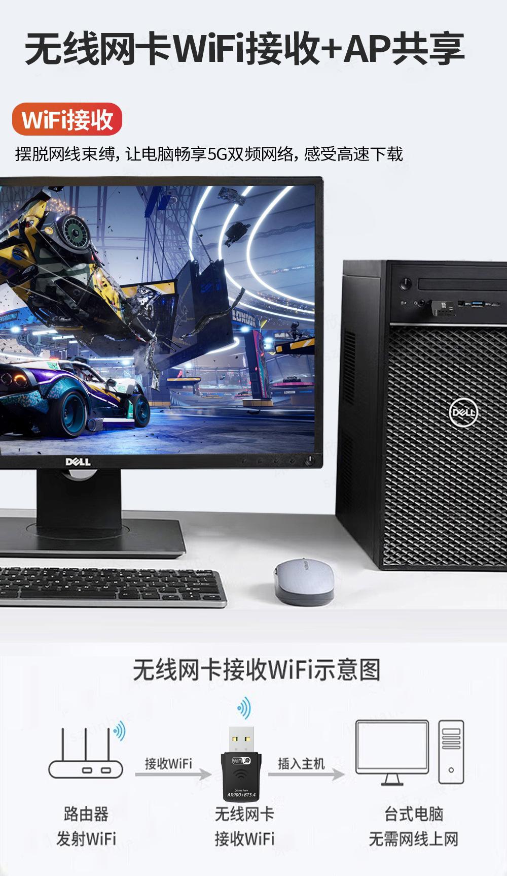 La tarjeta de red USB inalámbrica de doble banda AX900 es adecuada para la conexión inalámbrica de PC de escritorio y otros dispositivos, lo que puede proporcionar un método de acceso a Internet inalámbrico conveniente y rápido. La tarjeta de red admite la función de detección automática y puede ajustar automáticamente la velocidad.