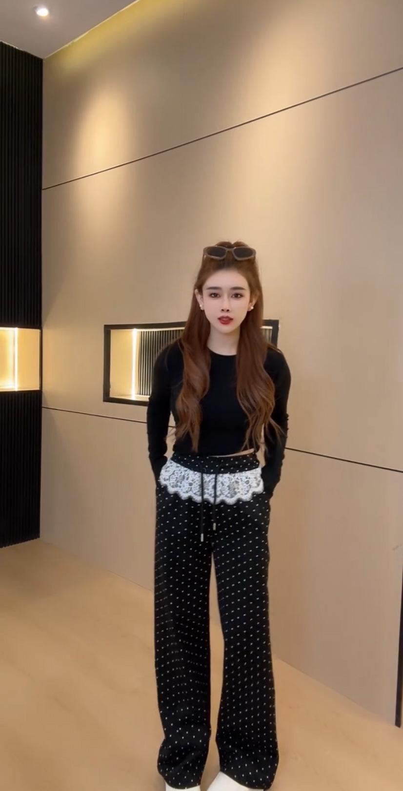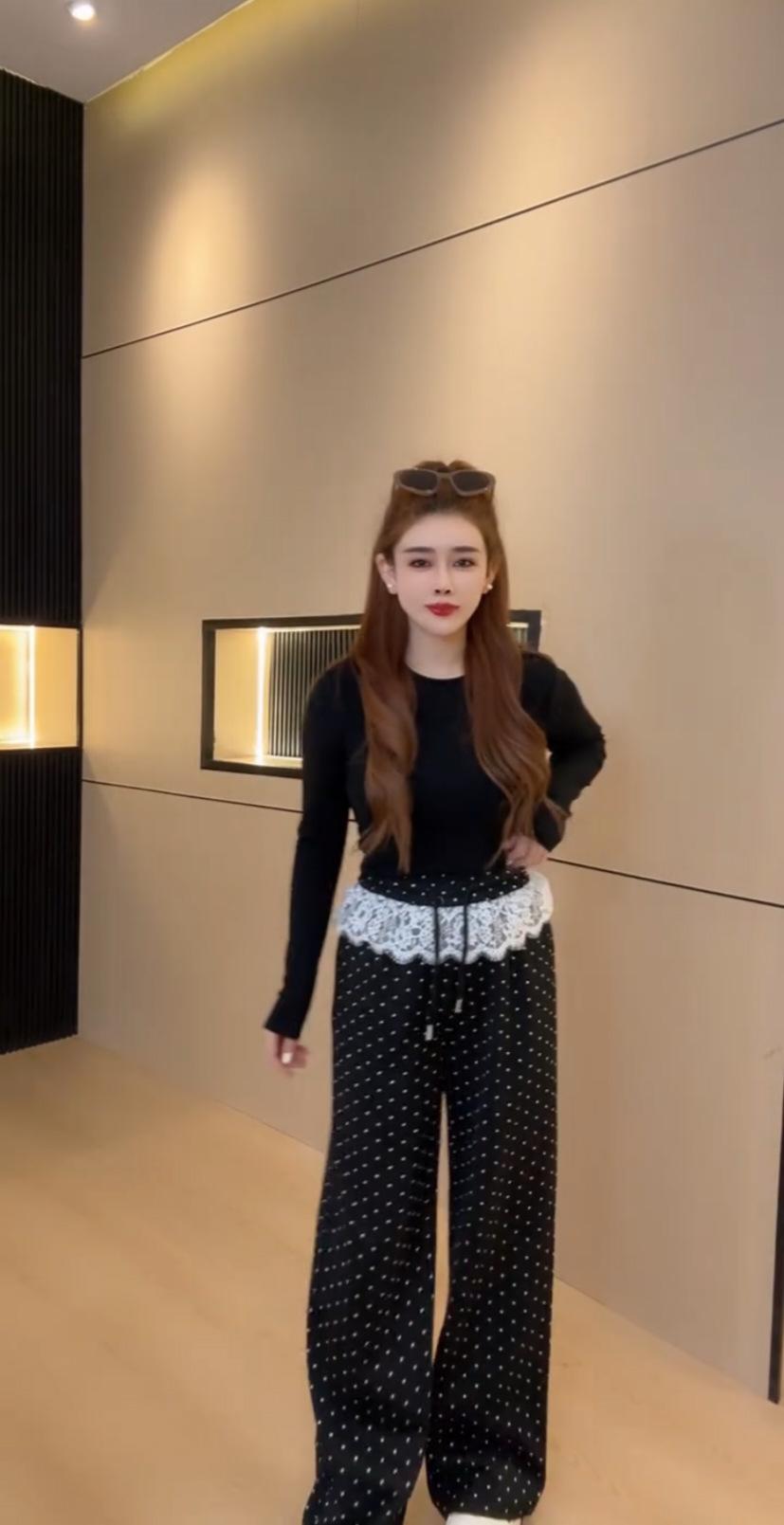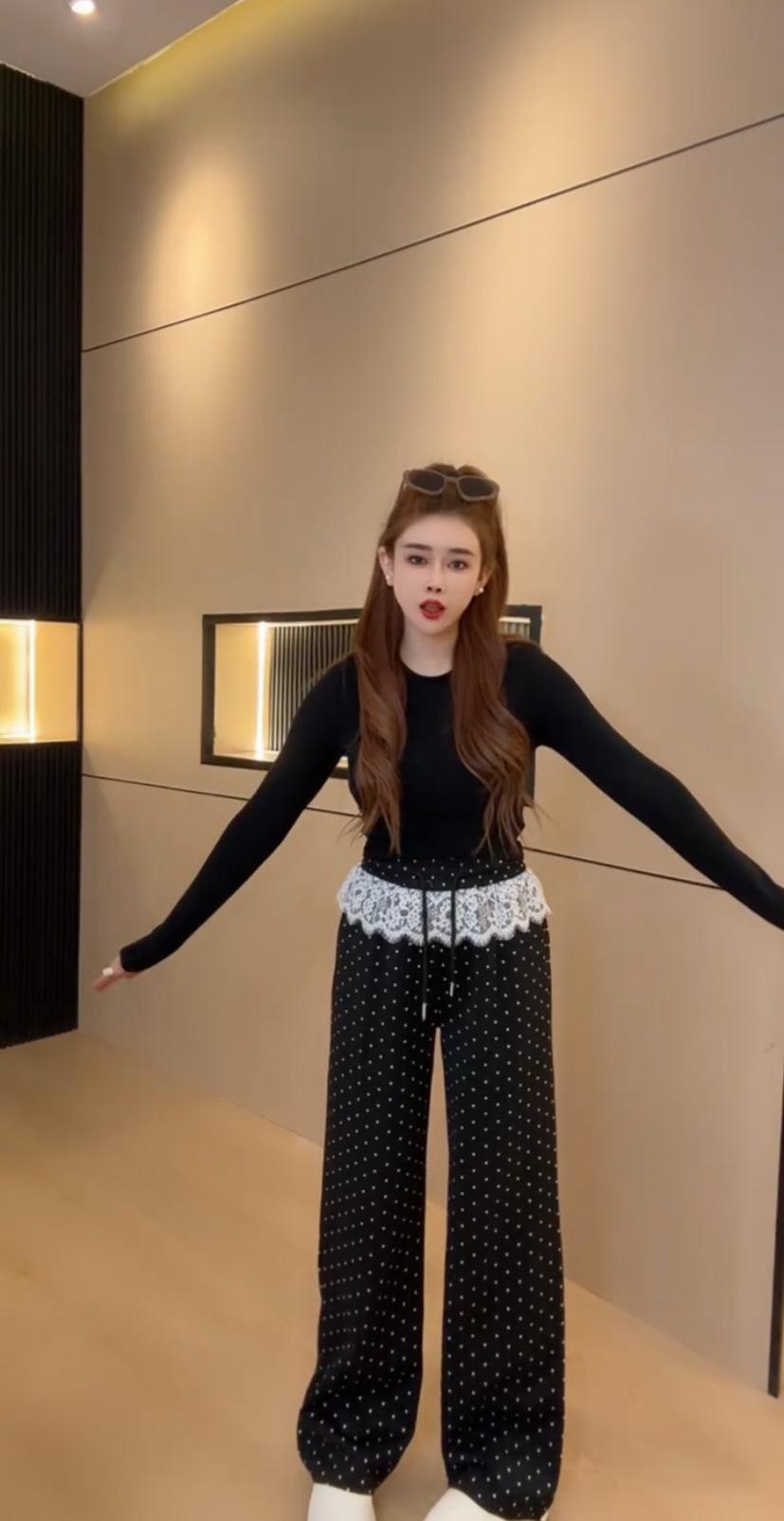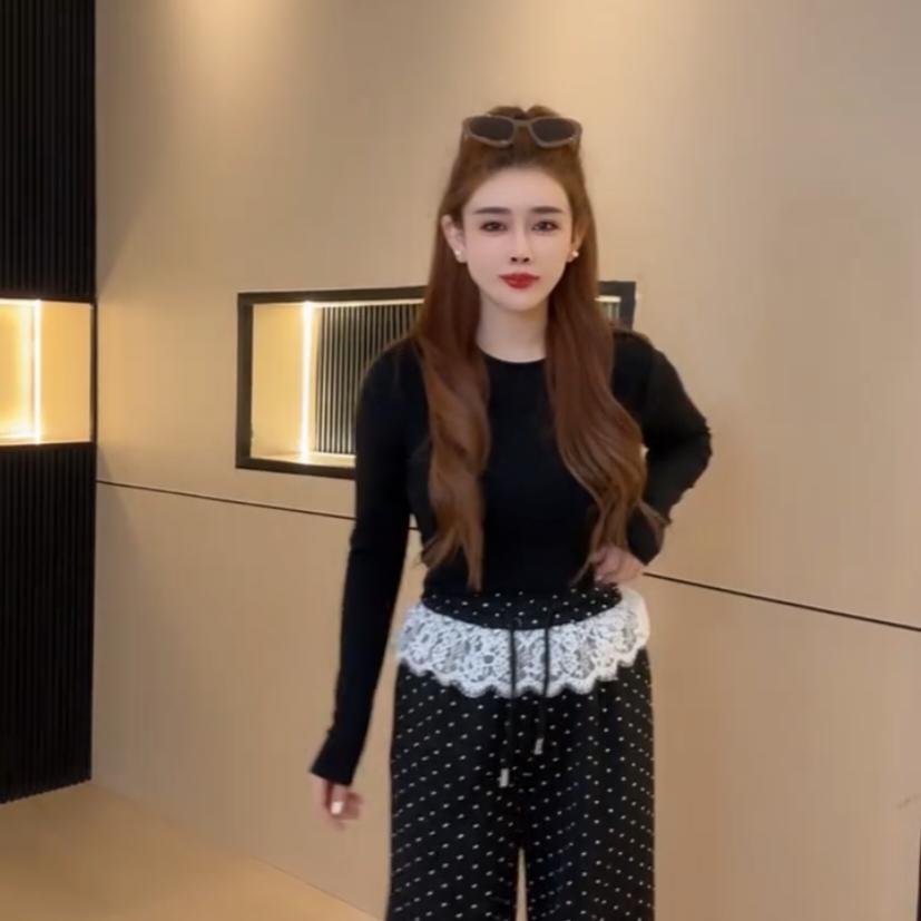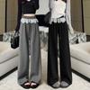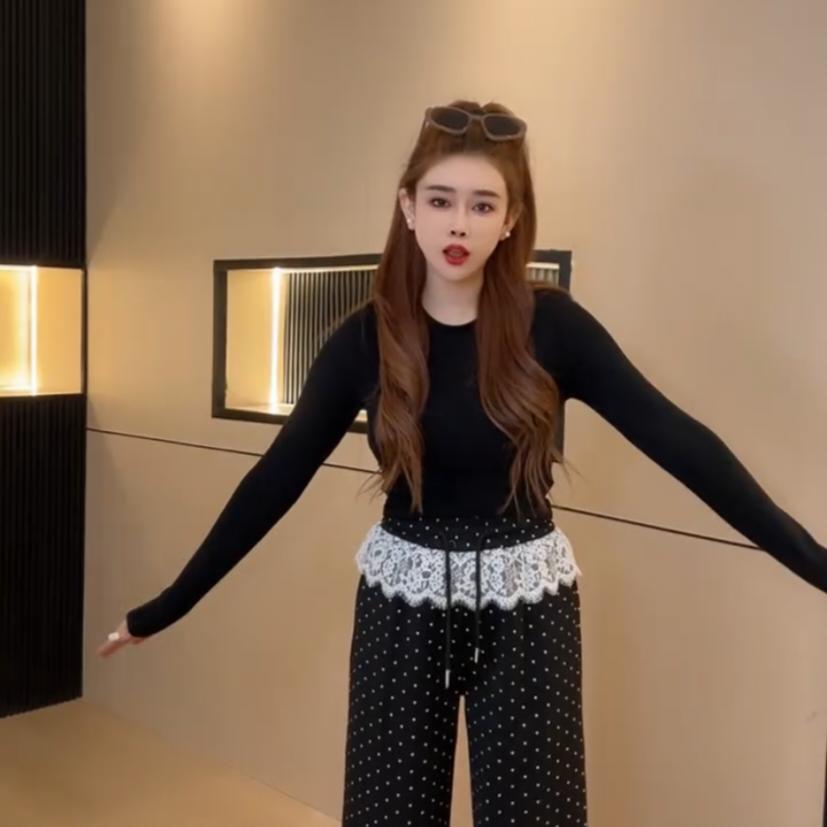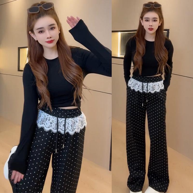 Moda Femenina Primavera 2025 Pantalones Rectos con Sentido del Diseño Elegante Encaje Puntadas Punto de Ola Pierna Ancha Estilo Colgante Pantalones Casuales