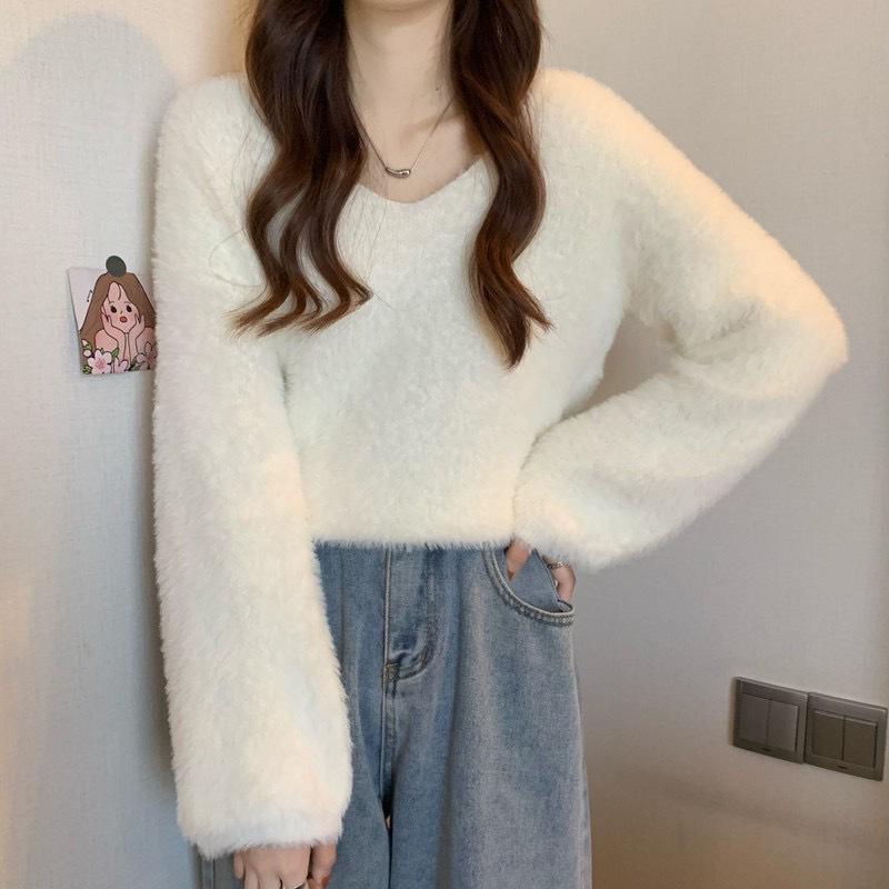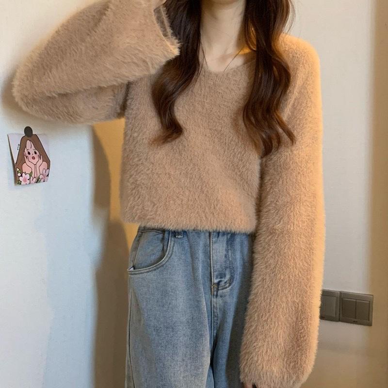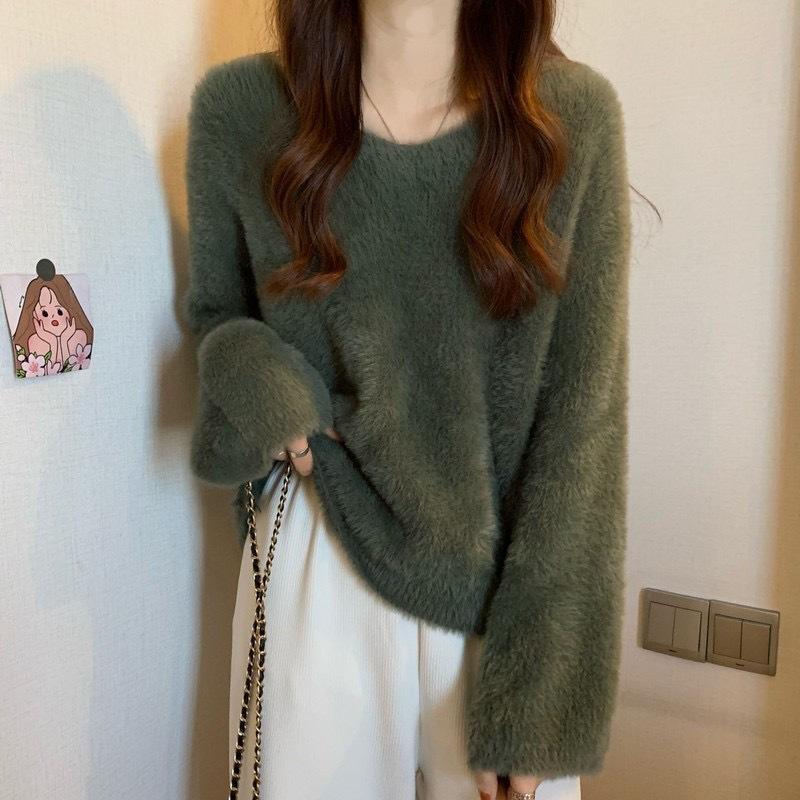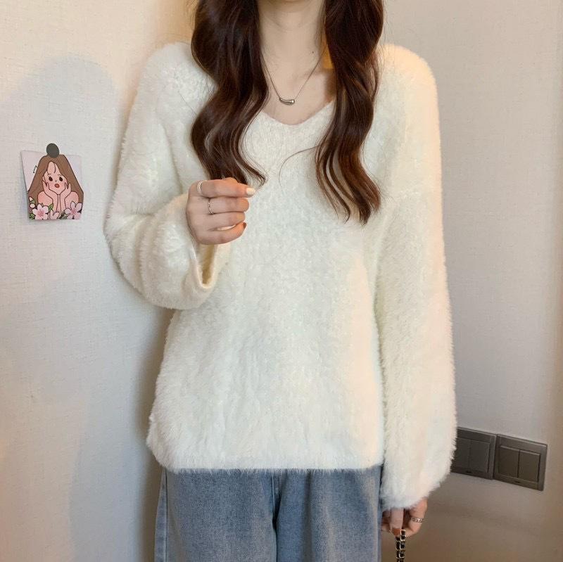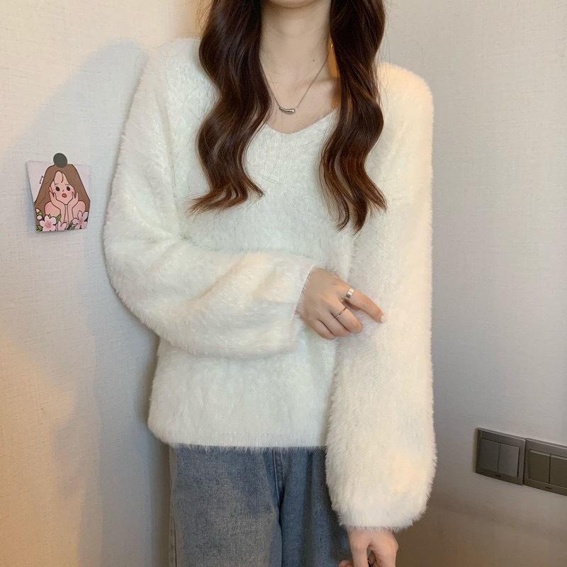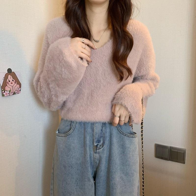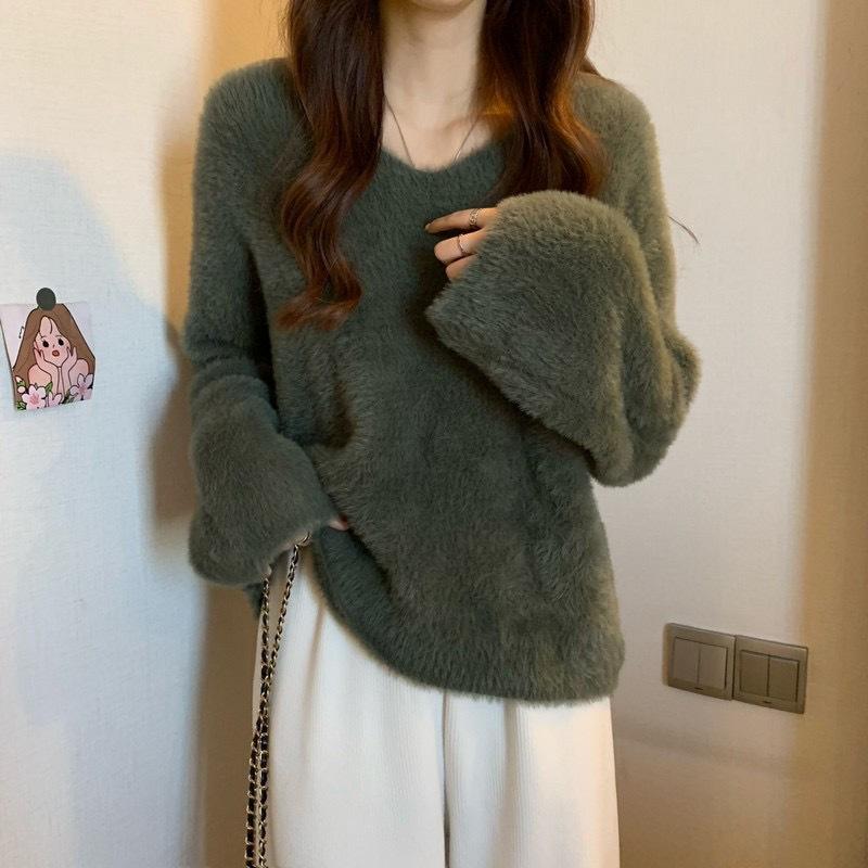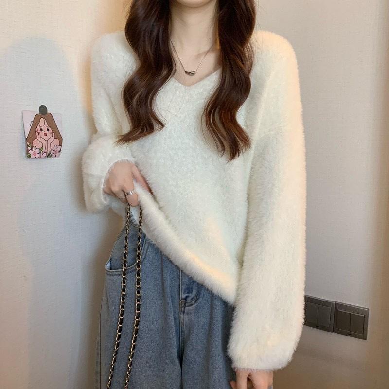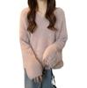 Suéter de terciopelo de visón suave, ceroso, impermeable, de estilo suave, para mujer, otoño e invierno, grueso, holgado, estilo perezoso, con cuello en V.