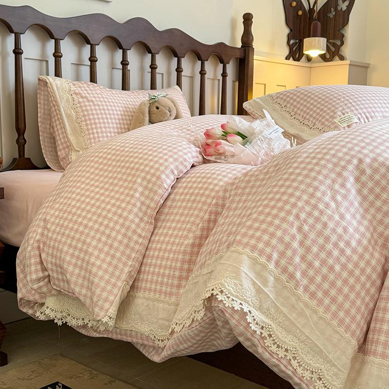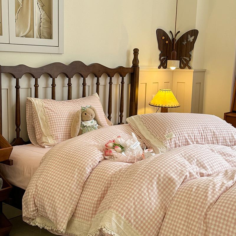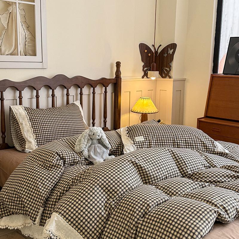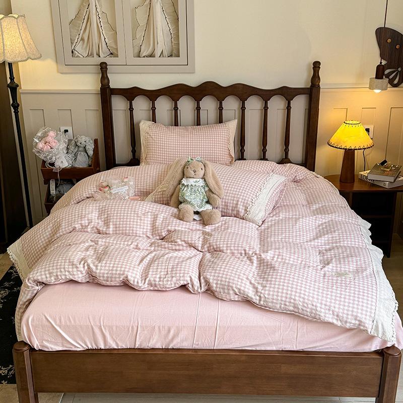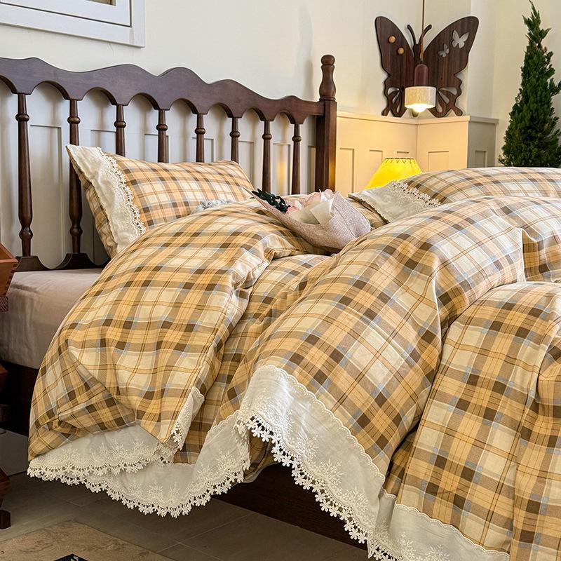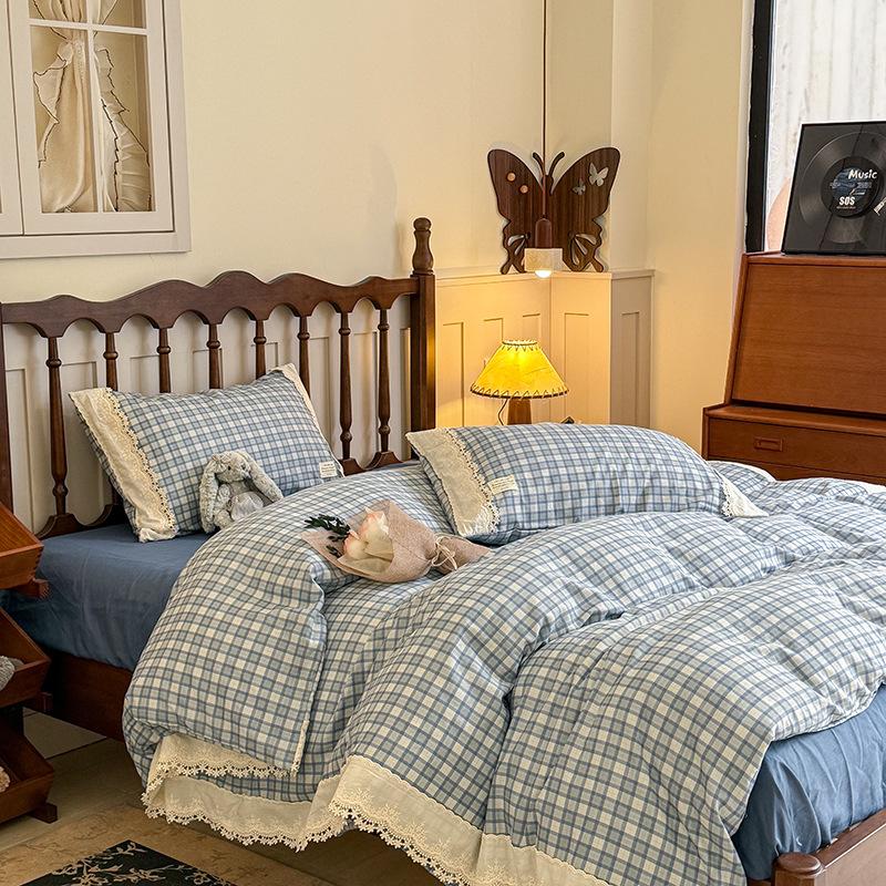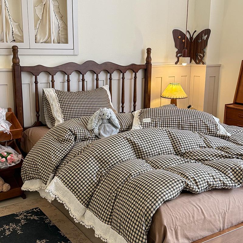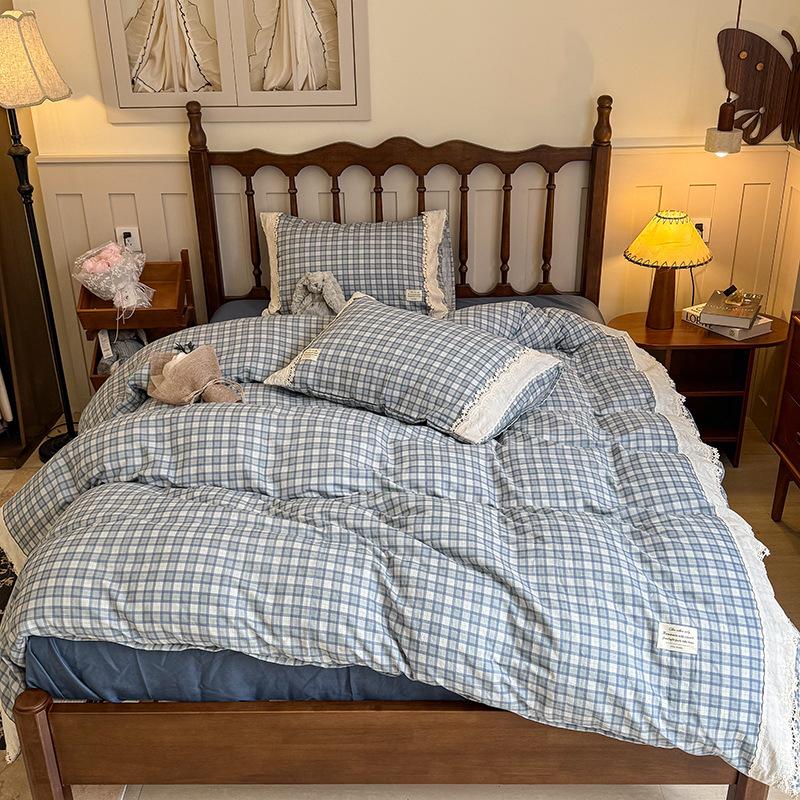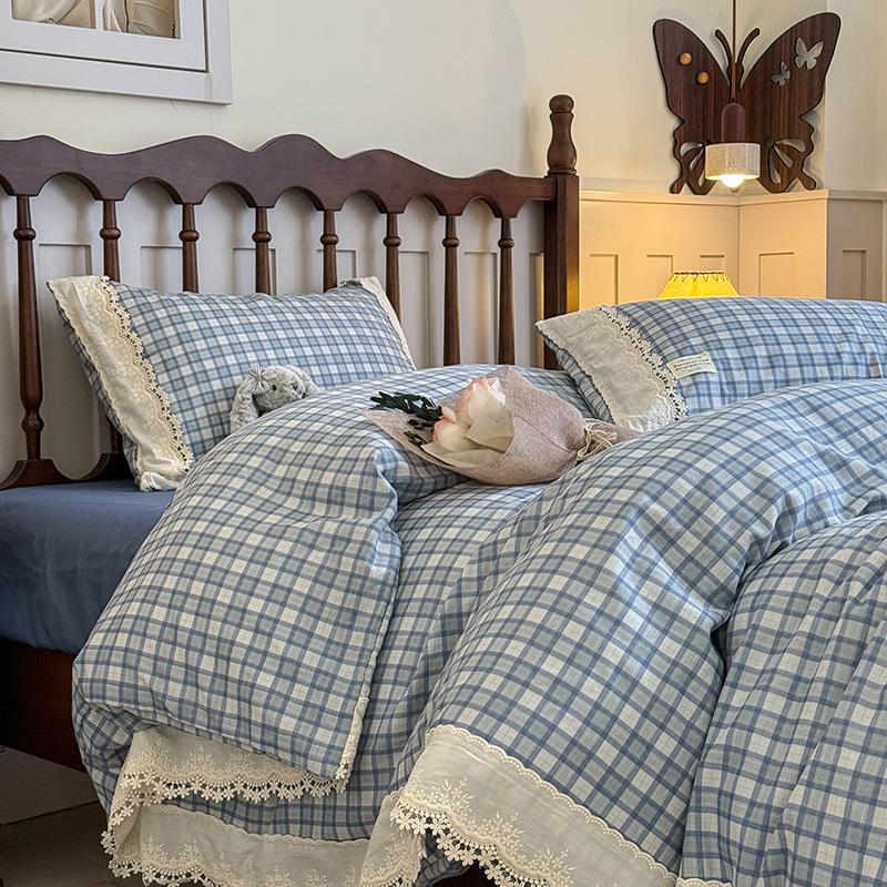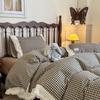 Juego de cama de cuatro piezas estilo retro francés de algodón puro, gasa de doble capa, funda nórdica a cuadros, sábanas, ropa de cama de algodón estilo princesa, doble