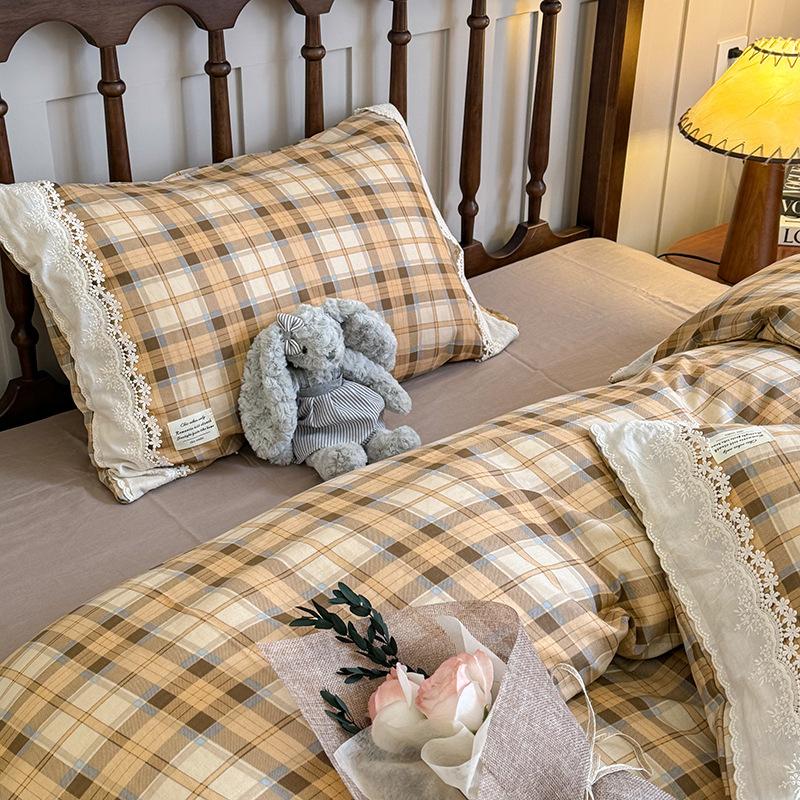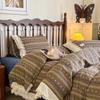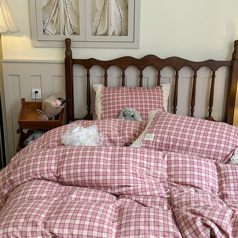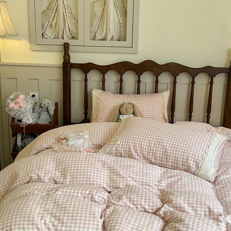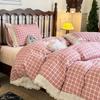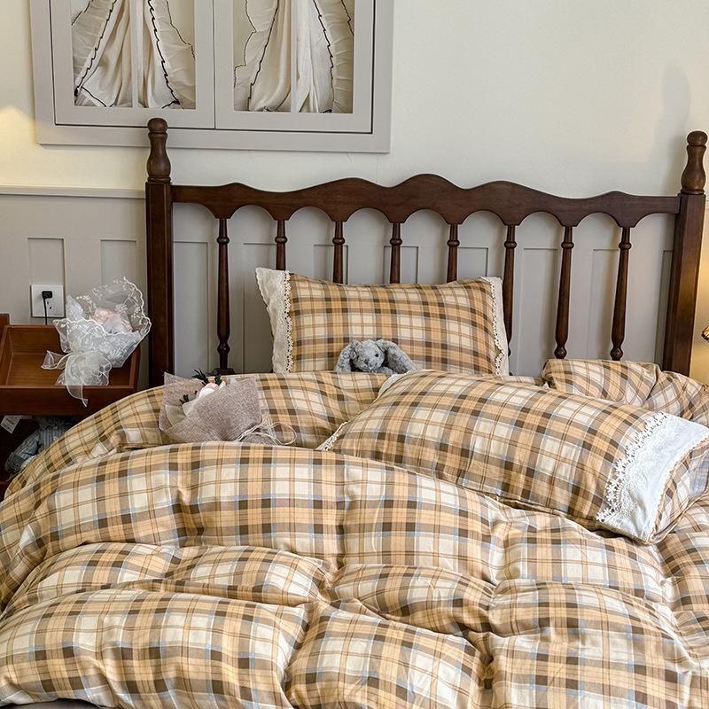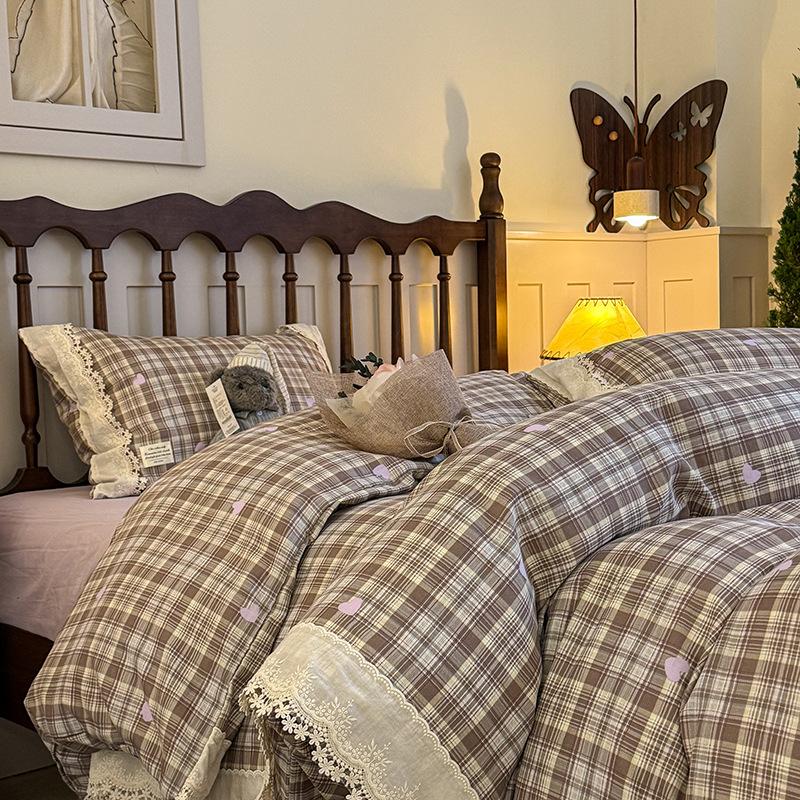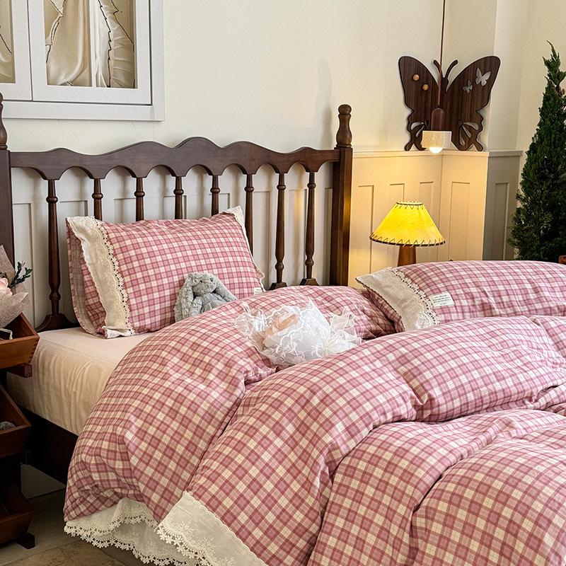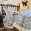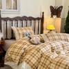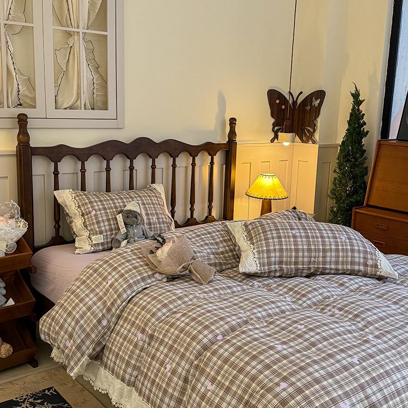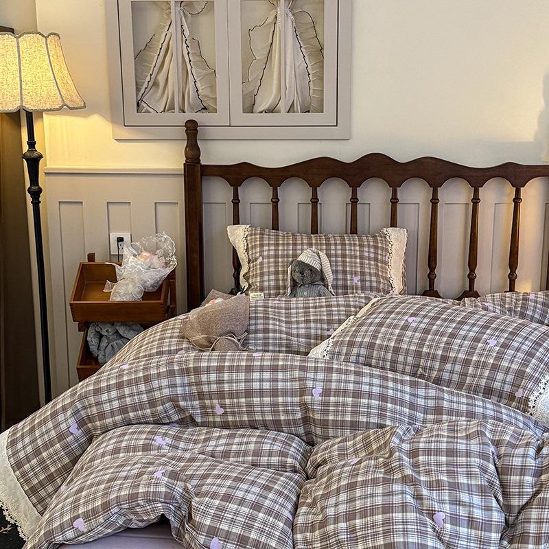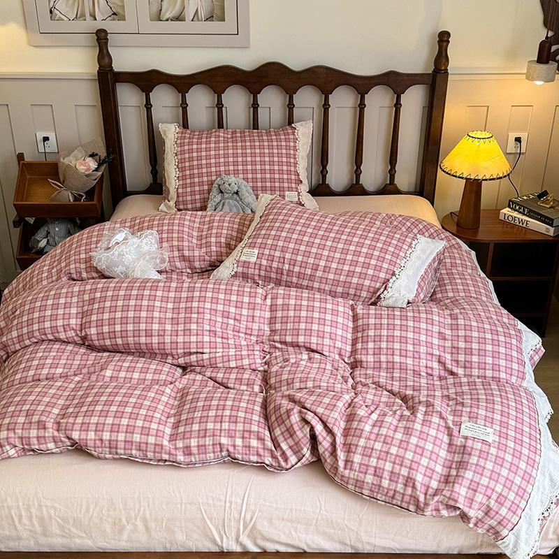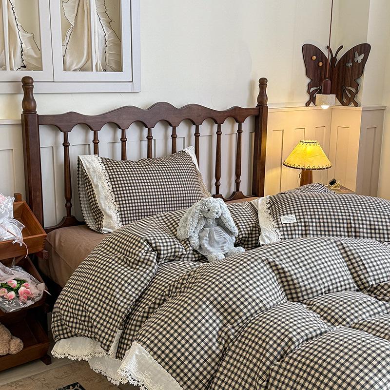 Juego de cama de cuatro piezas estilo retro francés de algodón puro, gasa de doble capa, funda nórdica a cuadros, sábanas, ropa de cama de algodón estilo princesa, doble