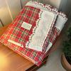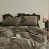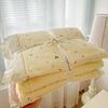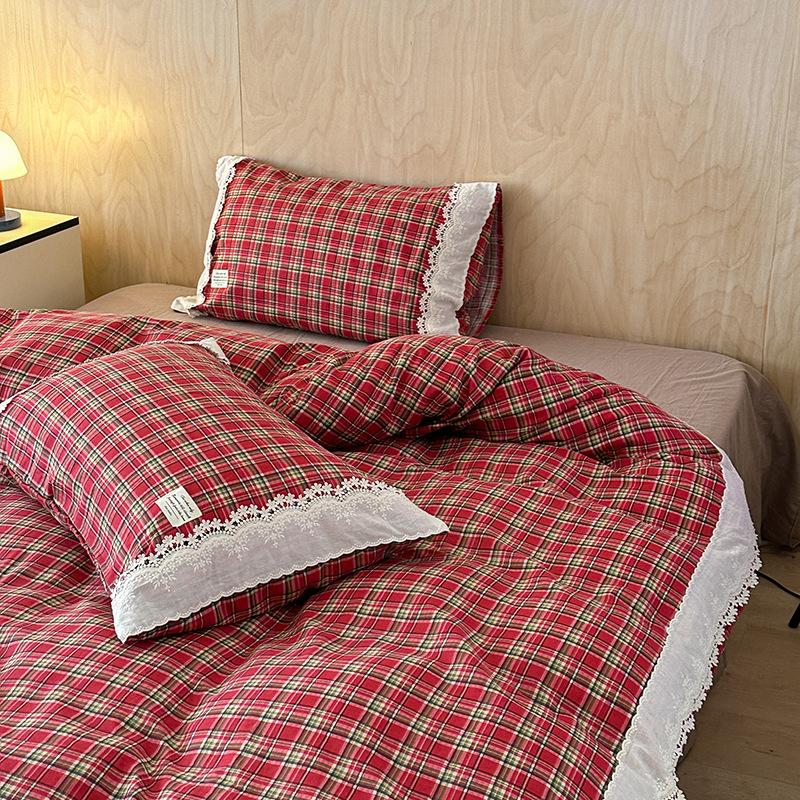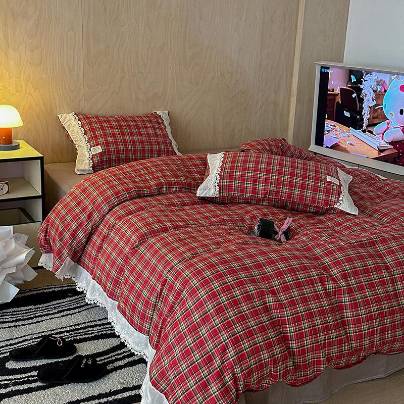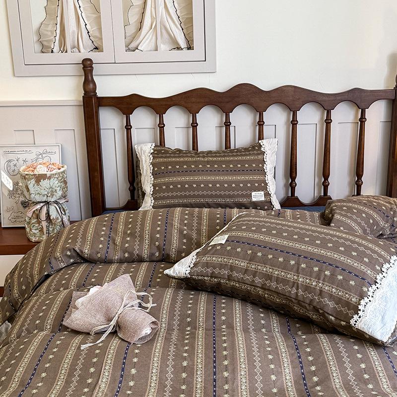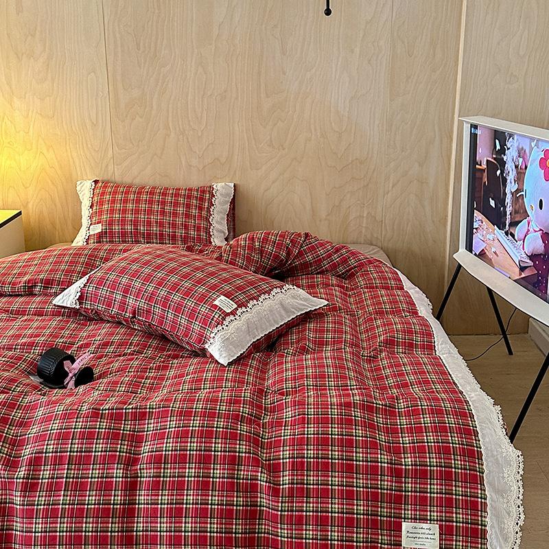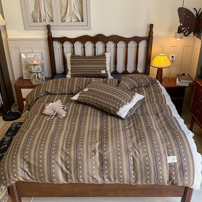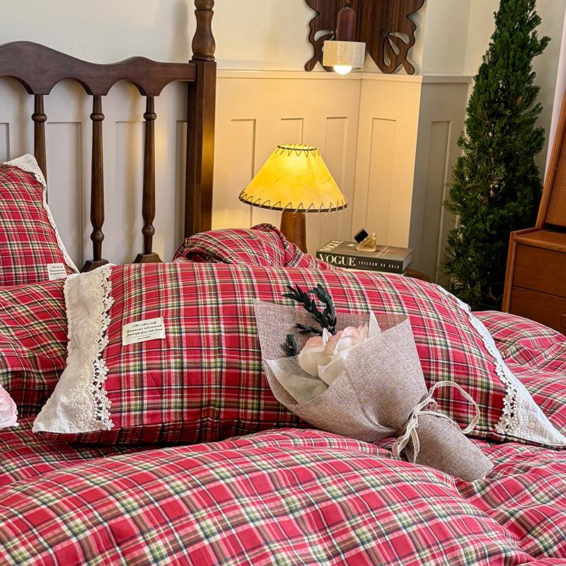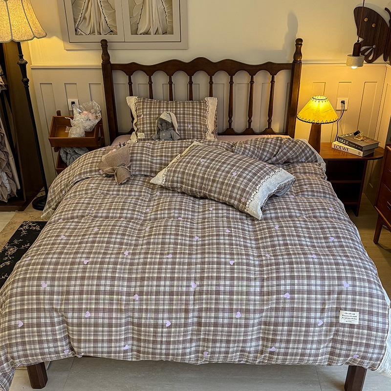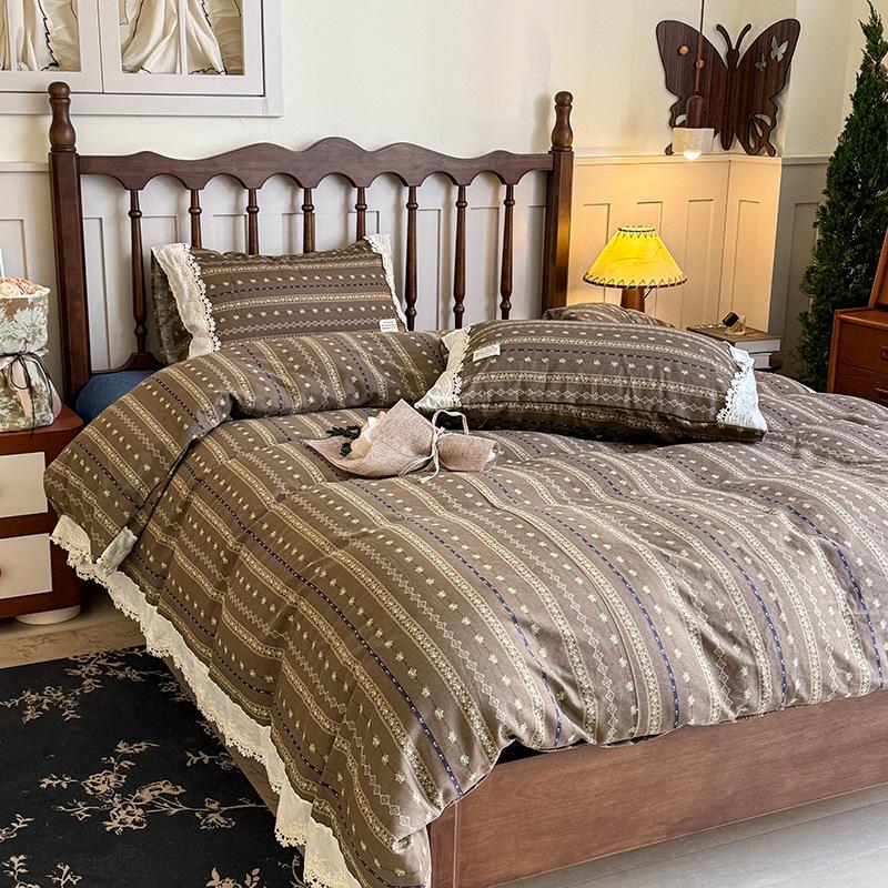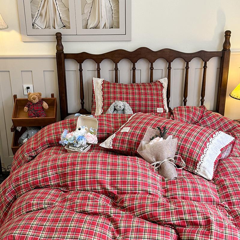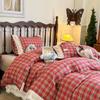 Juego de cama de cuatro piezas estilo retro francés de algodón puro, gasa de doble capa, funda nórdica a cuadros, sábanas, ropa de cama de algodón estilo princesa, doble