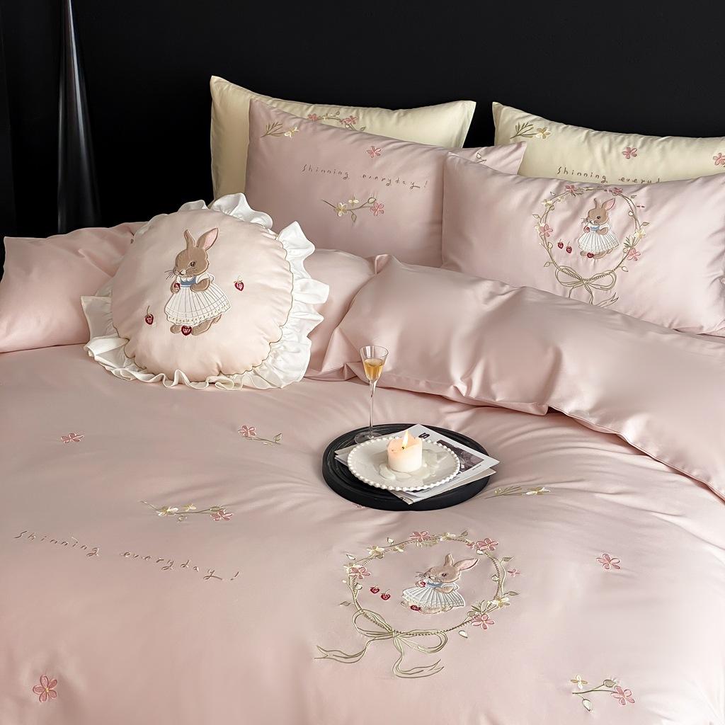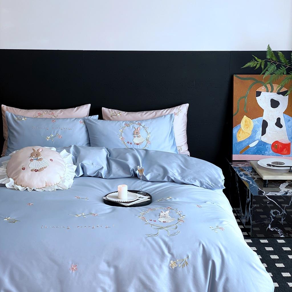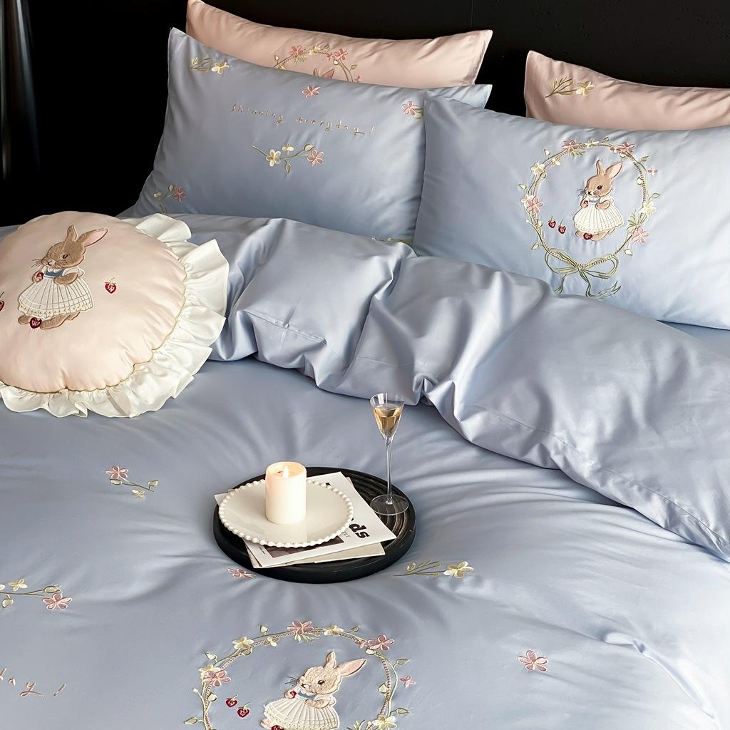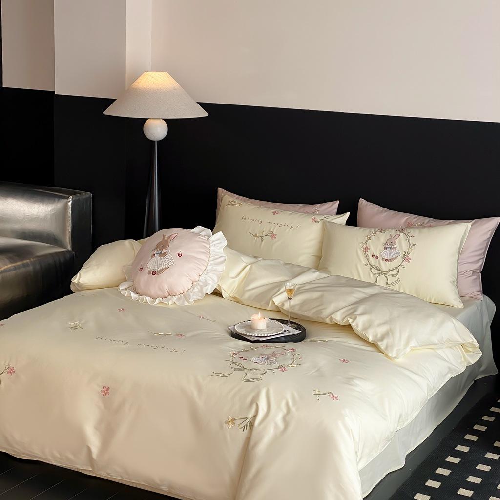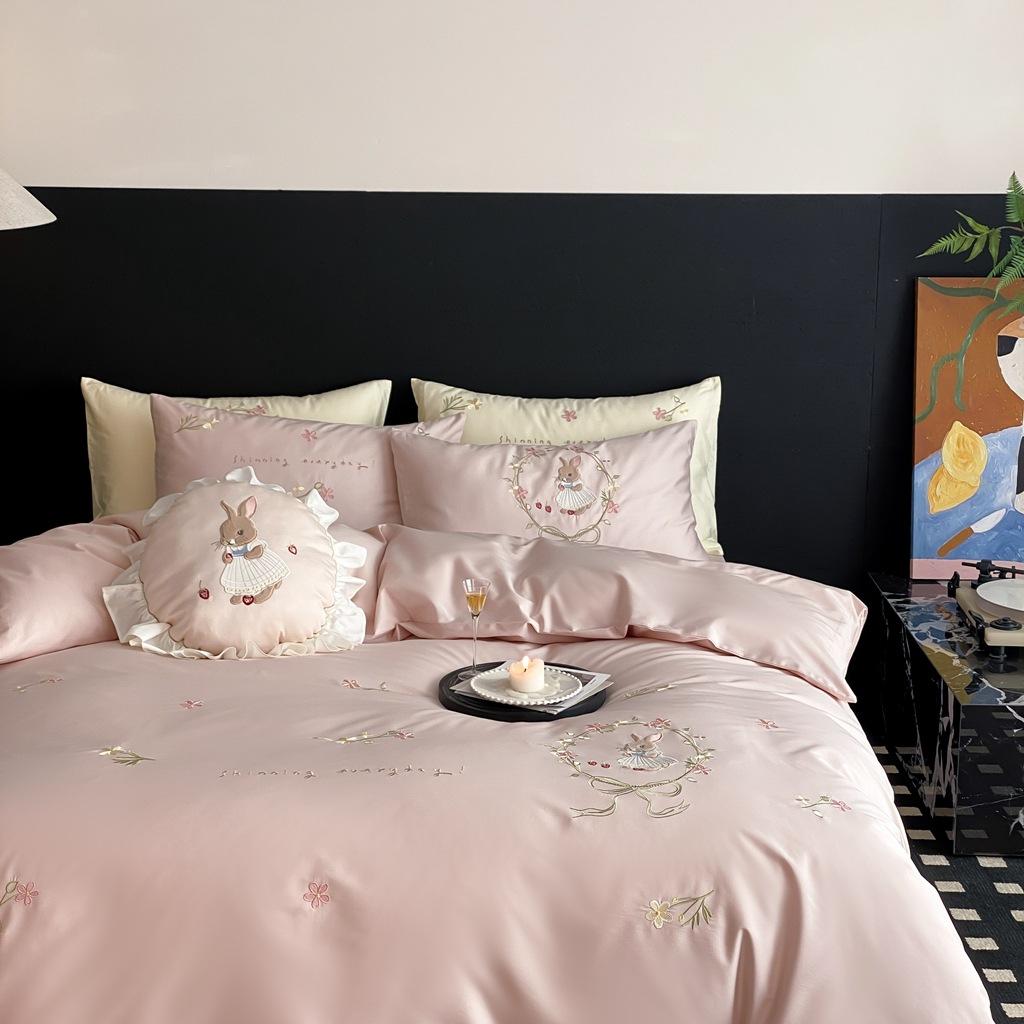 Juego de cuatro piezas de algodón de fibra larga Corazón de niña Rama alta Algodón Algodón Lindo Conejo Bordado Funda de edredón Sábana Cama Ropa de cama Primavera y Verano