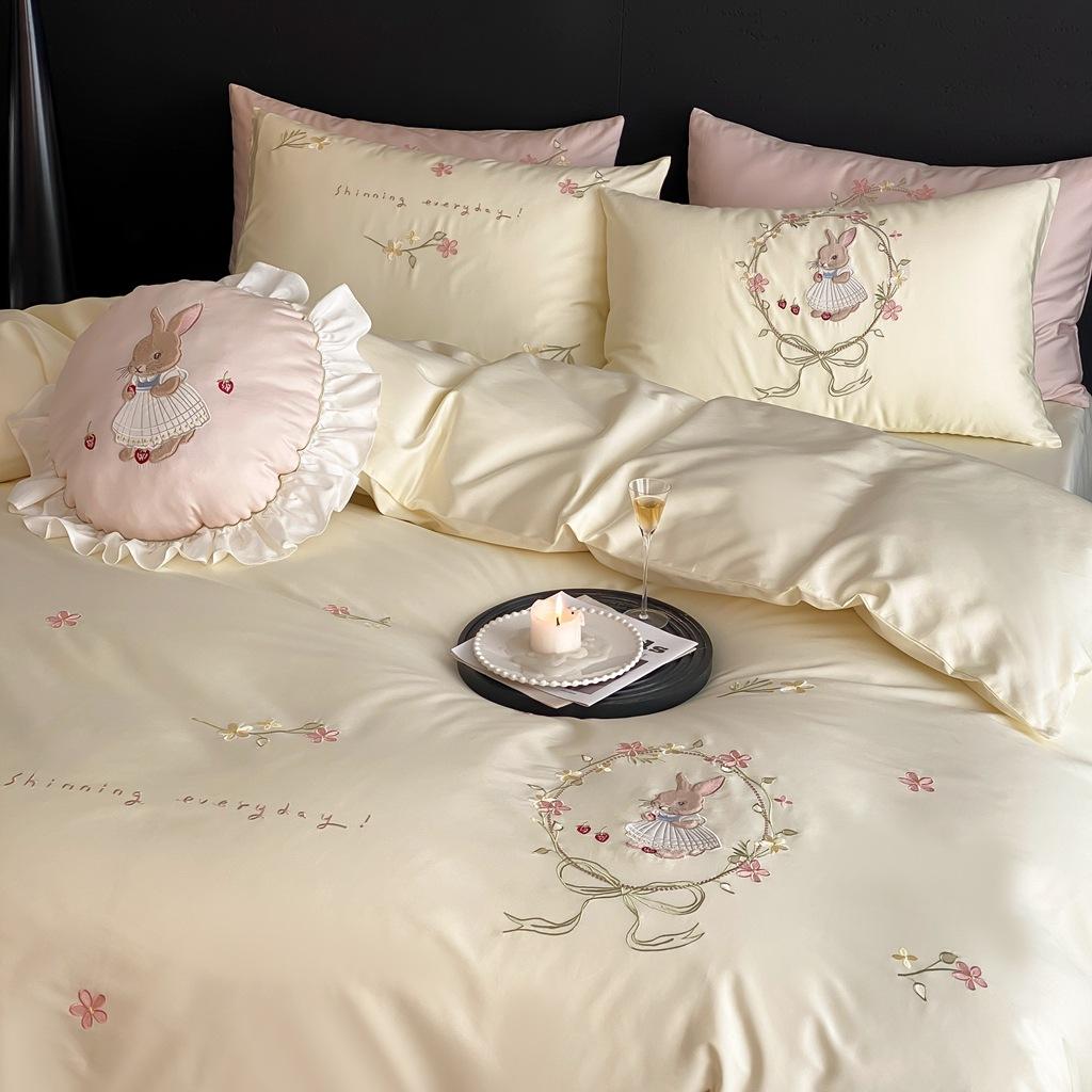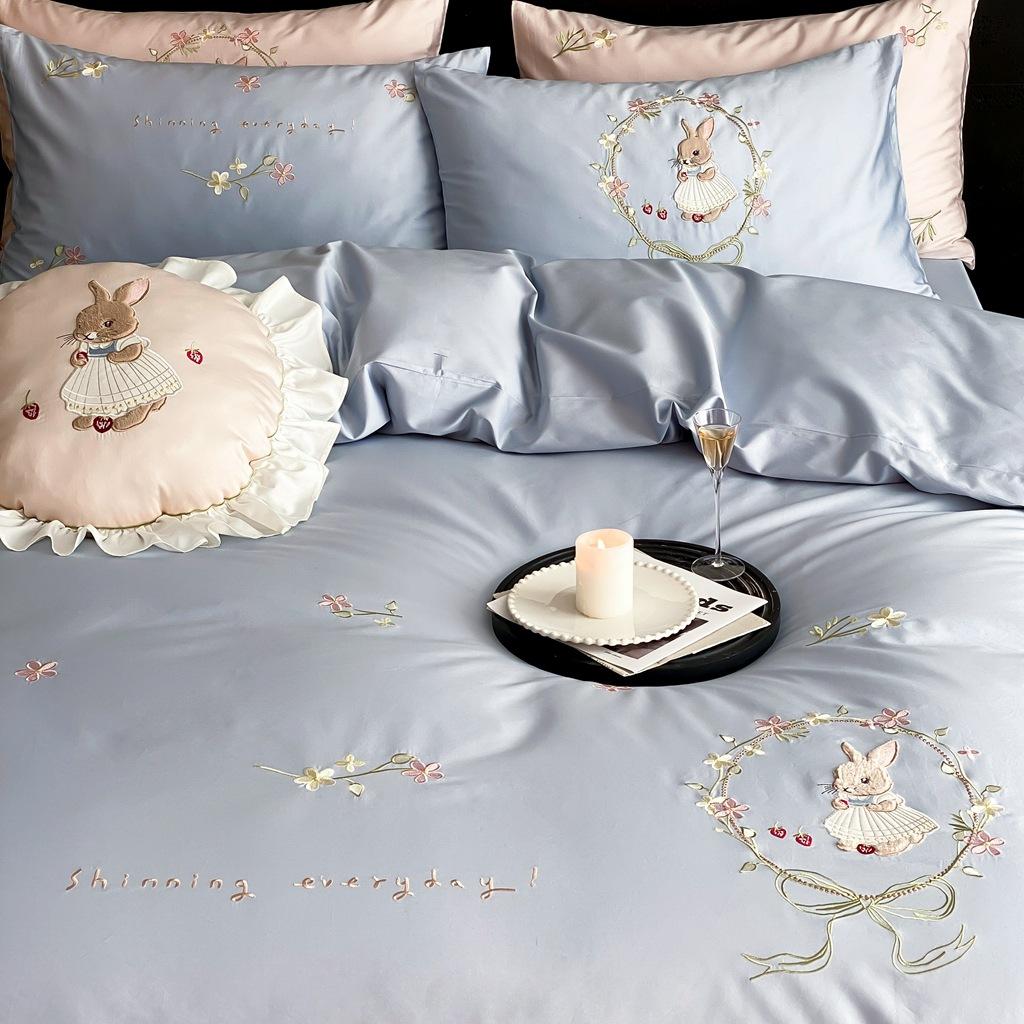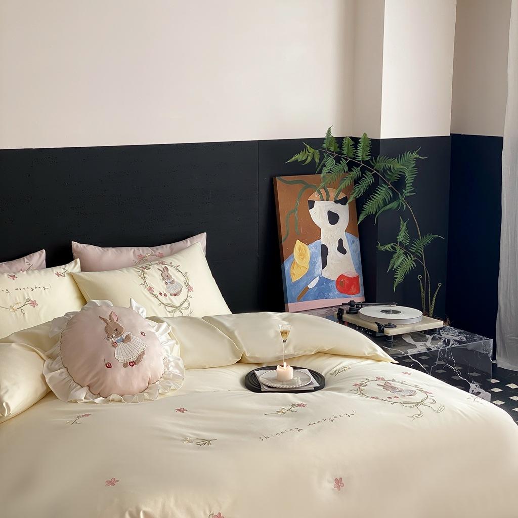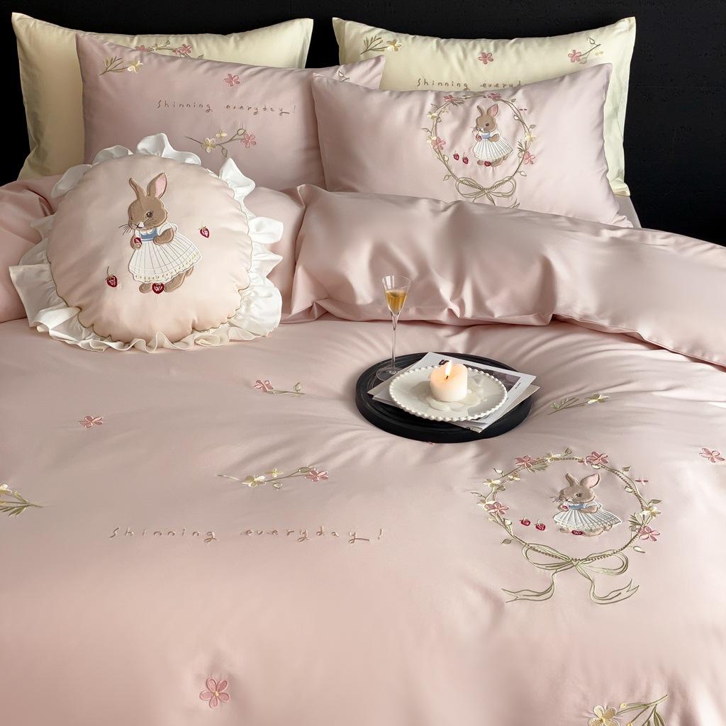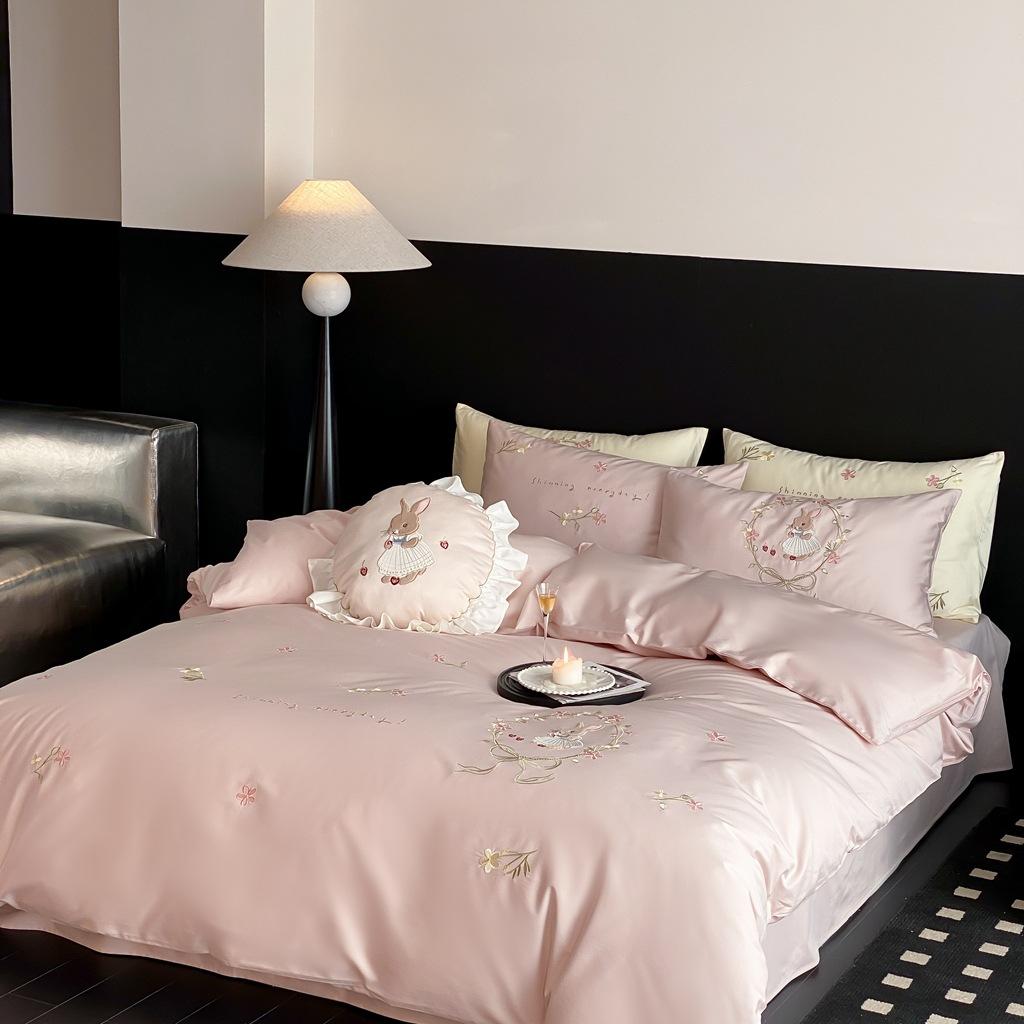 Juego de cuatro piezas de algodón de fibra larga Corazón de niña Rama alta Algodón Algodón Lindo Conejo Bordado Funda de edredón Sábana Cama Ropa de cama Primavera y Verano