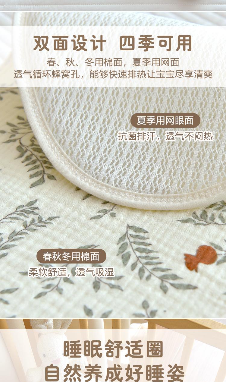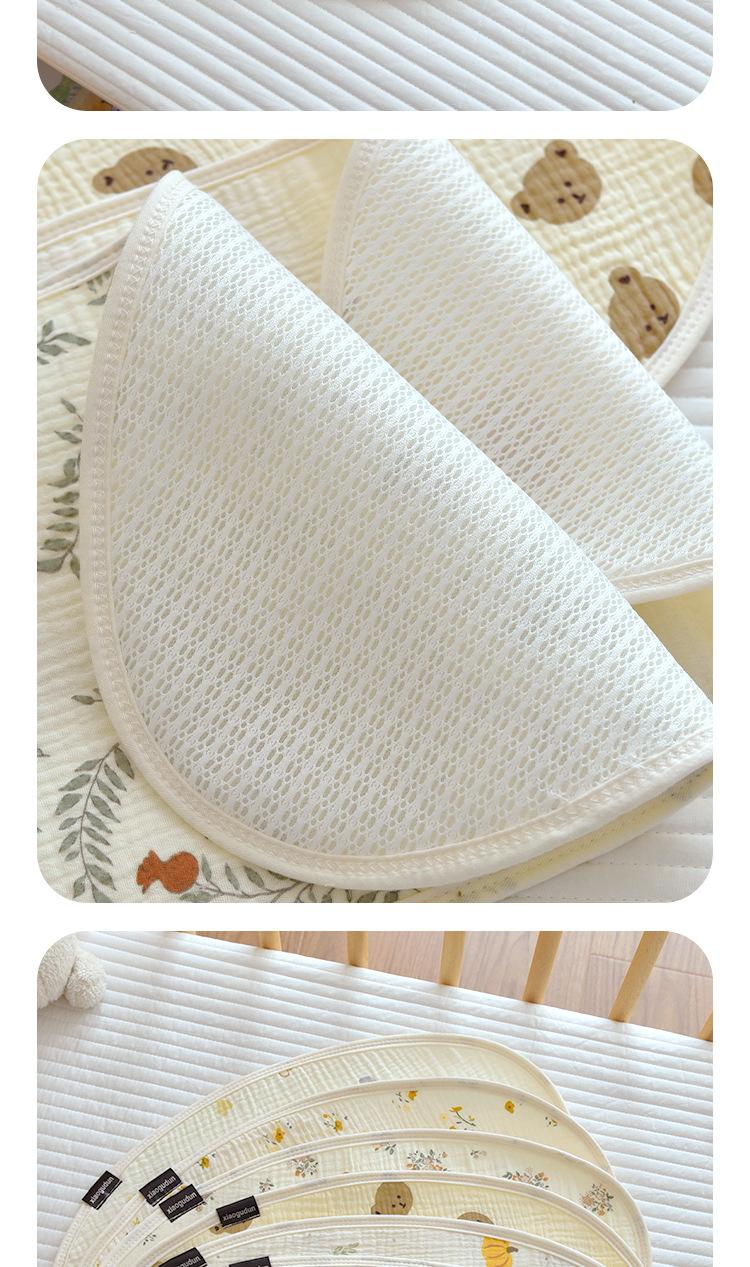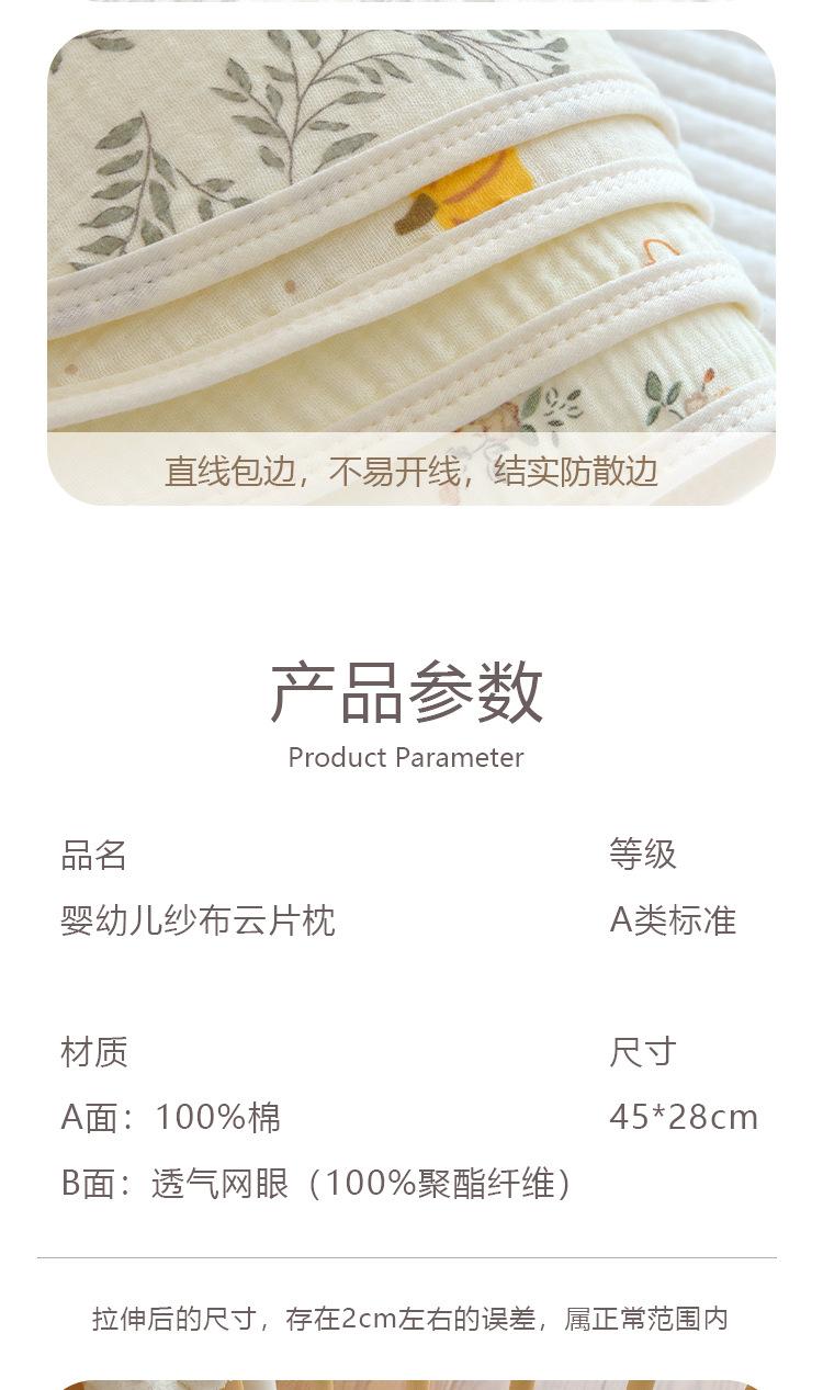 Almohada de nube de gasa para bebés Material: Superficie 100% algodón Capa inferior de malla transpirable (100% poliéster) Tamaño: 45 x 28 cm Edad adecuada: 0-12 meses Consejos de lavado: Lavar a mano a 30°C, ciclo suave. Lavar a máquina en ciclo suave, no enjuagar, no hervir en agua a alta temperatura.