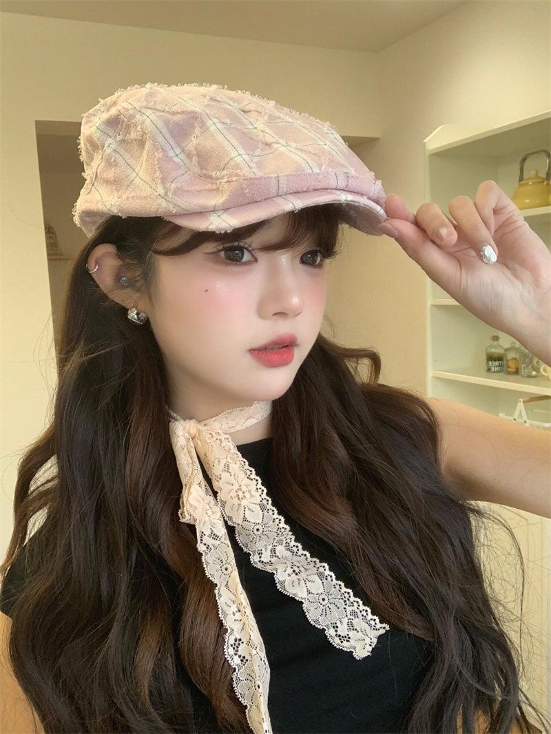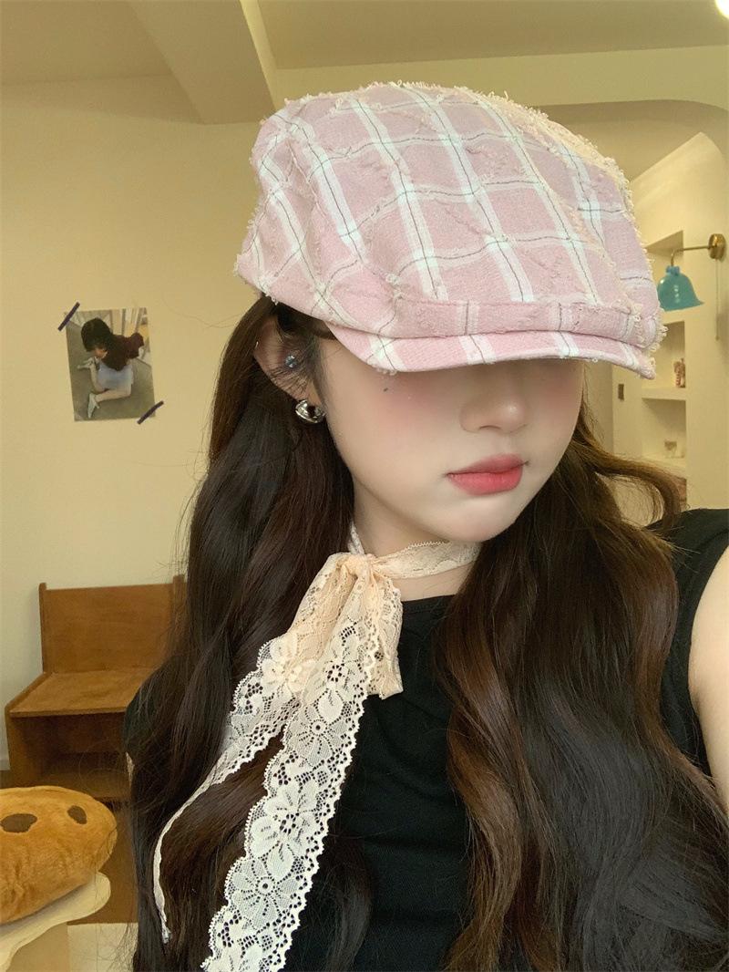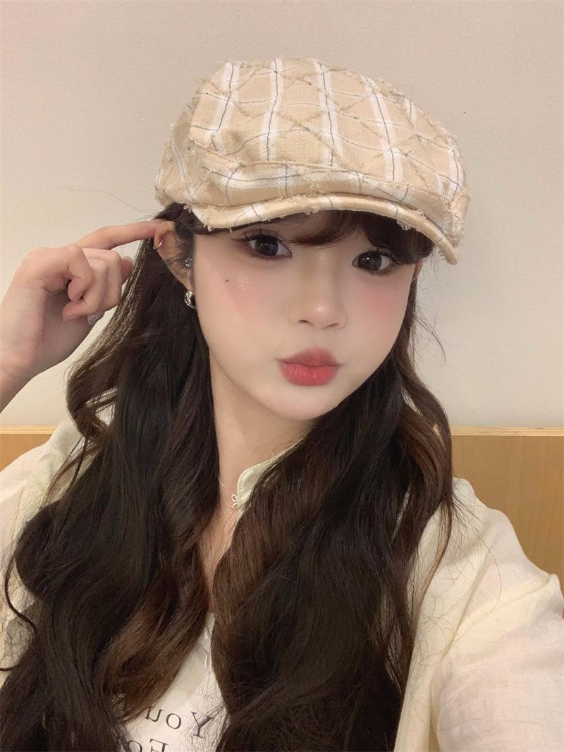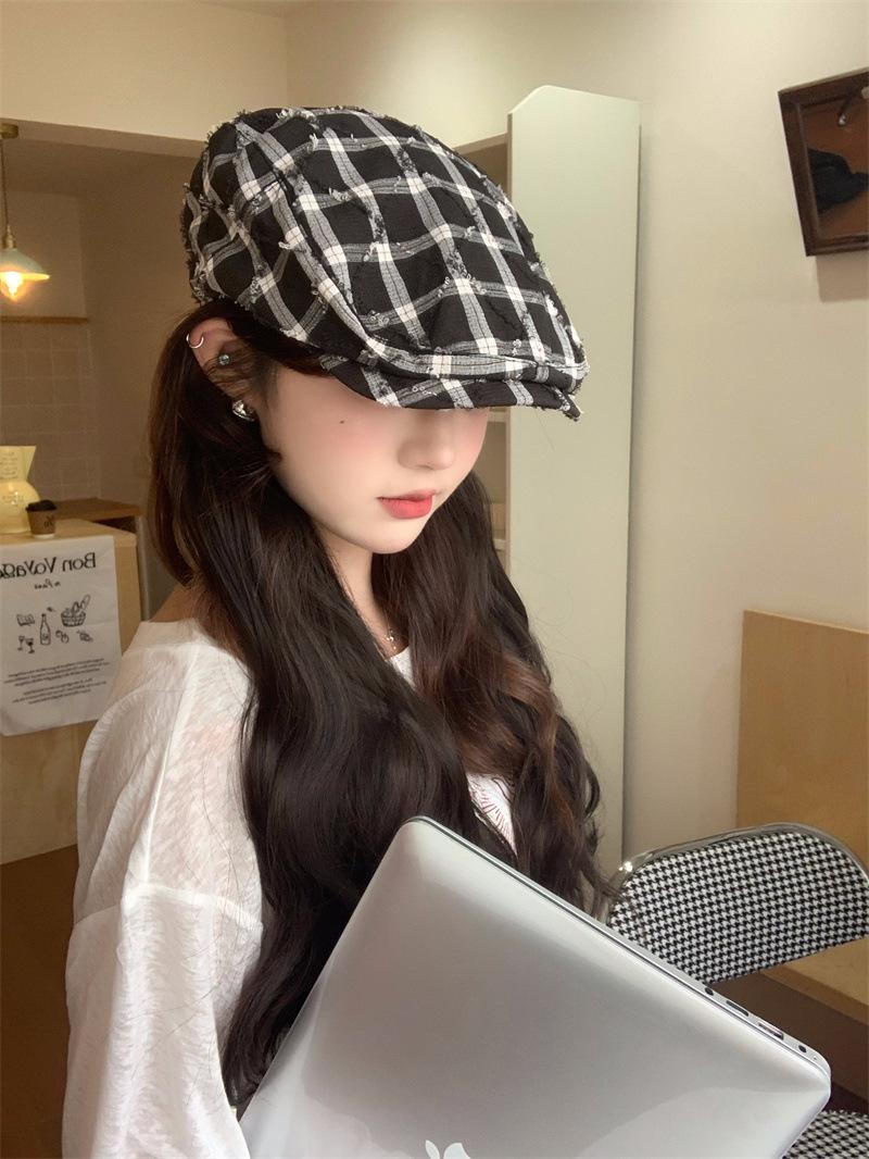 Sombrero Avanzado Retro a Cuadros Estilo Universitario para Mujer Primavera Estilo Británico Boina de Pico de Pato Cabeza Grande Wai Arte Periódico Sombrero Infantil