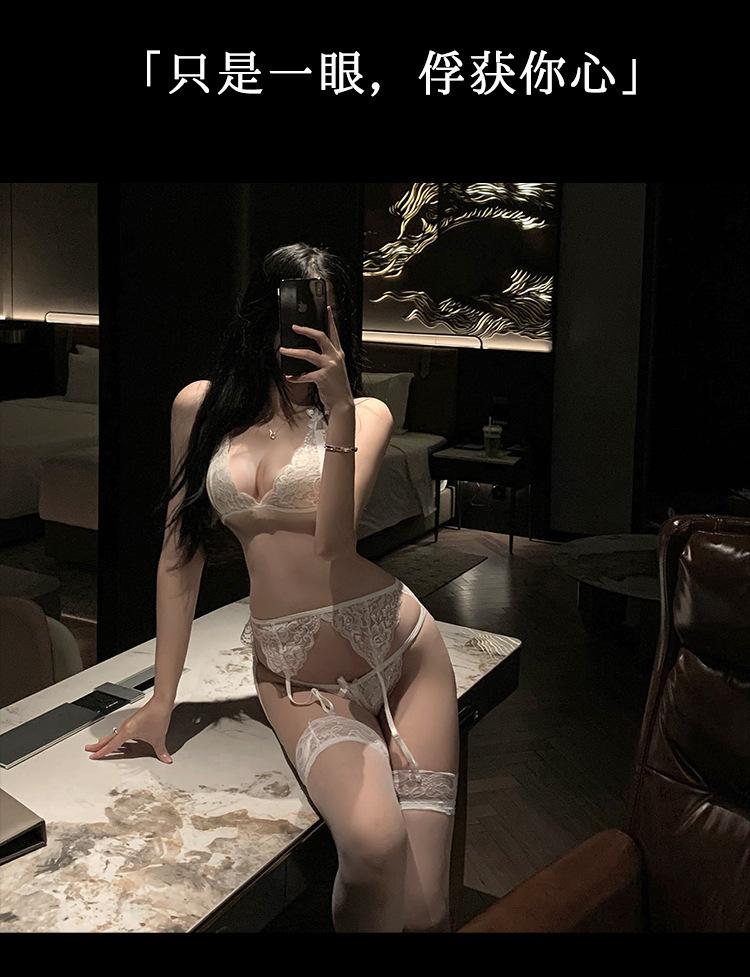 White four-piece set [bra + panties + garter + white fishnet stockings]