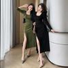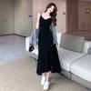 Vestido negro de estilo francés puro con abertura y cárdigan de protección solar, conjunto de dos piezas, primavera y verano 2025