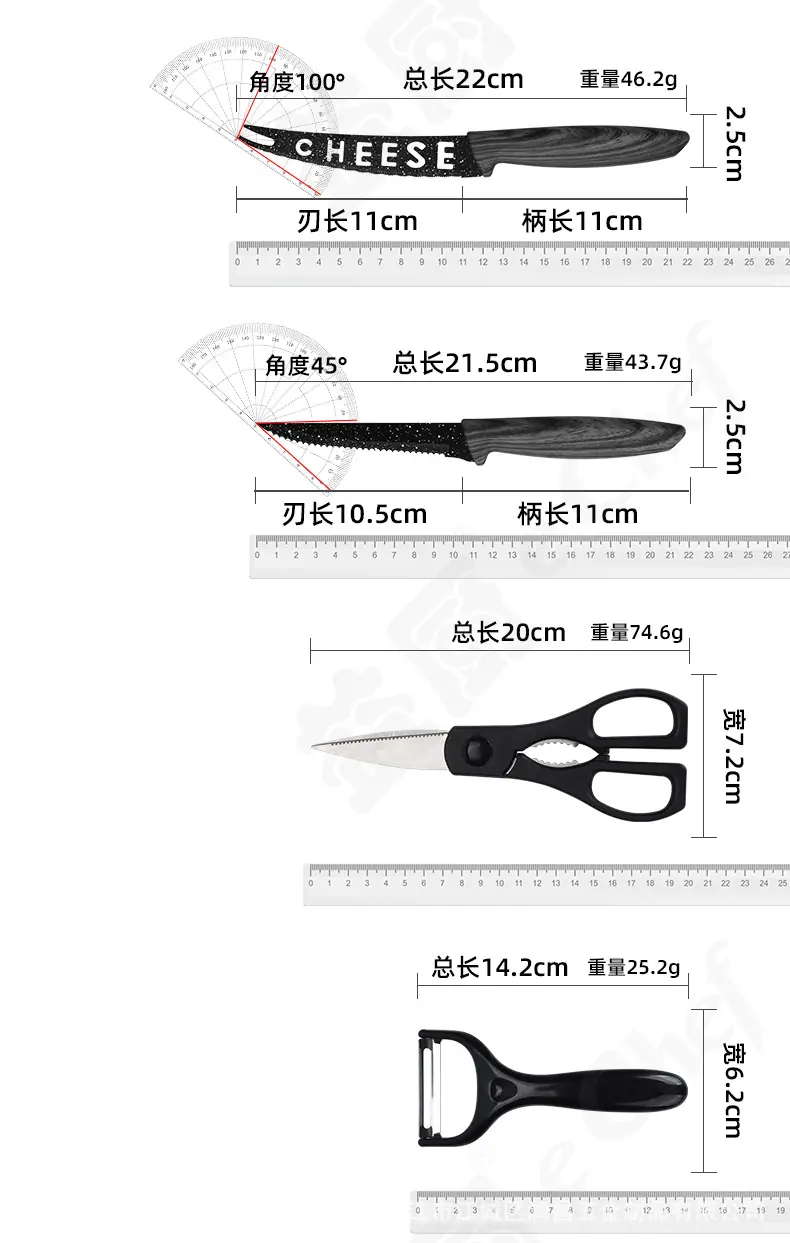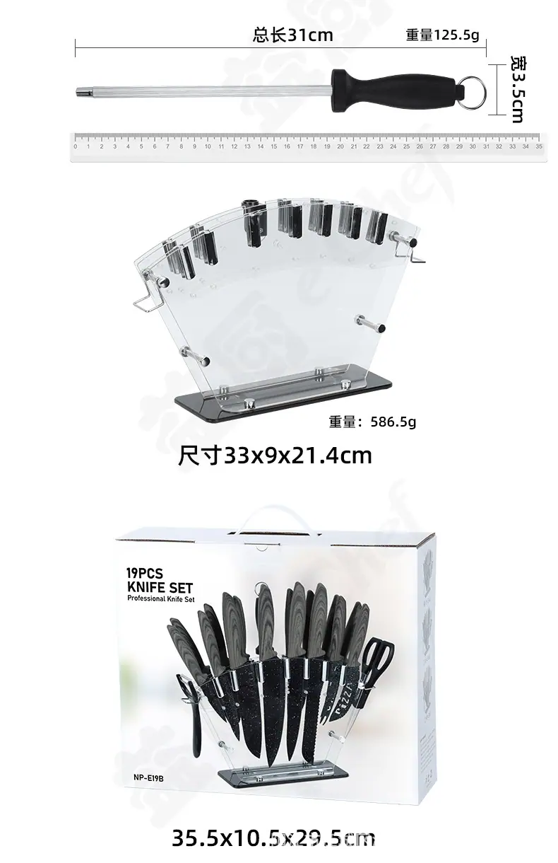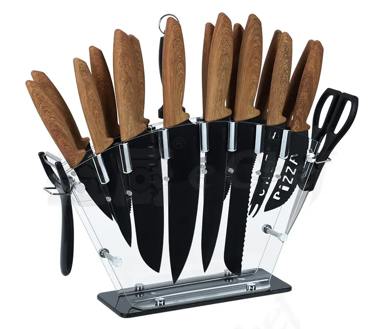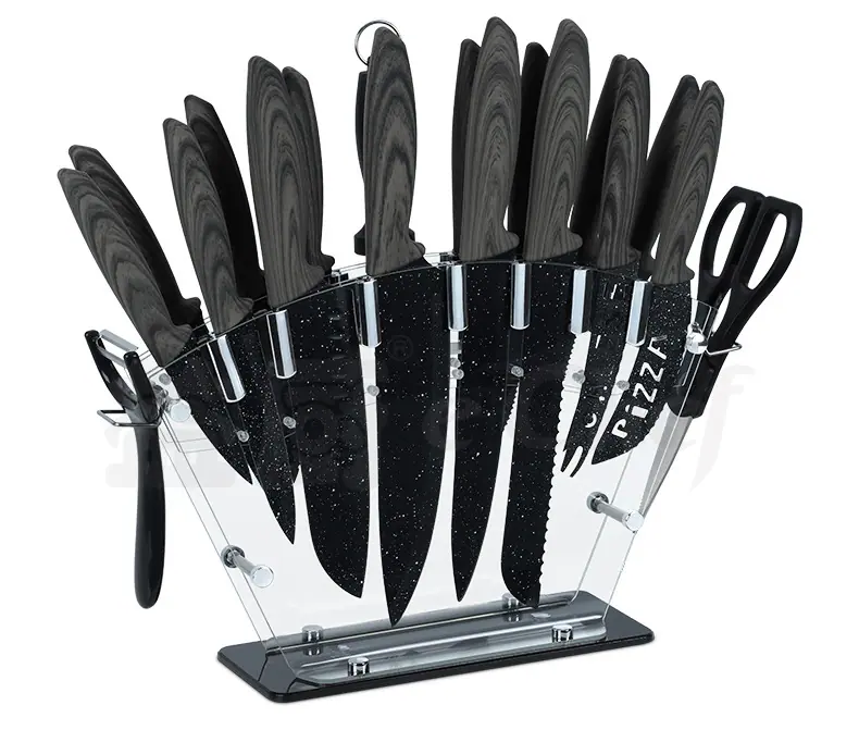 All black 19 piece knife set, Gray wood grain 19-piece knife set, Yellow wood grain 19-piece knife set