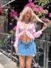 Camiseta de manga larga con cuello en V y volantes de gasa, sexy, color rosa, para mujer, estilo transfronterizo europeo y americano.