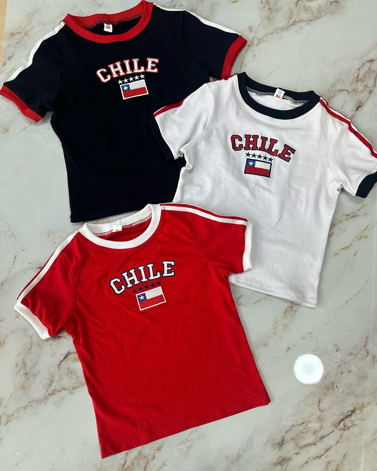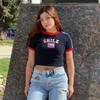 Camiseta de manga corta versátil de moda para chicas atractivas con bordado de letras de bandera nueva de Europa y América Y2K transfronterizas para mujeres