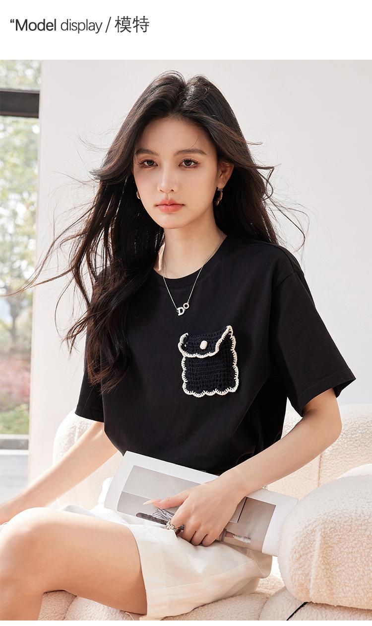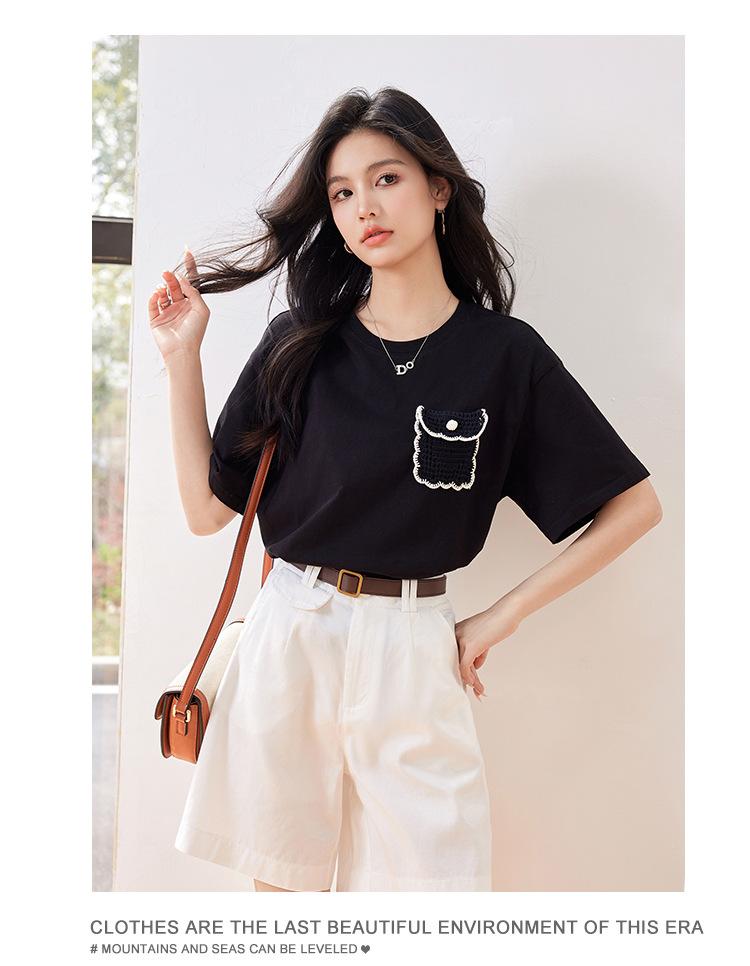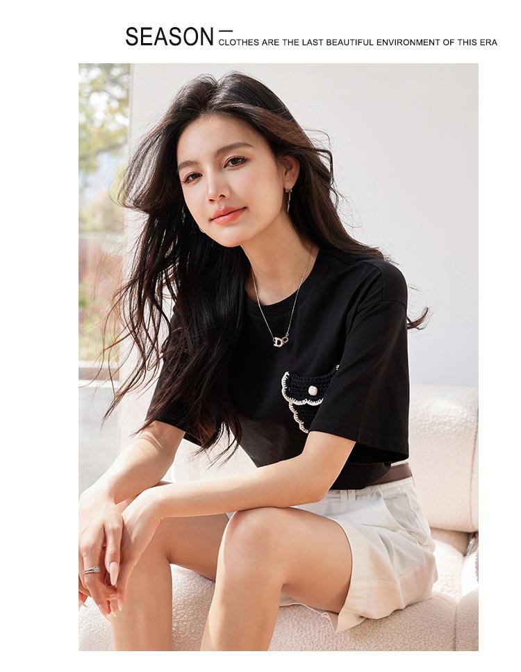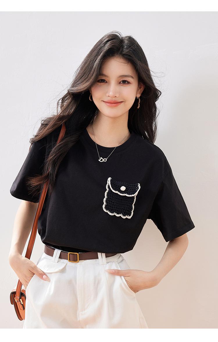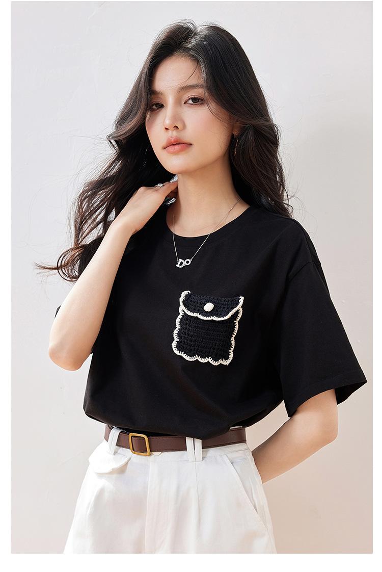 Camiseta de manga corta de crochet tridimensional para mujer, novedad de verano 2024, estilo coreano, elegante, con bolsillo y cuello redondo