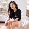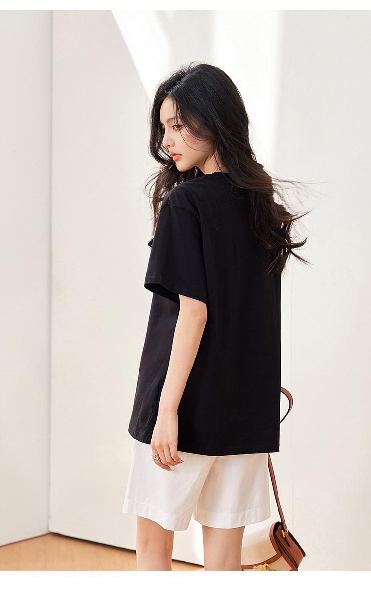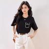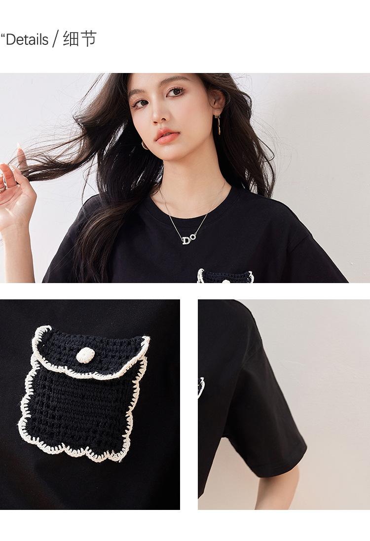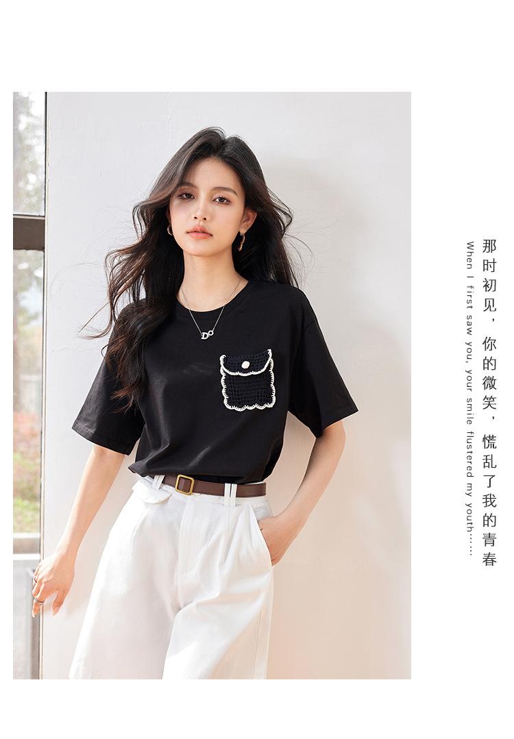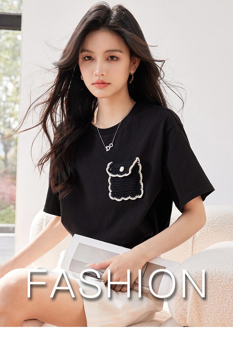 Camiseta de manga corta de crochet tridimensional para mujer, novedad de verano 2024, estilo coreano, elegante, con bolsillo y cuello redondo