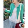 Chaqueta tipo cárdigan de punto con costuras de encaje verde menta fresca para mujer, suéter apilado de primavera y otoño, top blanco superúnico